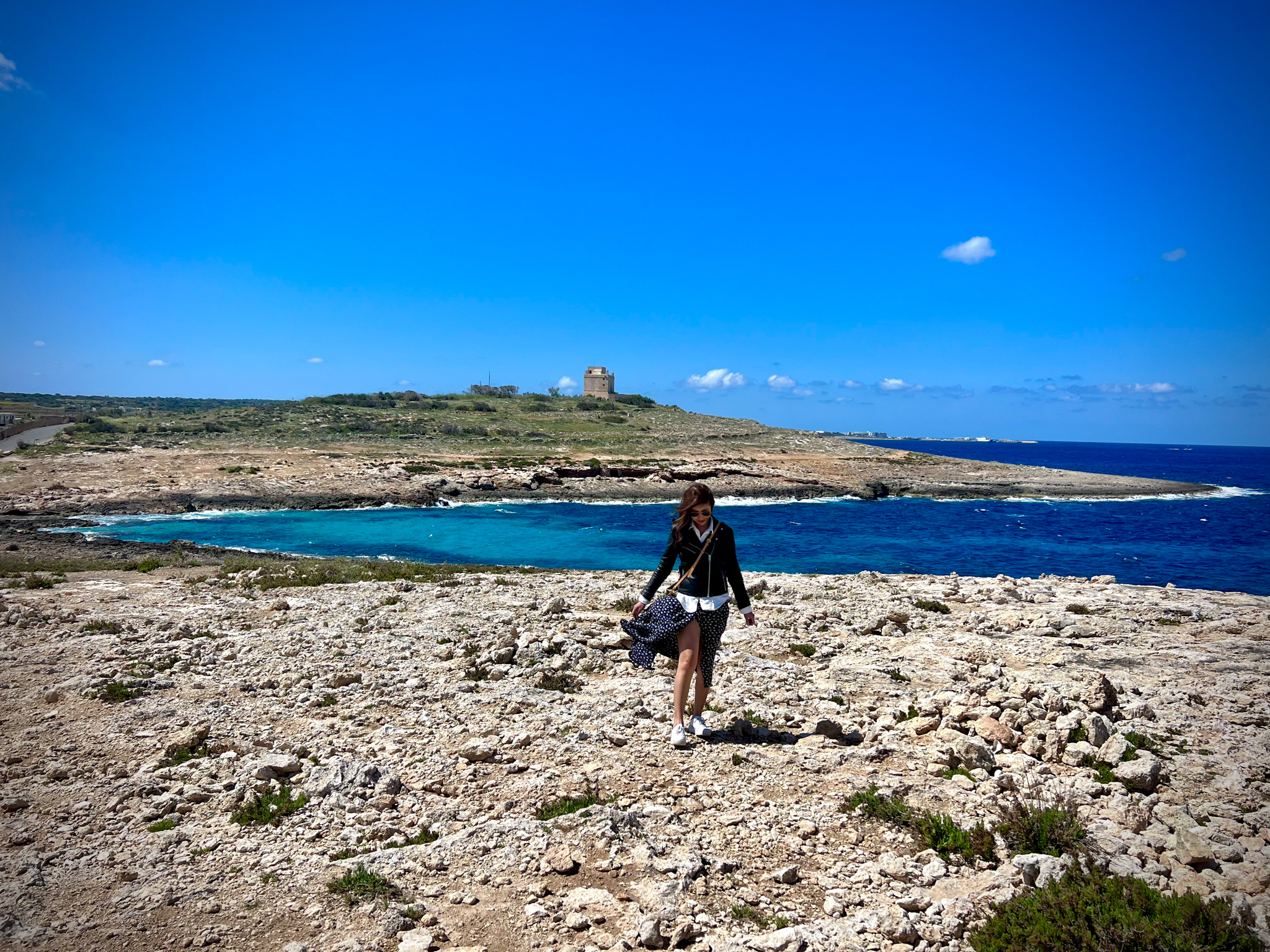 On arrive au niveau de la plage de Bajja tal-Qroll où l’on gare la voiture, on est vraiment au bout de l’île ici, on ne peut pas rouler plus en avant. On part à la découverte d’une plage sauvage à l’eau très bleue mais tellement agitée par le vent qui souffle très fort.