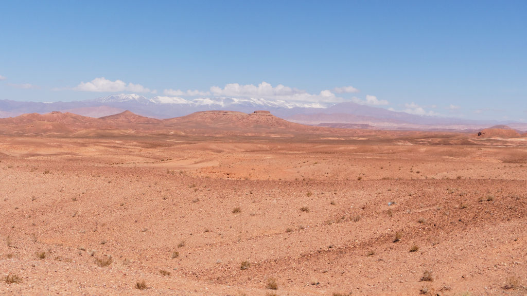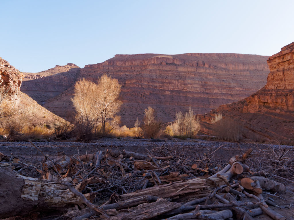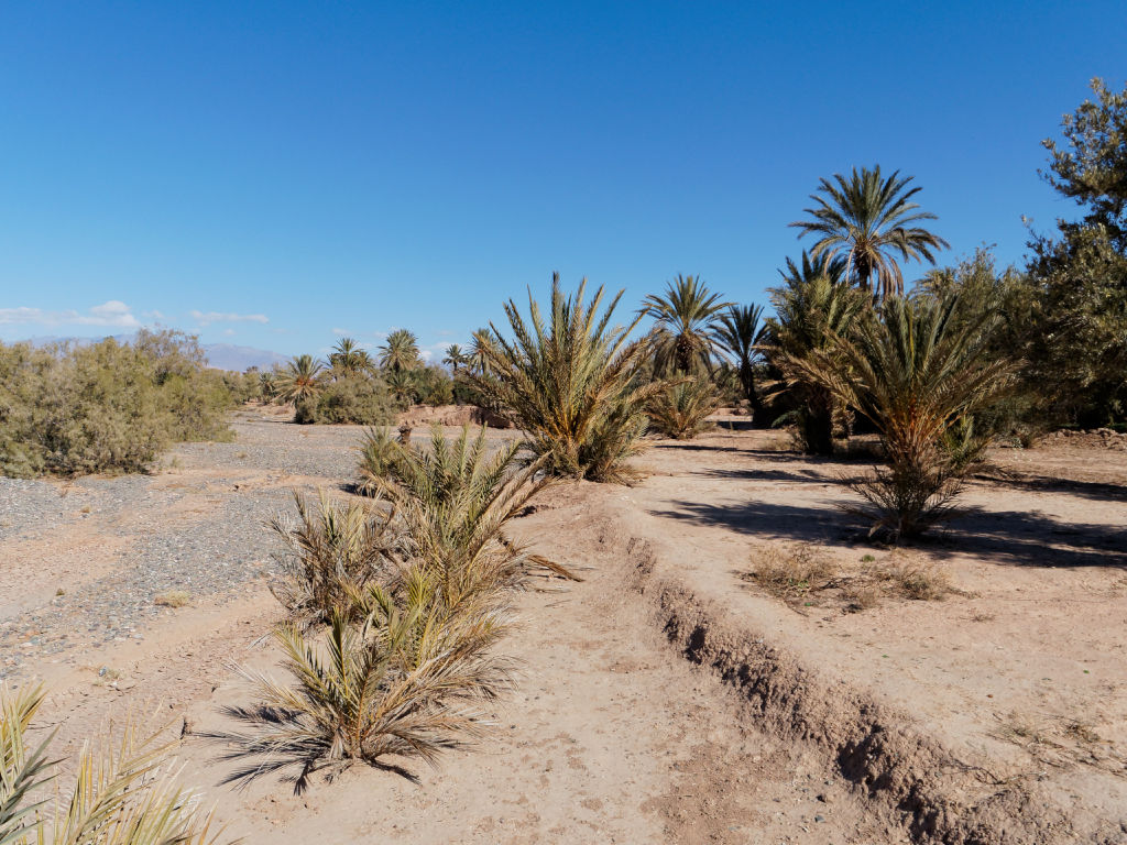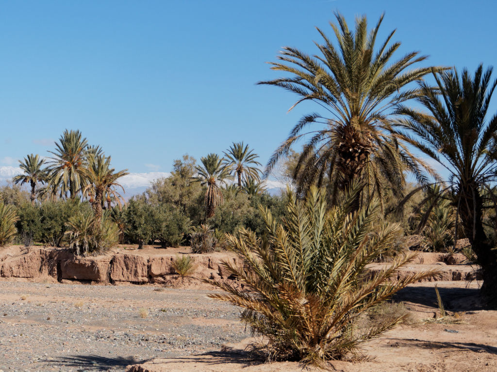 Le lendemain matin, je profite d’une belle matinée ensoleillée pour refaire un tour dans la palmeraie, mais en voiture cette fois pour la parcourir en longueur, et traverser les oueds asséchés. Les points de vue sont superbes, d’autant plus qu’il a neigé sur les sommets de l’Atlas cette nuit. Ensuite je pars en direction des Gorges du Dadès pour une visite dans cette vallée aux couleurs ocres incroyables.