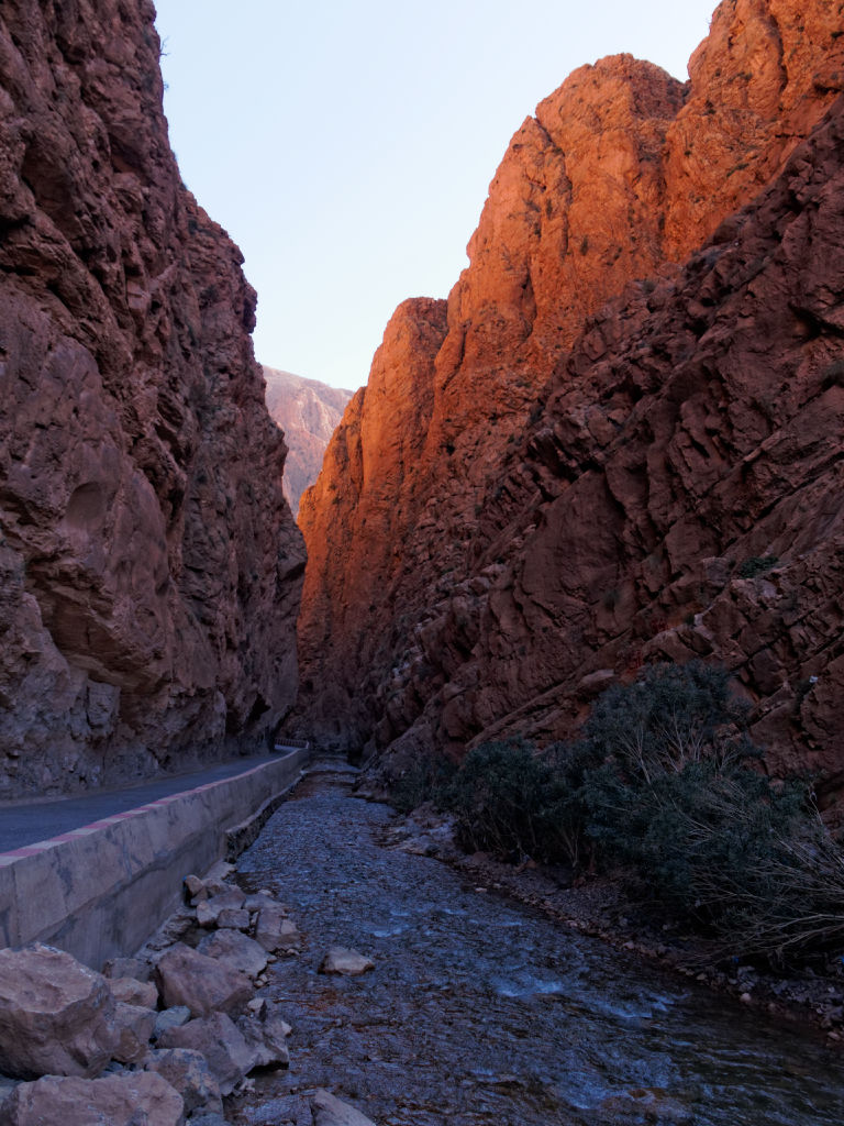 On retraverse la Dades et on passe une zone en cours de travaux. Les éboulements ont défoncé la route et elle est en cours de reconstruction, on passe vraiment au bord de la rivière, la lumière est douce, les couleurs captivantes.