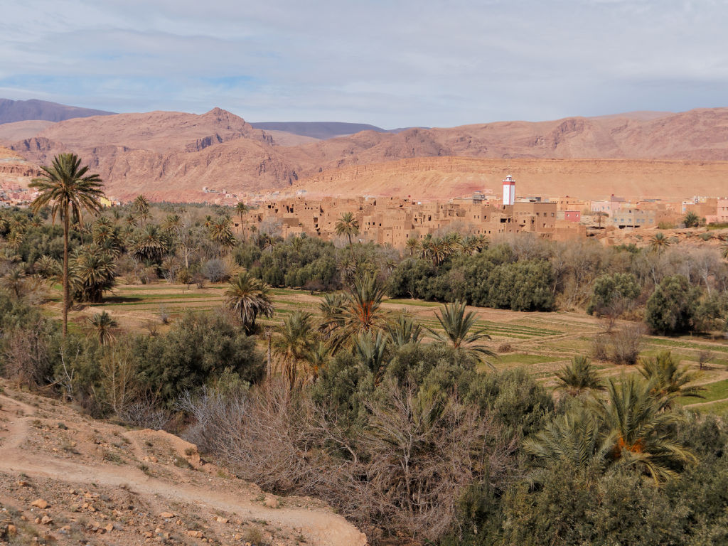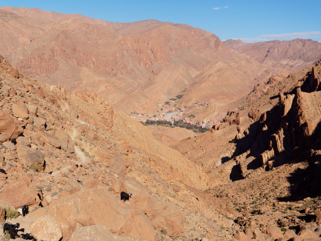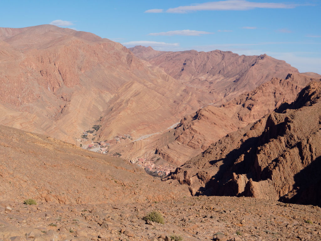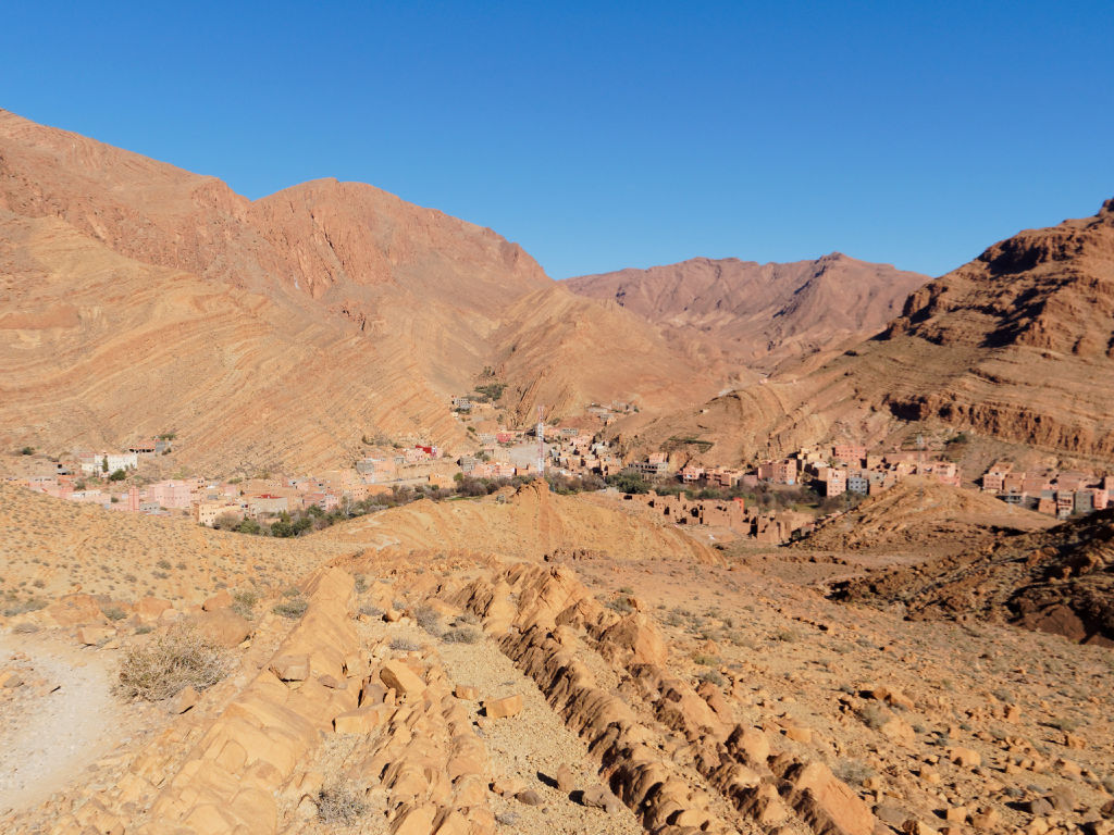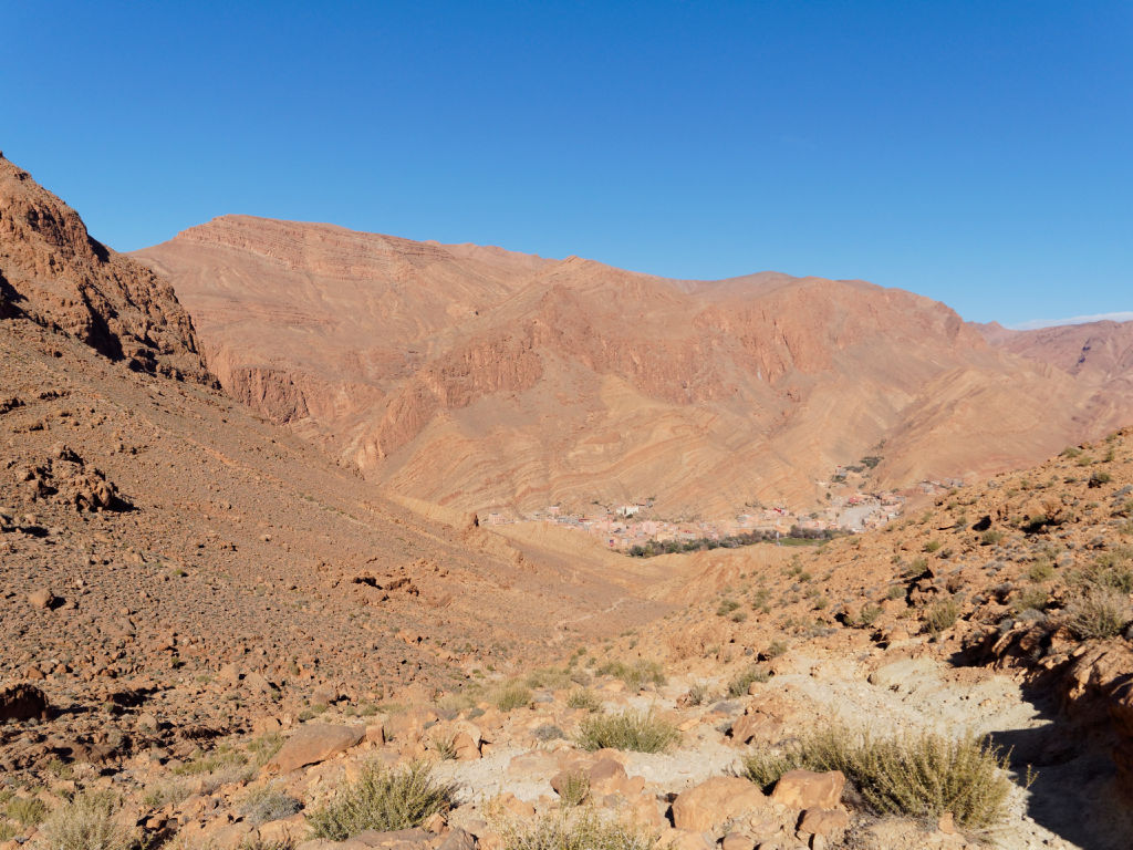 Au contraire, le chemin bifurque vers le Sud afin de contourner les gorges du Todhra et revenir vers le village au pied des gorges, au loin la palmeraie de Tinghir.