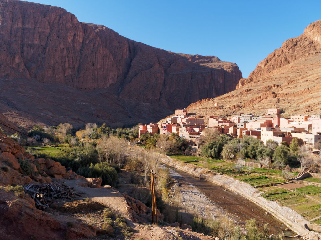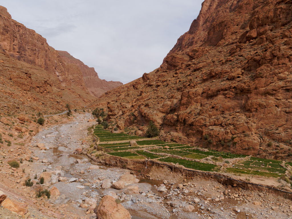 En contrebas il y a un pont de bois, ce qui me ramène au pied des gorges du Todhra. La boucle m’a pris un peu plus de 2h30 jusqu’à la route, puis encore 1h pour remonter tranquillement la route vers la voiture garée de l’autre côté tout en discutant avec un villageois qui se promenait après sa journée de travail. On retraverse ensemble les gorges qui ne sont plus directement éclairées.