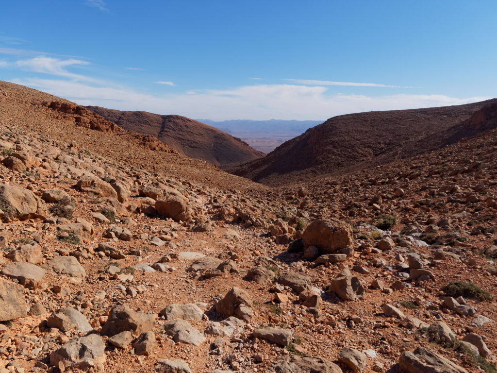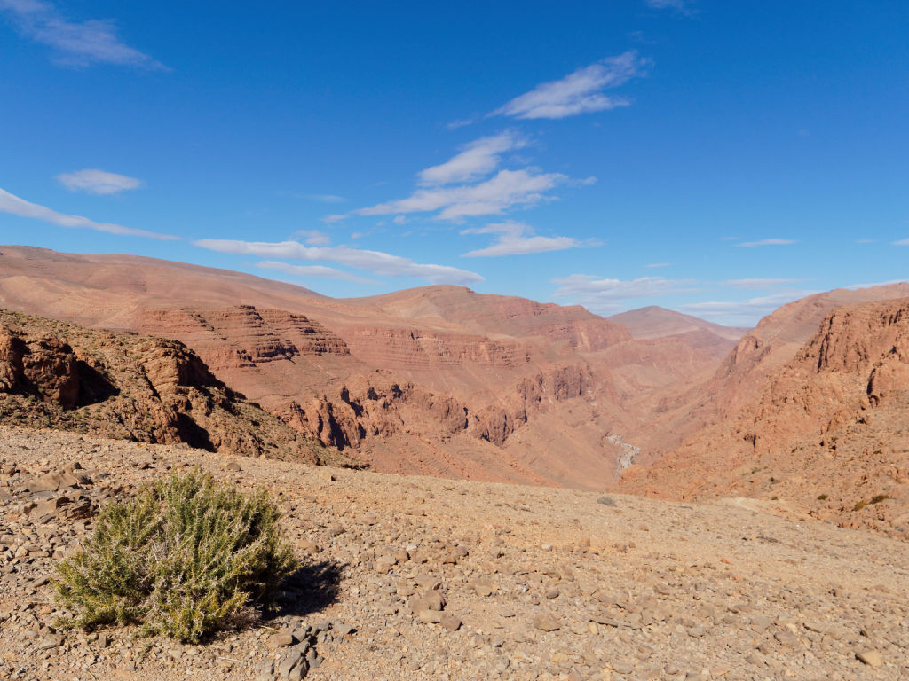 Comme la veille, je prends la route qui remonte le Dades, puis après Boulmanes, je continue tout droit direction Tinghir. Le paysage sur le bord de route est lunaire, les montagnes au loin comme souvent dans la région arborent différentes bandes de teinte pastel. Au Sud, le massif du Djebel Saghro. Pas un arbre dans le coin, pas pratique si on a une envie pressante de faire pipi ?