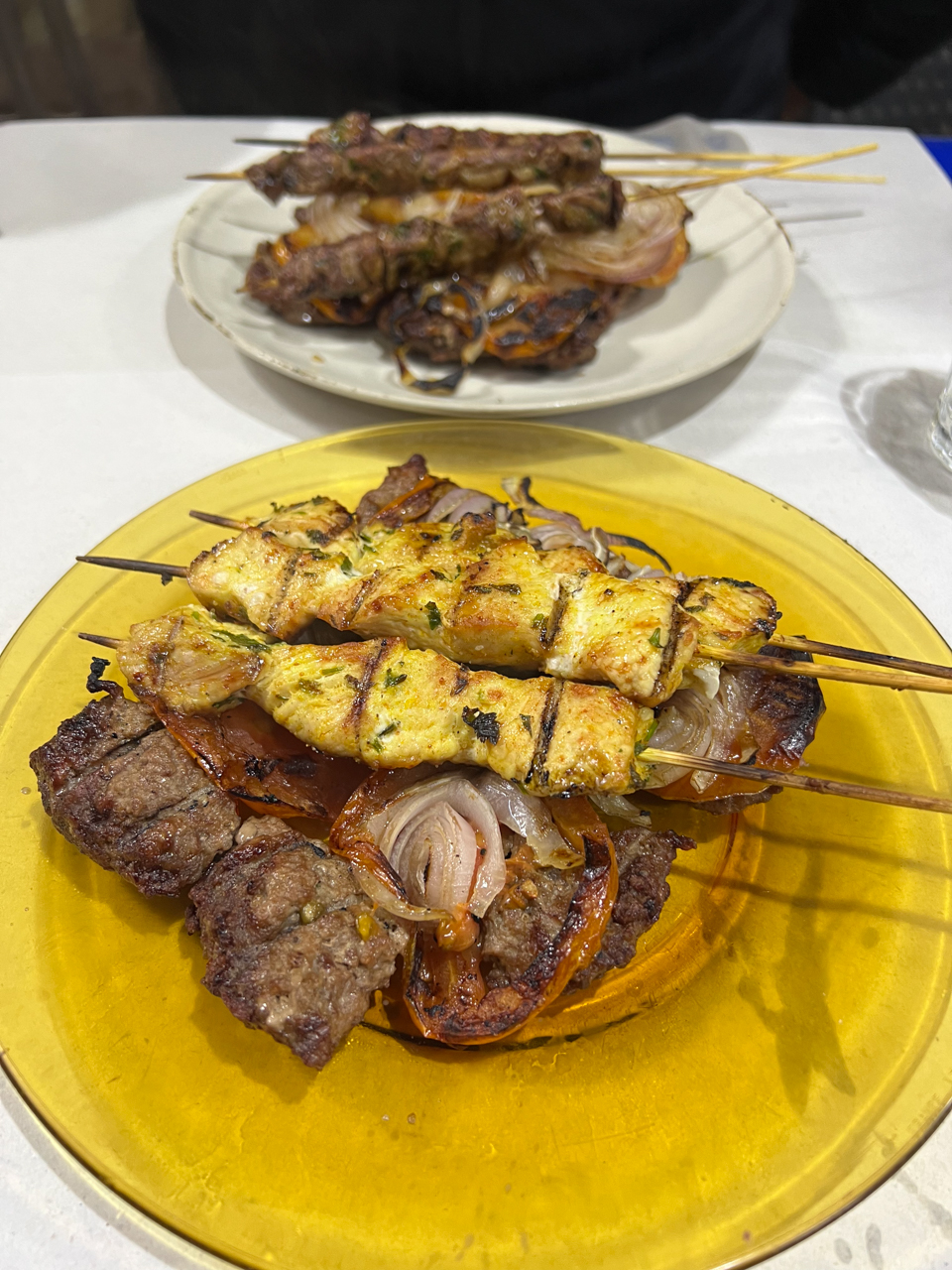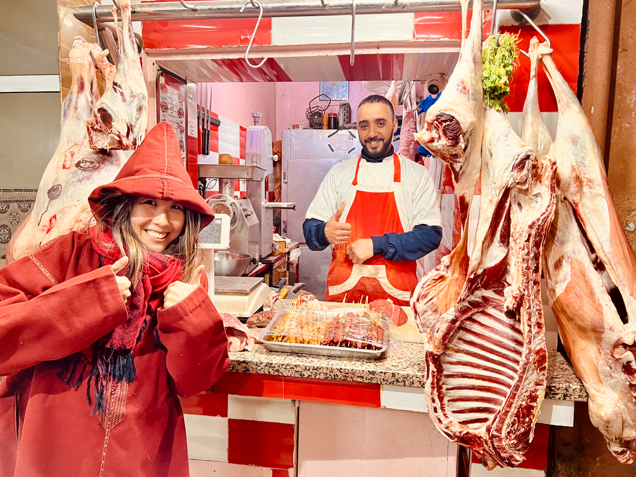 Nous n’avions pas décidé où dormir cette nuit, on voulait voir si on était capable d’avancer un peu en direction d’Agadir, car il y a plus de 5 heures de route et on ne veut pas le faire d’une seule traite le lendemain. En fait, Ai Benhaddou était un peu un détour pour nous, mais j’avais envie de montrer ce monument célèbre du Maroc à ma copine. Comme nous avons encore de l’énergie, on se dit que l’on va couper la route et dormir à Taliouine, à peu près au milieu du chemin. On a un peu faim, mais on roule encore une heure pour rejoindre la ville de Tazenakht au croisement de la route du Sud et celle d’Agadir. Lorsque nous étions passé dans l’après midi, j’avais repéré des restaurants sur le bord de la route. Car oui on fait un détour en fait, mais on est quand même ravi d’avoir poussé jusqu’ici. C’est un peu le fil rouge de notre voyage au Maroc finalement, déjà que l’on avait failli ne pas partir et tout annuler au dernier moment à cause d’une maladie, on a organisé un planning au jour le jour en fonction de nos envie et notre énergie. Je ne sais pas si c’est le climat ou l’excitation d’être de nouveaux en voyage, mais je sens que je récupère un peu plus chaque jour, il faut donc en profiter. Après une heure, on arrive à Tazenakht avec le ventre vide. Tazenakht est le genre de ville qui n’est pas dans les guides touristiques, c’est un bourg carrefour entre deux nationales mais qui n’a pas d’attractions notables qui attirent les voyageurs. Par contre, je trouve que c’est typiquement dans ce genre d’endroits que l’on va bien manger sans se prendre la tête. Ma chérie a remis sa djellaba depuis qu’il fait froid, et elle sort dans la rue avec sa capuche en pointe sur la tête. Les gens lui sourit avec surprise et tendresse. On trouve un restaurant ou un boucher on ne sait pas trop, qui fait des brochettes. On lui commande plusieurs plats dont des grillades, omelettes, soupe et on se régale. Les gens sont vraiment très gentils avec nous et ils nous font découvrir des plats que l’on ne connait pas, et on peut affirmer que l’on mange vraiment bien au Maroc.