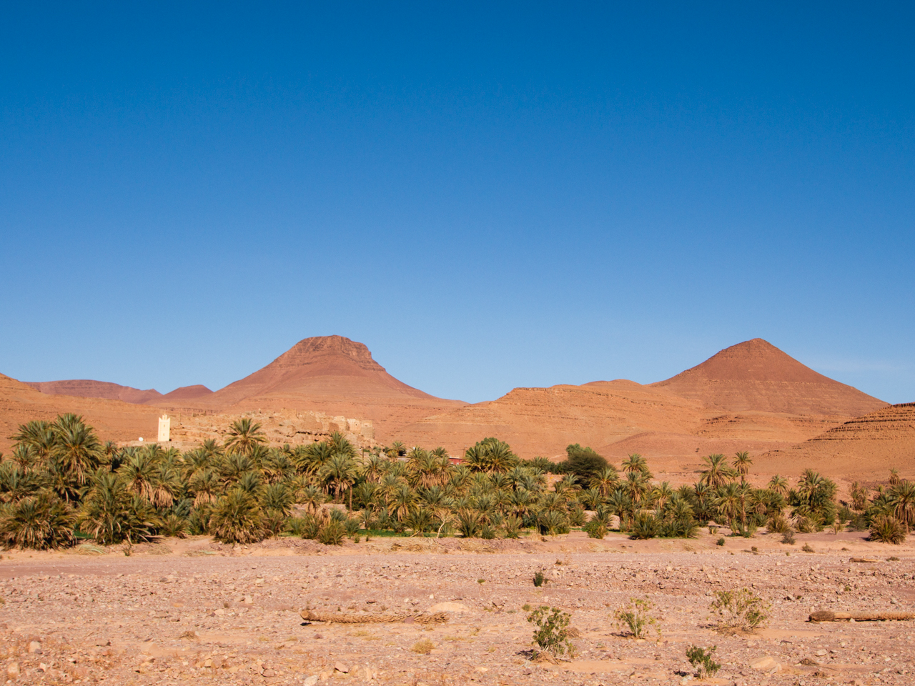 On traverse des villages qui semblent endormis, tout aussi vides que l’oued qui coule dans la vallée, et pourtant en regardant de plus près, il y a des gens qui vivent dans ces villages, les palmeraies sont bien vertes.