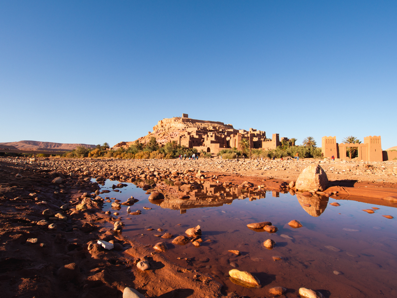 On gare la voiture sur le parking de l’hôtel La Kasbah. Un monsieur nous demande si nous sommes clients, et puisque ce n’est pas le cas, nous réclame 10 dirhams. Je ne sais pas si c’est normal ou pas, mais bon on donne une pièce en espérant qu’il jette un oeil à la voiture. Depuis le parking, on descend le long d’un chemin avec des boutiques de souvenirs jusqu’au niveau de la rivière. On est au pied de la kasbah qui est encore plus impressionnante depuis ici.