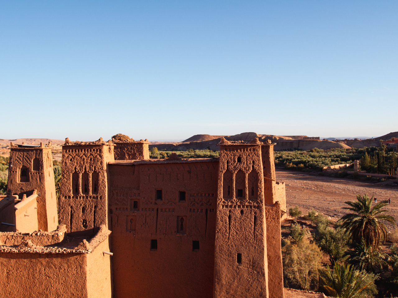 Il est possible de pénétrer dans Ait Benhaddou par le lit de la rivière en passant par les différentes portes qui donnent sur la palmeraie. Certaines sont gardées par des vendeurs de tickets qui jouent sur l’ambiguïté de la gratuité du site (on peut accéder gratuitement au site depuis le pont un peu plus haut dans le village) et l’entrée payante à des maisons fortifiées du village payantes. Comme nous sommes entrés par une des maisons fortifiées, nous avons du payer l’entrée. Un guide nous amène au sommet de la maison, d’où on a une vue sur les tourelles décorées. C’est très beau, mais fragile. Les édifices sont faits en terre et en paille, si il pleut, il faut venir entretenir pour éviter qu’il s’effondre.