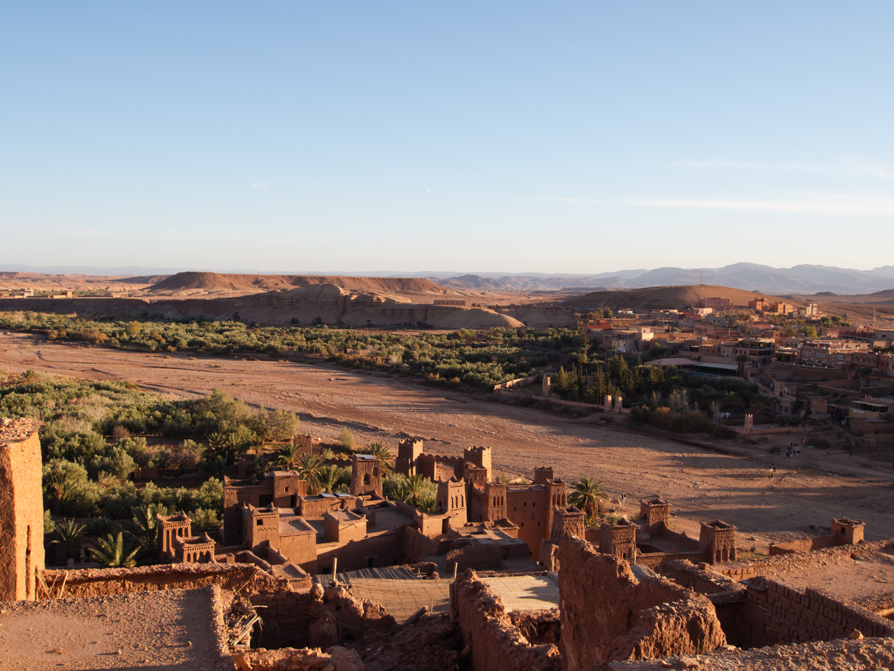 Depuis le grenier fortifié qui se site tout au haut du village. On a une vue panoramique sur les toits Le village s’intègre parfaitement dans son environnement naturel, c’est ce que fait la beauté du site d’Ait Benhaddou.