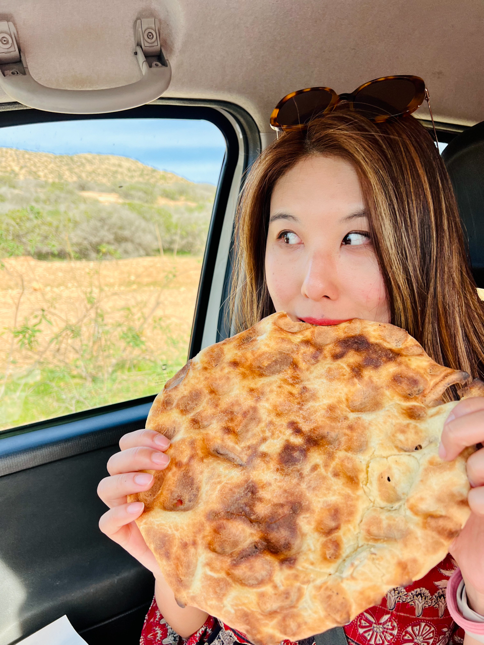 On s’arrête sur le bord de la route pour acheter un pain pour notre gouter. Pour quelques dirhams on se retrouve avec deux immenses galettes qui sortent du four, un régal.