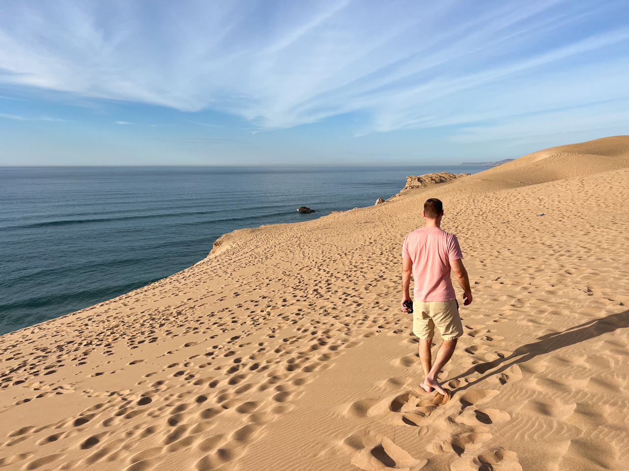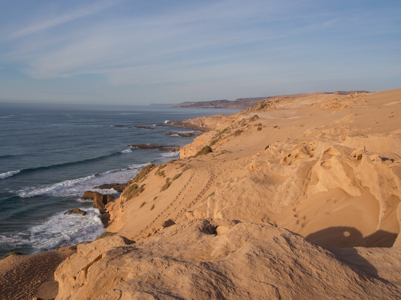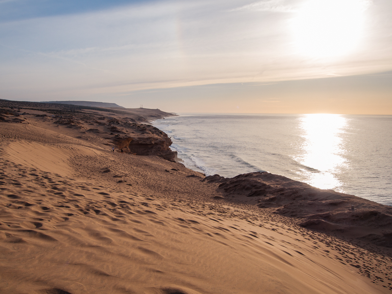 On arrive à la dernière étape de notre sortie du jour, aux dunes de Timlalin, à quelques kilomètres au Nord de Tamri. Ici le désert rencontre l’océan. On peut se garer juste au pied des dunes et marcher jusqu’au bord des falaises. C’est un paysage vraiment étonnant.