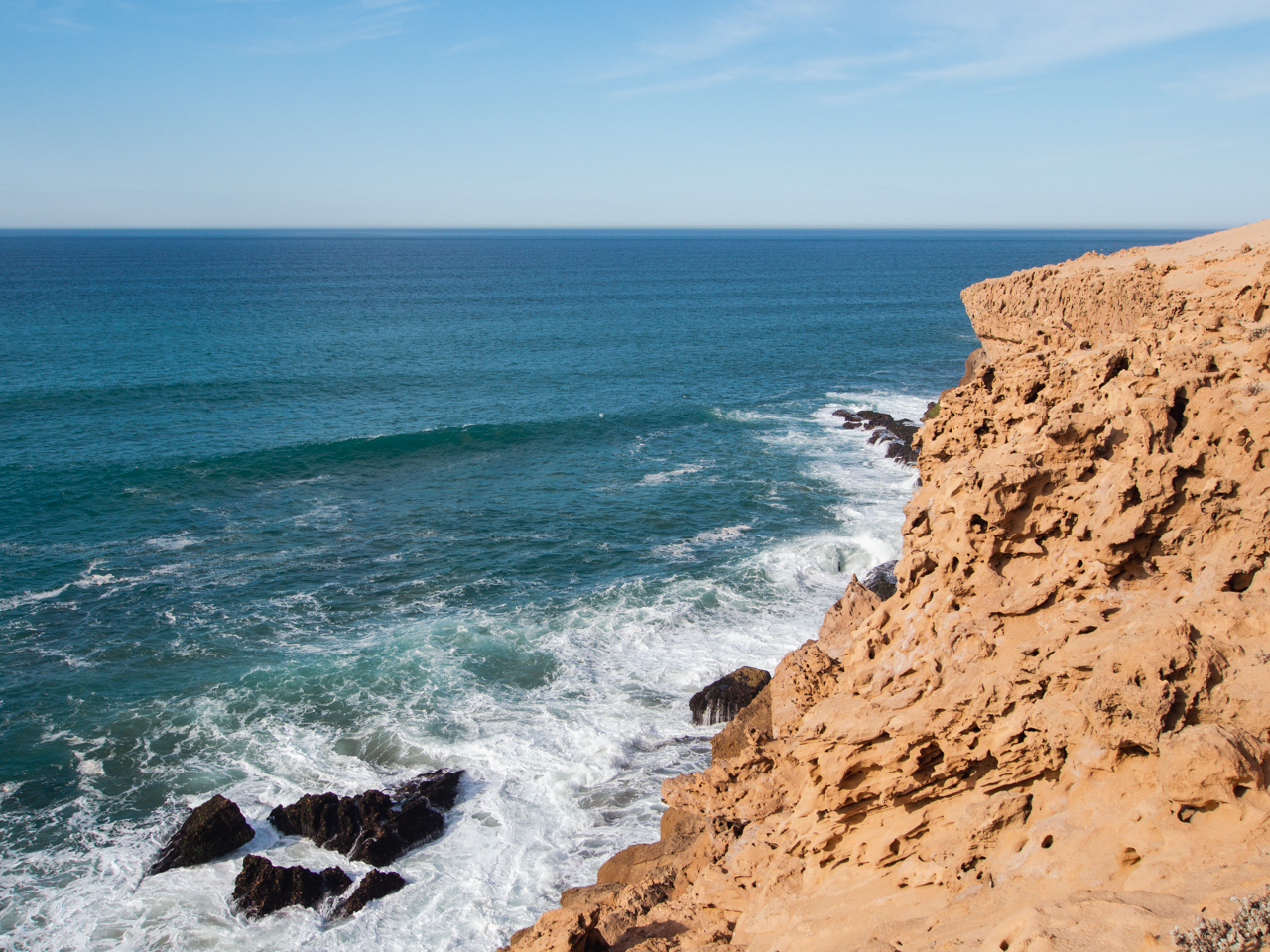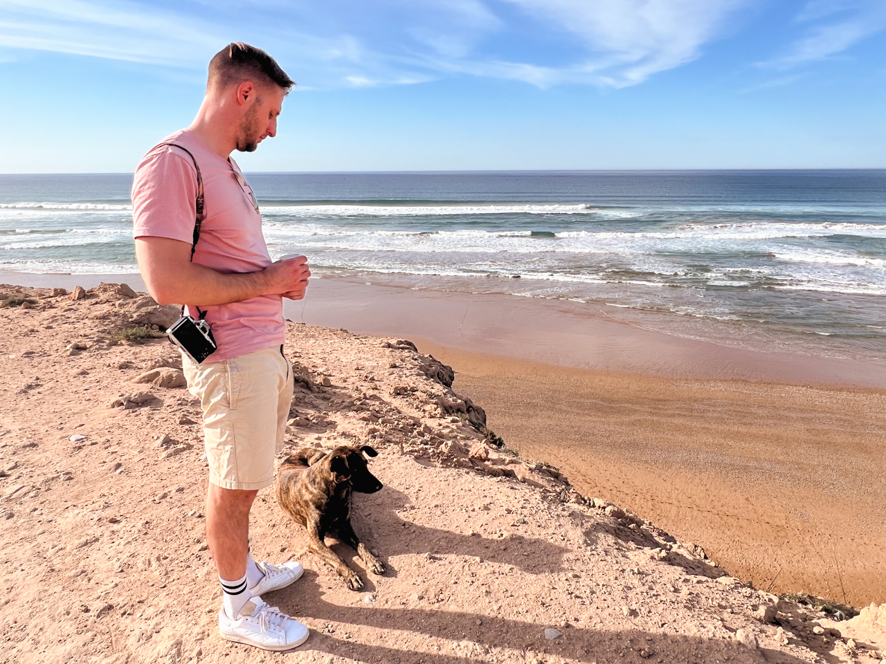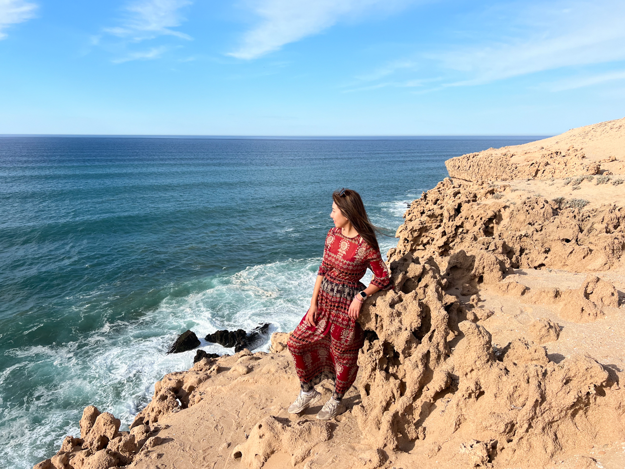 On arrive à la dernière étape de notre sortie du jour, aux dunes de Timlalin, à quelques kilomètres au Nord de Tamri. Ici le désert rencontre l’océan. On peut se garer juste au pied des dunes et marcher jusqu’au bord des falaises. C’est un paysage vraiment étonnant.