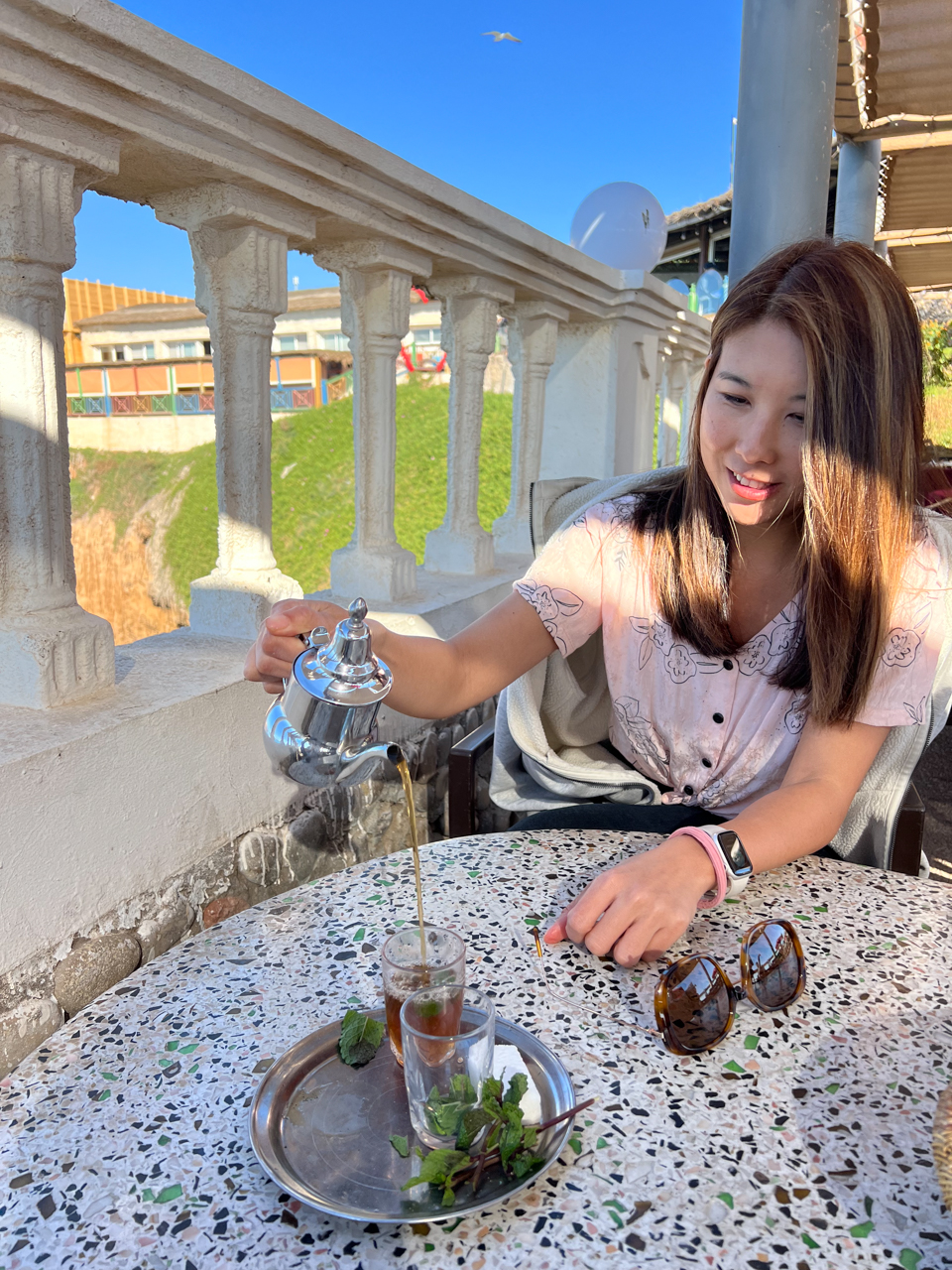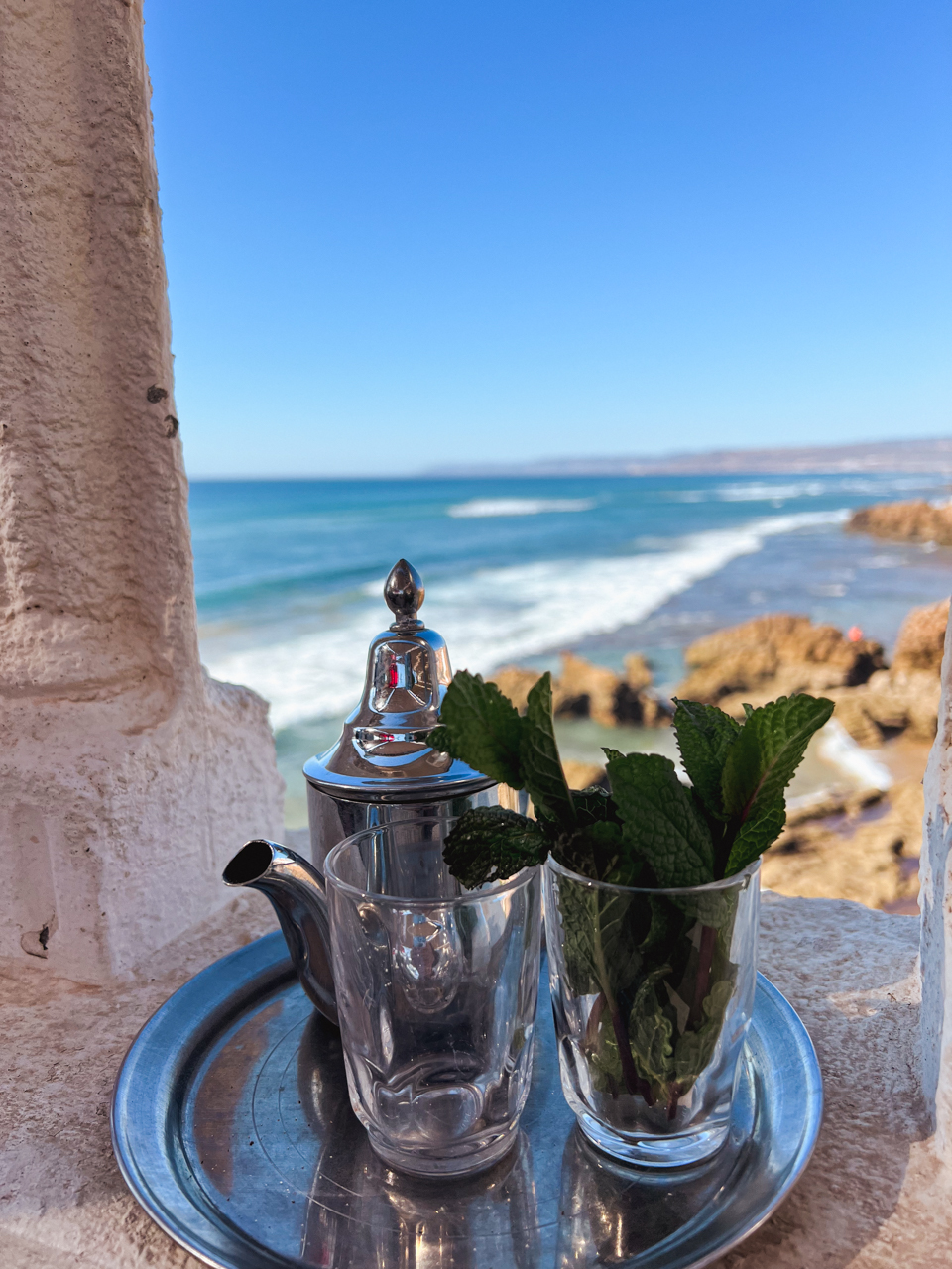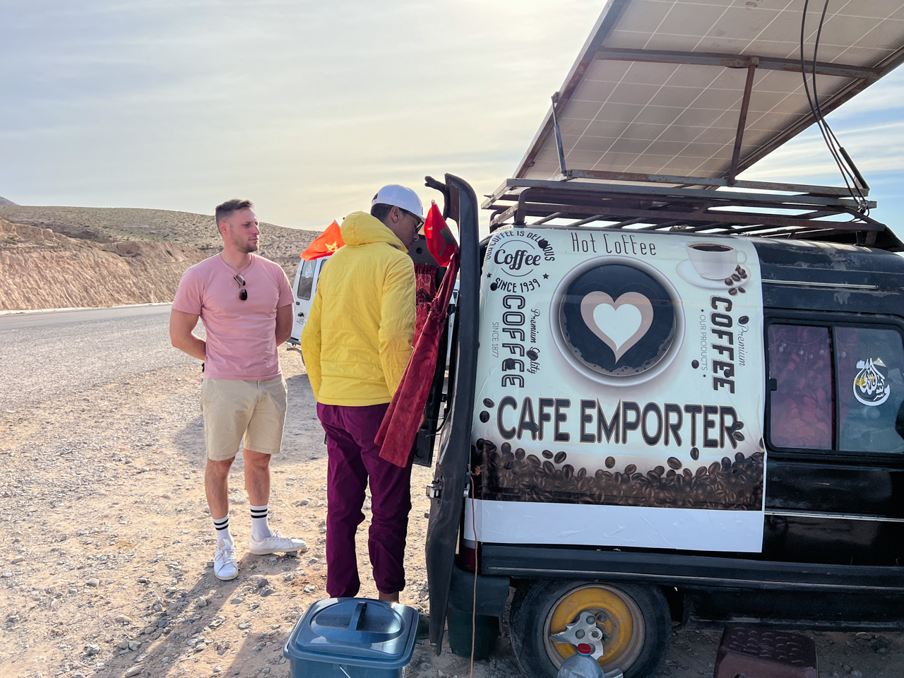 Il n’y a pas d’aire de repos sur la Nationale 1 au Maroc mais il y a des vendeurs de café qui ont installé une machine dans leur coffre. Une de ces voiture est garée à côté d’un magnifique point de vue sur la plage de Tamri, Je me commande un café pour le boire face à la vue.