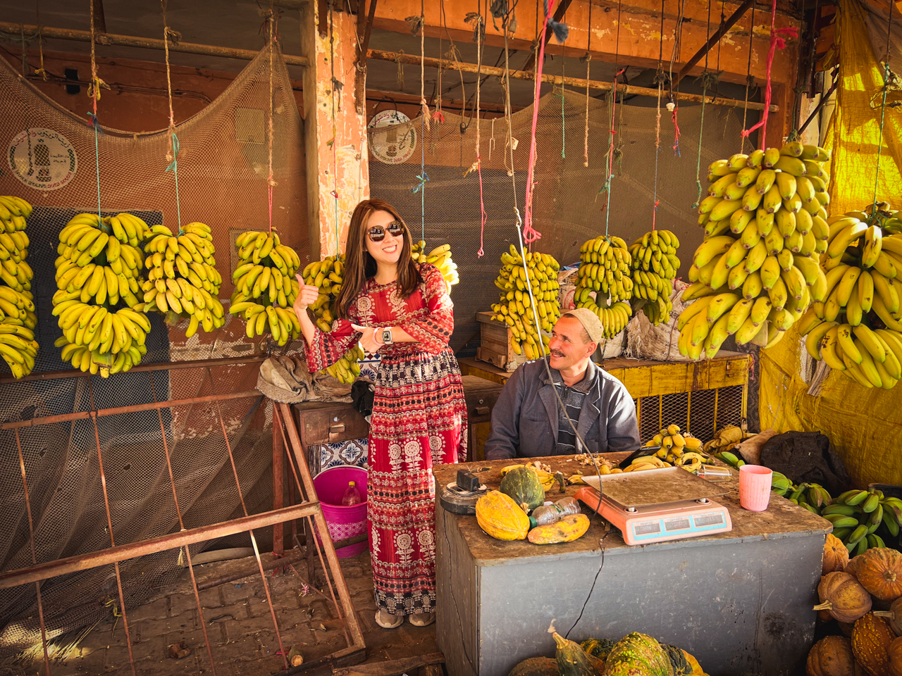 On arrive au niveau du village de Tamri, la capitale de la banane. Il y a en effet un grande bananeraie à l’entrée du village et dans la rue principale, c’est une enfilade de vendeurs de banane. On se laisse tenter et on prend un kilo avec nous pour compléter notre gouter.
