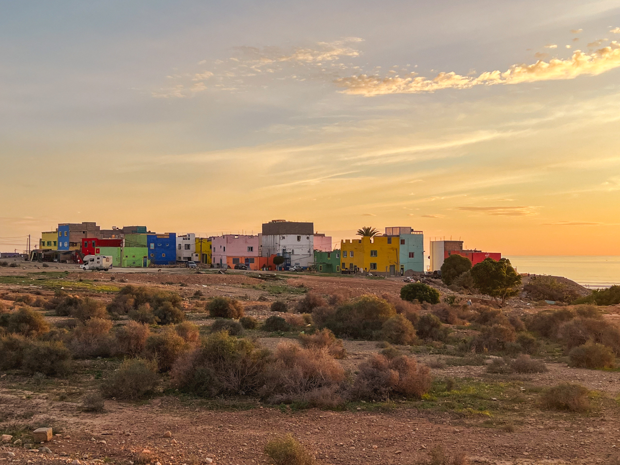On retourne sur nos pas pour le diner de nouvel an à Taghazout. Sur le retour, on croise de nombreux groupes de jeunes qui viennent pour passer la soirée sur les dunes. L’endroit est effectivement particulièrement propice pour ce genre. En chemin, on croise de petits village très mignons, comme celui-ci qui est tout coloré.
