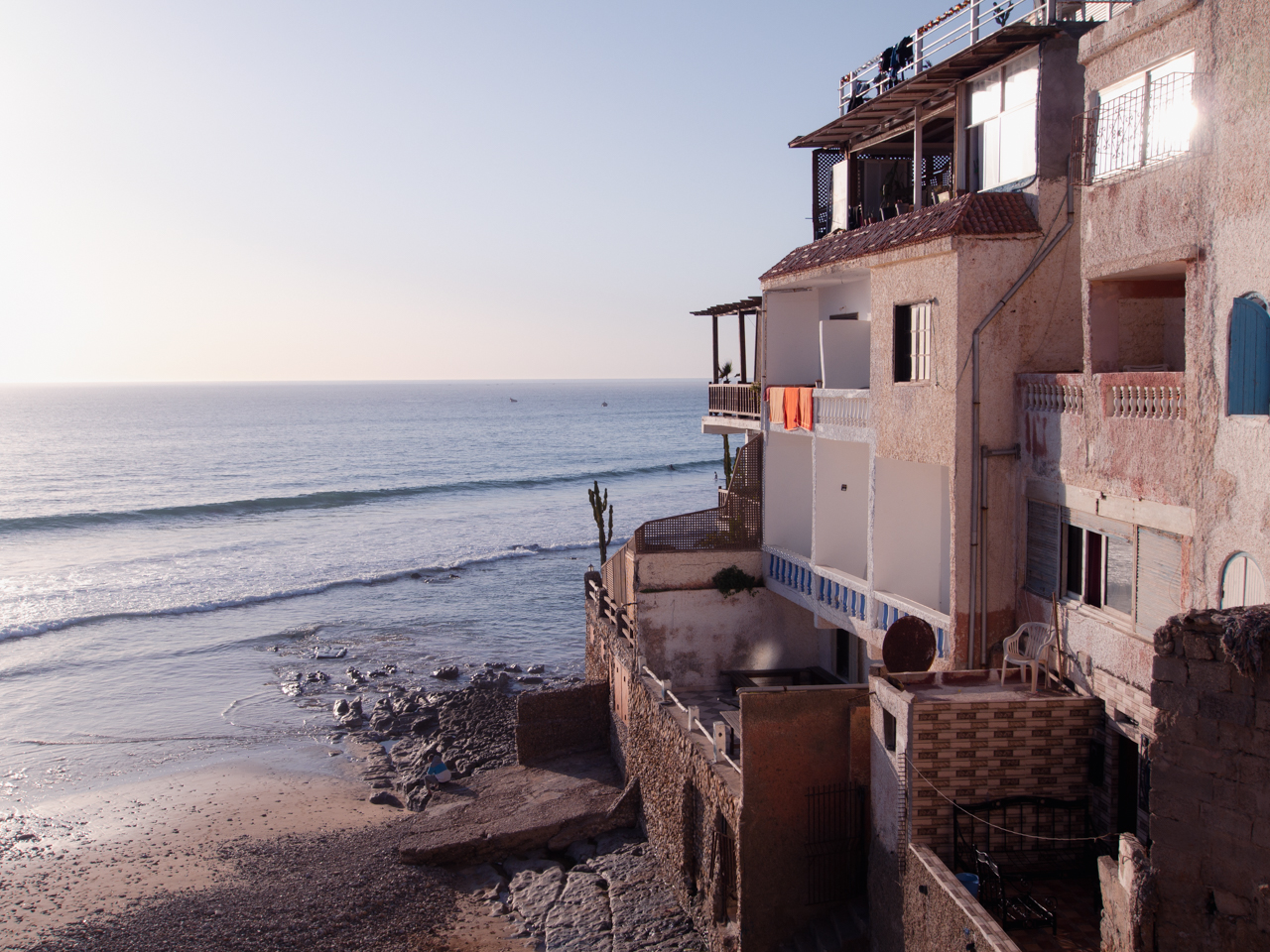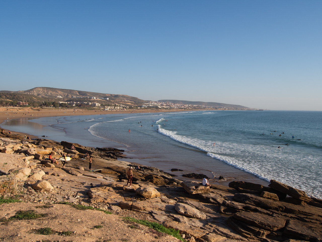 Tout au bout de la plage, il y a plusieurs restaurants qui ont une vue sur toute la baie de Taghazout, là où sont dorénavant alignés tous les hôtels de luxe.