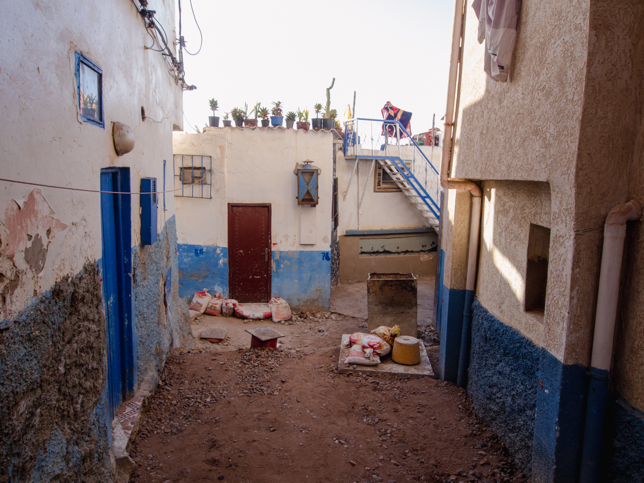 Les ruelles sont en travaux, mais on remarque un effort dans la décoration du village, avec ces couleurs bleu et blanc, les cactus sur la terrasse, il y a une certaine ambiance à Taghazout.