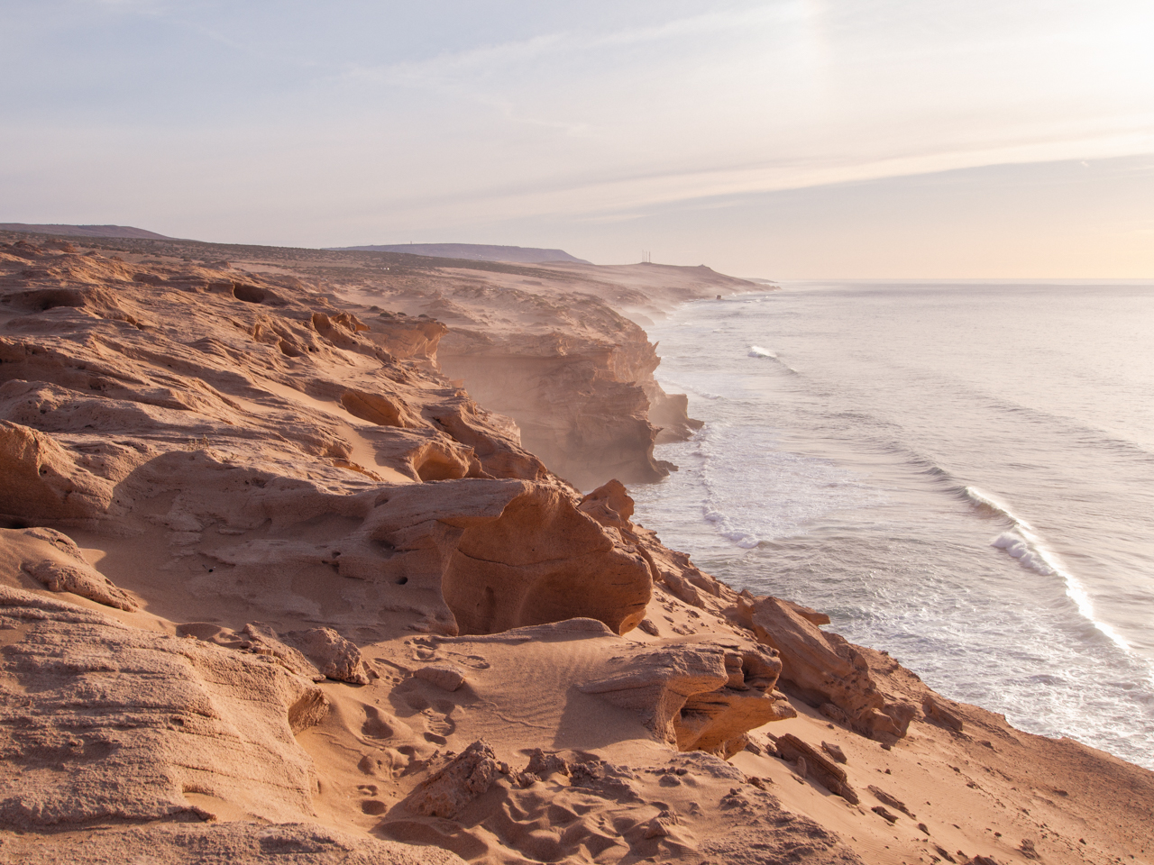 Les falaises de sable plongent dans l’océan, une brume vient voiler le ciel, ce qui semble très fréquent dans la région.