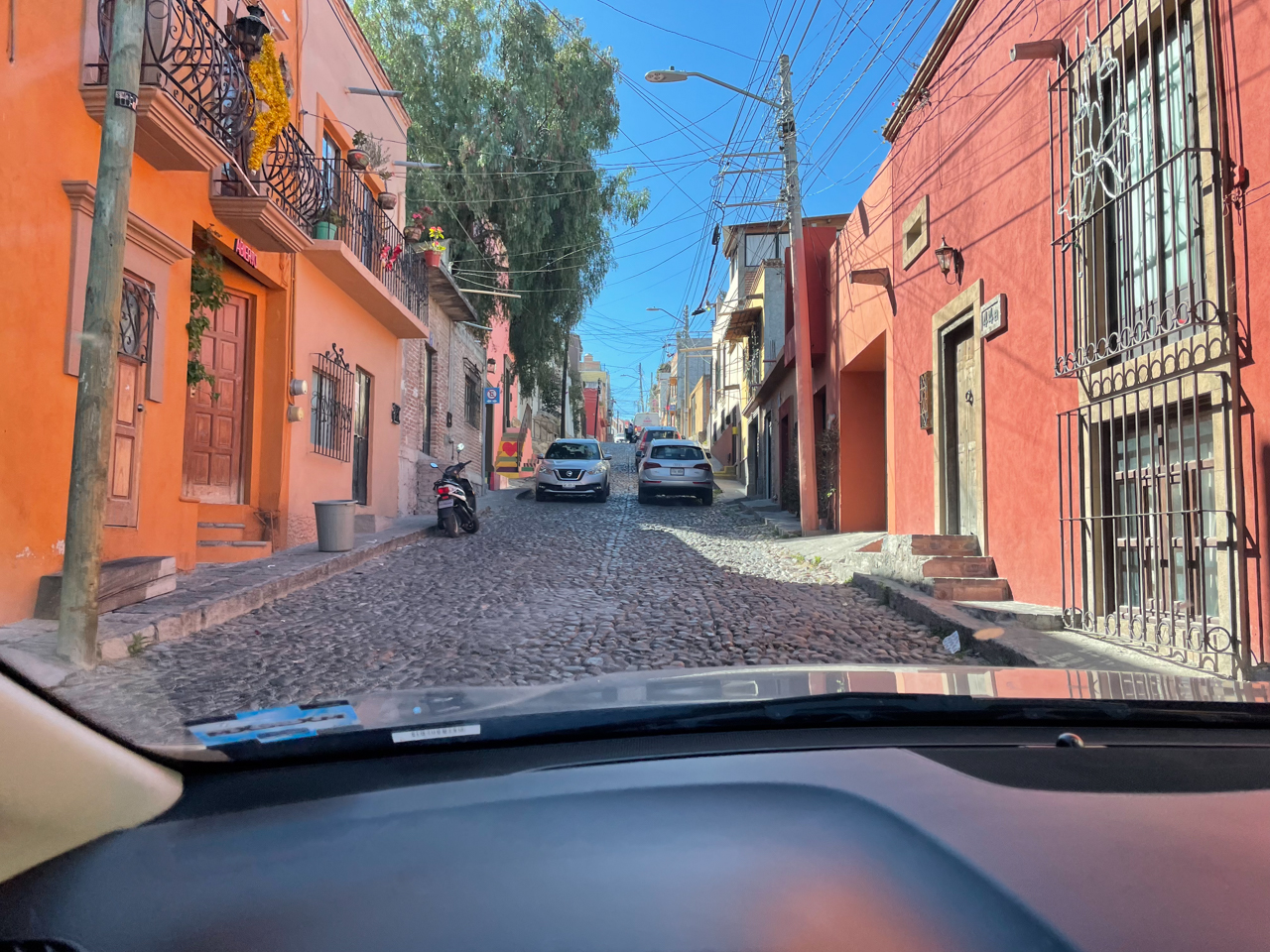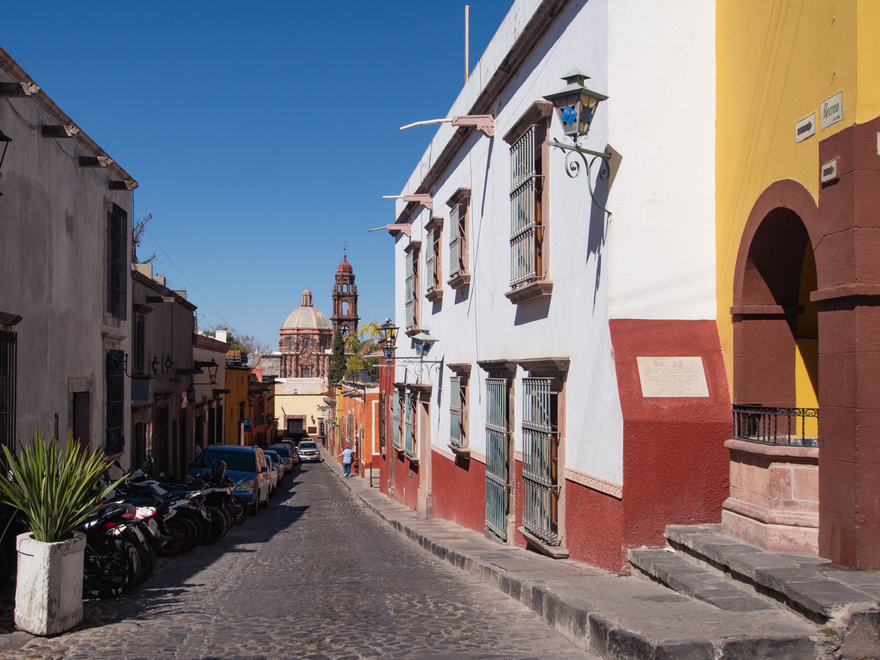 On continue la visite de la ville en revenant sur nos pas. Je roule dans les ruelles de San Miguel de Allende et cela demande une certaine dextérité car les routes ne sont pas larges du tout, et surtout il faut démarrer en côte sur les pavés glissants, faire des virages de 90 degrés aux intersections. Bref, à recommander seulement aux plus motivés et expérimentés.