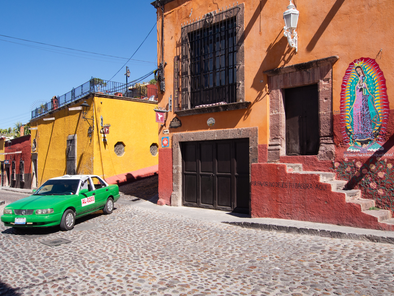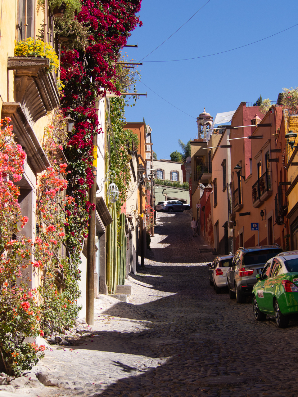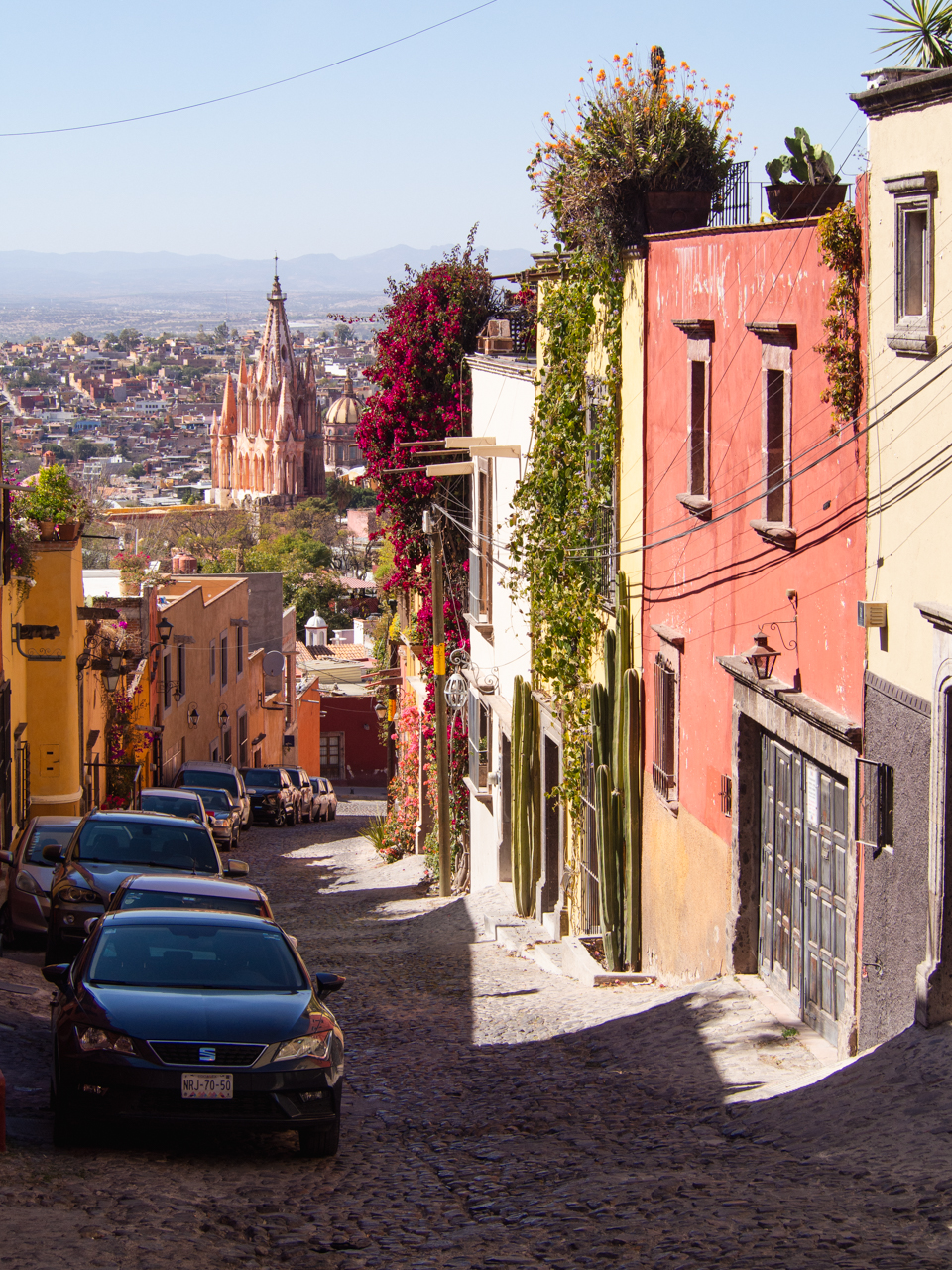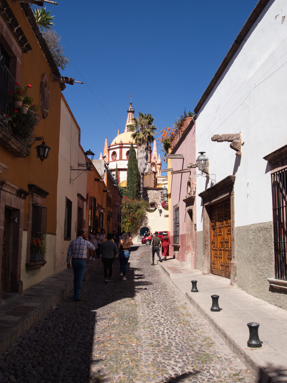 Je laisse la voiture se reposer pendant mon séjour à San Miguel et je continue à pieds. La ville recèle de nombreuses ruelles toutes plus belles les unes que les autres. C’est vraiment superbe, une explosion de couleurs. La ville qui a une histoire de plus de 400 ans a été un centré économique très important de Nouvelle Espagne, sur la route des mines d’argent.