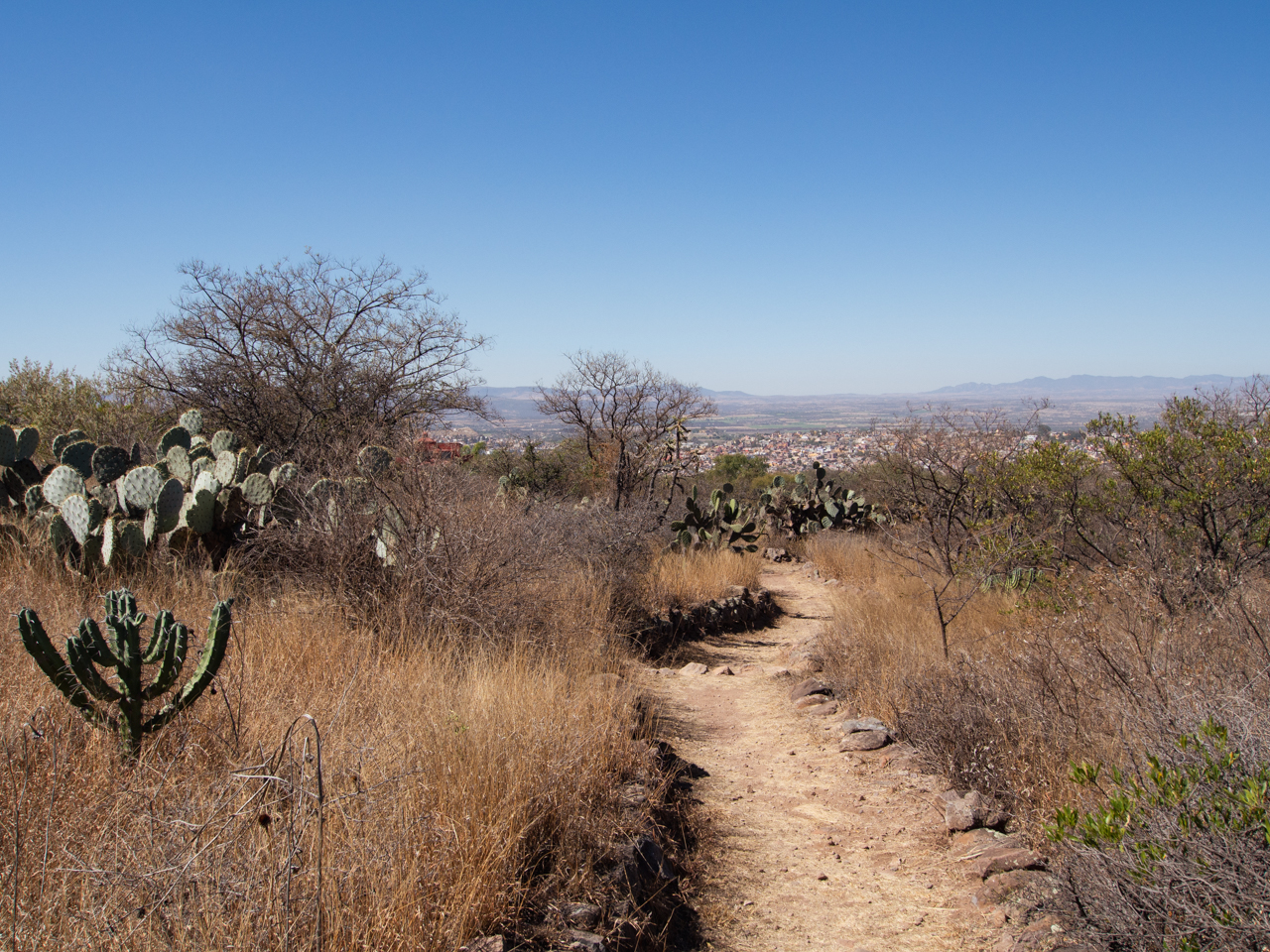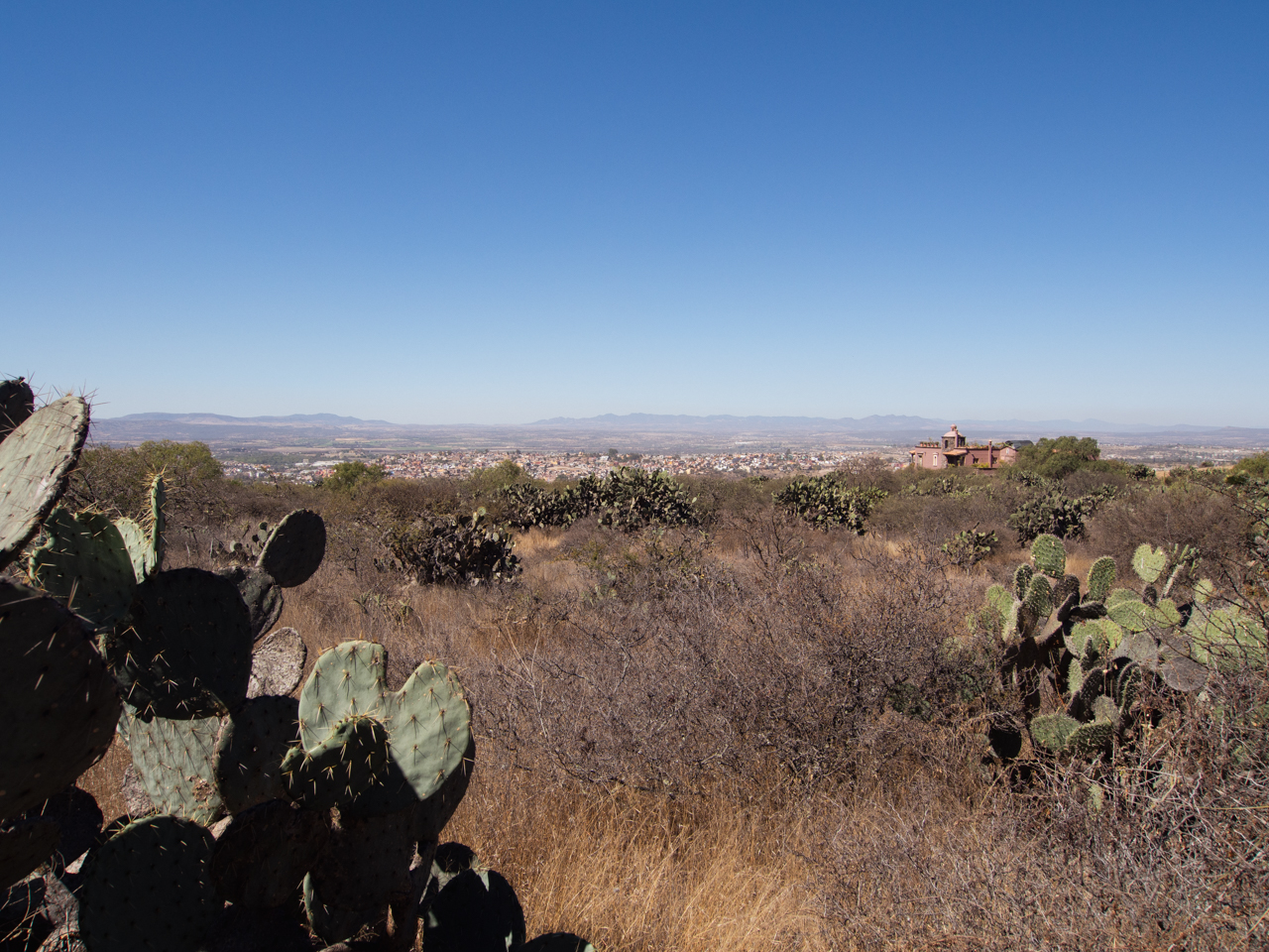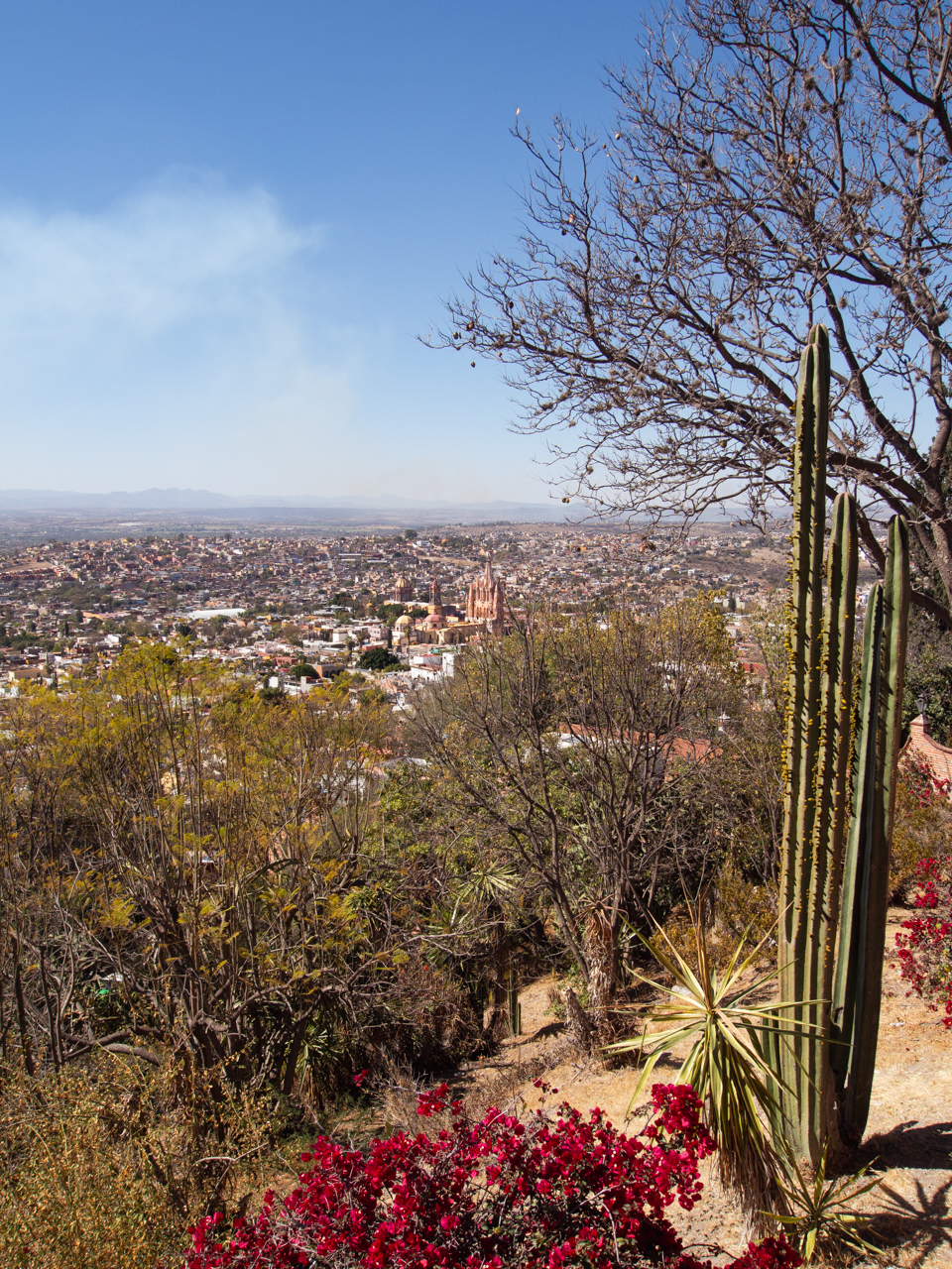 Tout en haut, je tombe sur un jardin avec de nombreux cactus puis au-dessus une esplanade qui où sont installés des bancs. D’ici, on est au sommet de San Miguel de Allende et on embrasse toute la ville.