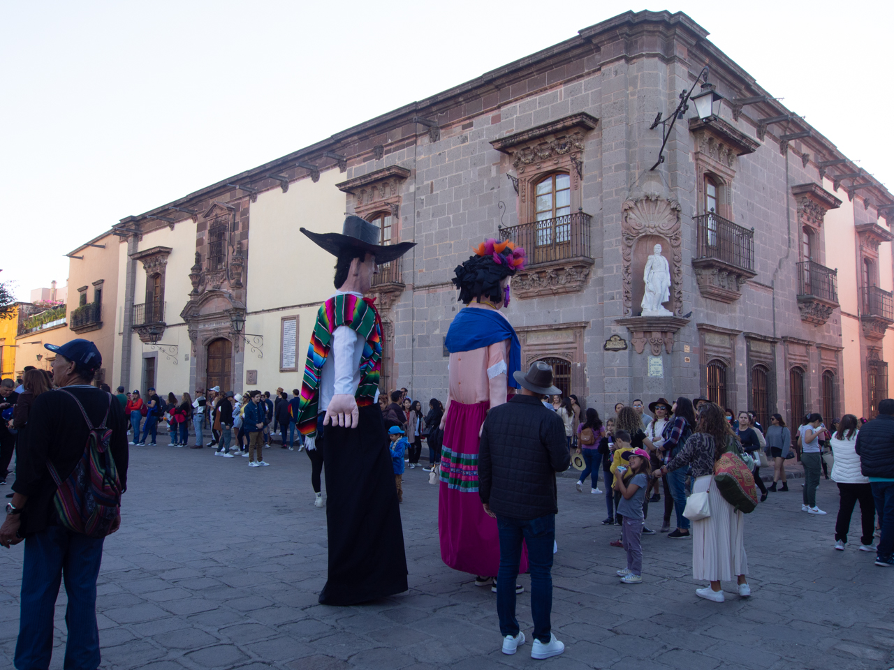 Sur la place principale, deux marionnettes géantes se promènent aussi et les gens veulent se prendre en photo avec cet autre élément de la culture locale.