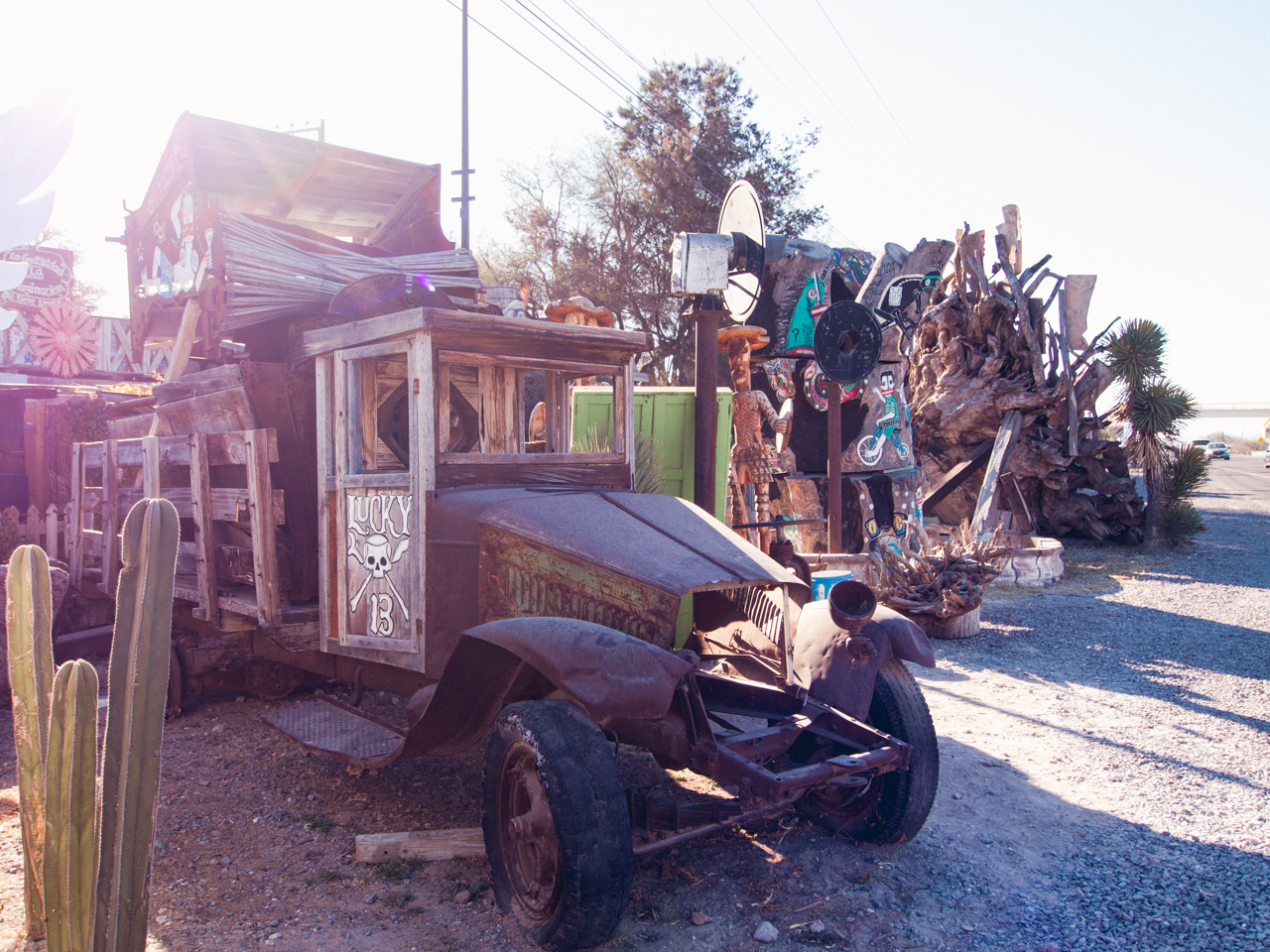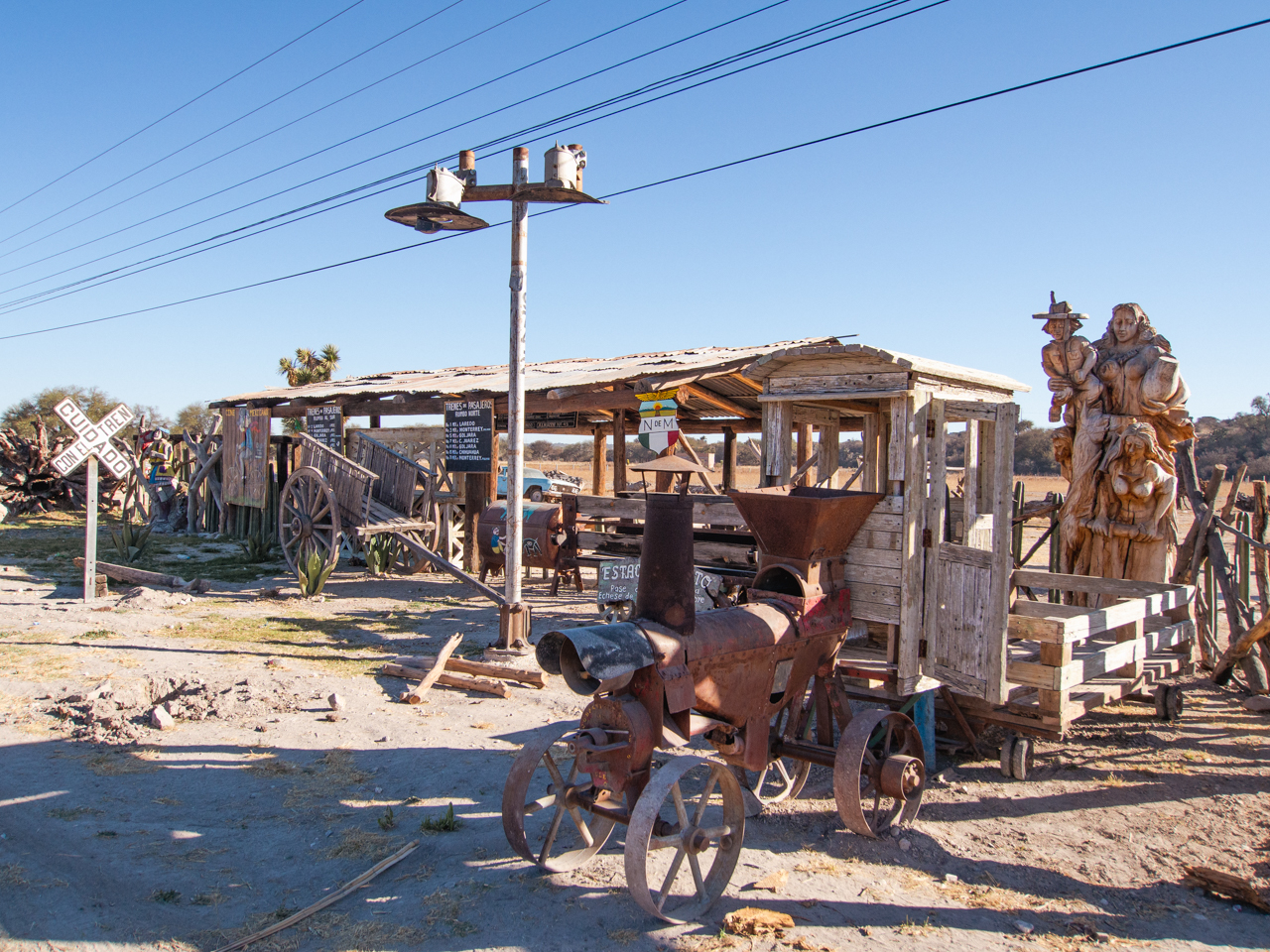 Ce matin, on part découvrir un autre trésor de San Miguel de Allende. En fait, il faut savoir que l’UNESCO a reconnu le centre ville comme patrimoine mondial de l’humanité en associant le Santuario de Jesús Nazareno de Atotonilco, qui se trouve à 14 kilomètres, ou une vingtaine de minutes de voiture. Après le petit déjeuner, je rejoins le village de Atotonilco, mais avant je prends de l’essence dans une petite station. A côté de la station service, je tombe sur des décorations atypiques qui me font m’arrêter et regarder de plus près. Il semble que cela appartient à un parc d’attraction fait de bric et de broc et qui donne une image fantasmée du Far West mexicain. C’est une belle découverte étonnante, un des avantages de voyager en voiture qui fait que l’on peut s’arrêter où l’on veut.
