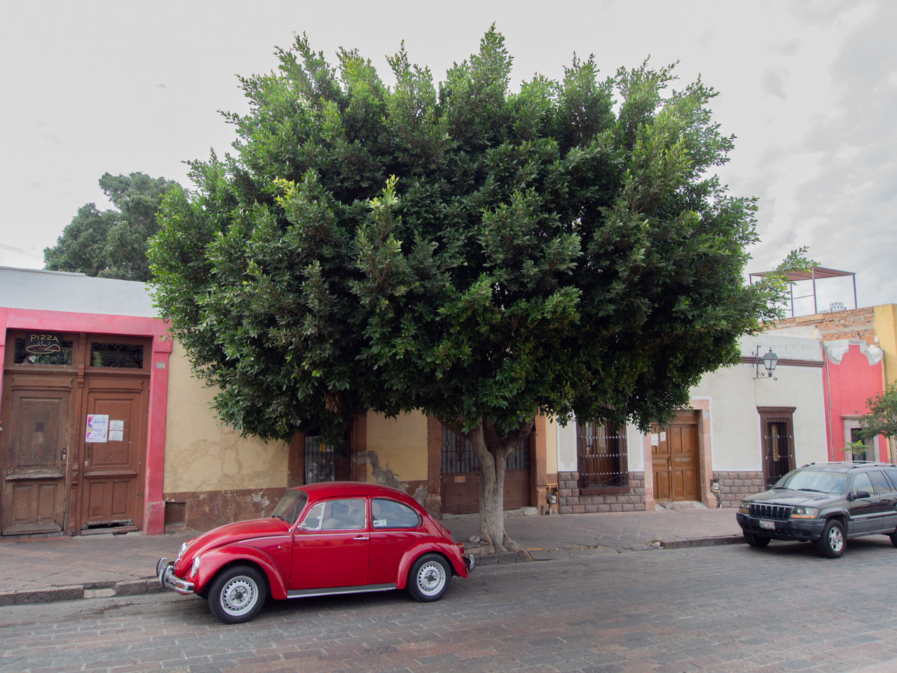 Bel exemplaire de vocho rouge garée sous un bel arbre dans le centre ville de Santiago de Queretaro.
