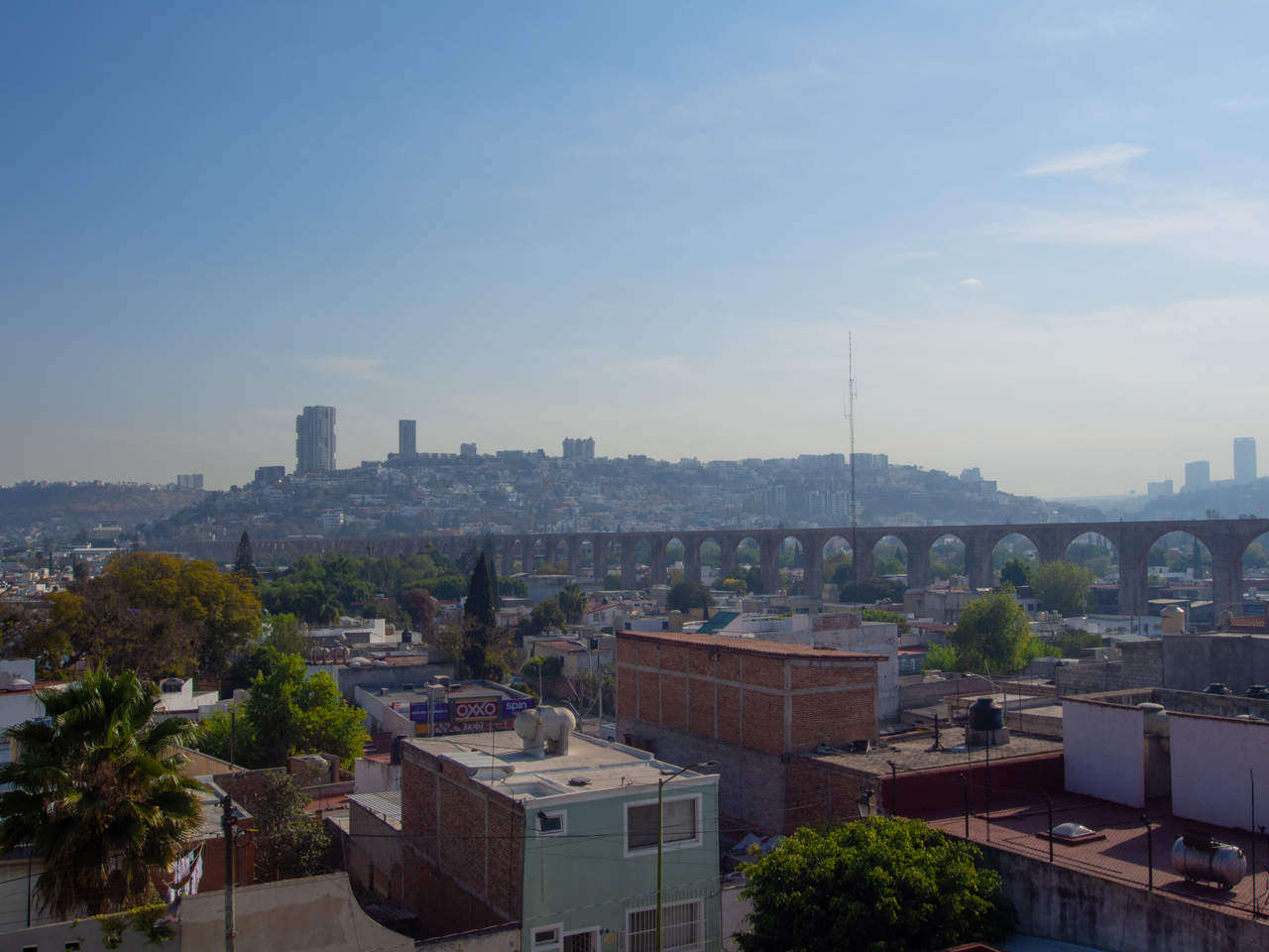 San Miguel de Allende est à moins de 100km de la capitale de la région de Queretaro, Santiago de Queretaro. La route est facile pour la rejoindre mais j’ai failli me faire surprendre par un des nombreux topes placés à l’entrée et à la sortie des villages. En fait, la voiture qui m’avait doublé, ou plutôt que j’avais laissé passer en me rabattant sur la bande d’arrêt d’urgence par courtoisie un peu avant, a freiné au dernier moment et avec un instant d’inattention, je lui aurai surement refait le pare choc arrière. Plus de peur que de mal, en tout cas sitôt le topes passé, j’appuie à fond sur la pédale pour doubler ce « touriste » qui fait n’importe quoi, reprenant mes bonnes mauvaises habitudes, on ne m’y reprendra plus ! Lorsque l’on descend sur Queretaro, la route se transforme en quasi autoroute, et on ne peut pas dire que Queretaro fasse une belle impression au premier regard. La ville de Queretaro est très dynamique avec de nombreuses usines de pointes qui se sont installées dans les différents centres industriels. Les axes routiers sont larges et très très embouteillées… Néanmoins, cette ville moderne qui pourrait être américaine cache au coeur de son centre ville de très jolis endroits qui méritent le détour. On commence par trouver une place pas très loin de l’aqueduc de la ville, un vestige historique, une construction des espagnols pour alimenter la ville en eau. Ce grand aqueduc est devenu le symbole de la ville de Santiago de Querétaro.
