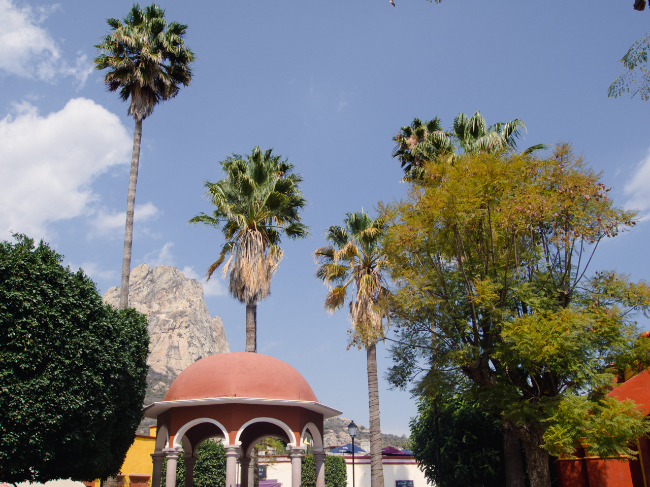 Le jardin du village est très mignon avec un kiosque entouré de palmiers qui donne directement sur le Pena de Bernal.