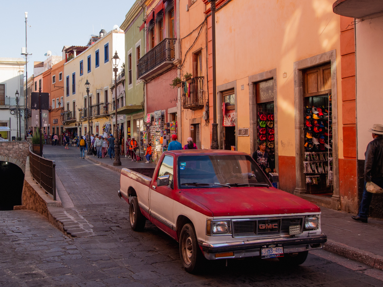 Rouler dans les ruelles des vieilles villes Mexicaines est difficile, les pavés sont glissants, les rues sont étroites et congestionnées. Il vaut mieux trouver un hôtel à l’entrée de la vieille ville et visiter à pieds.