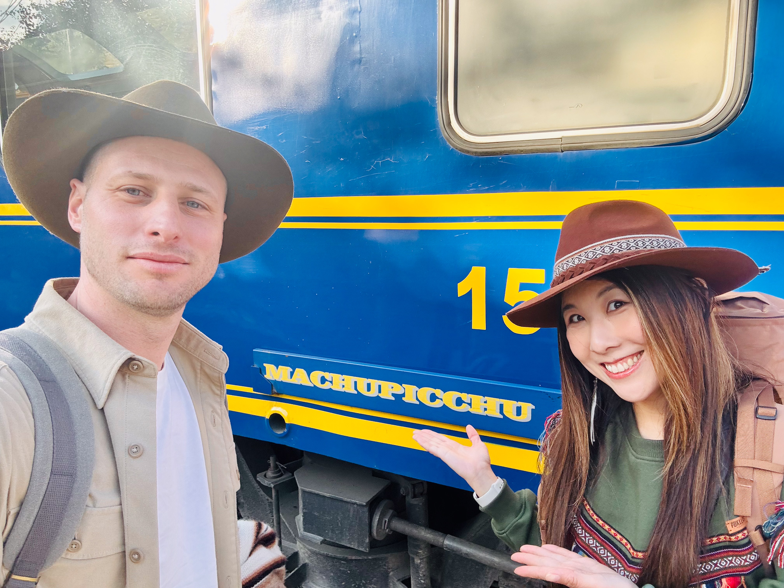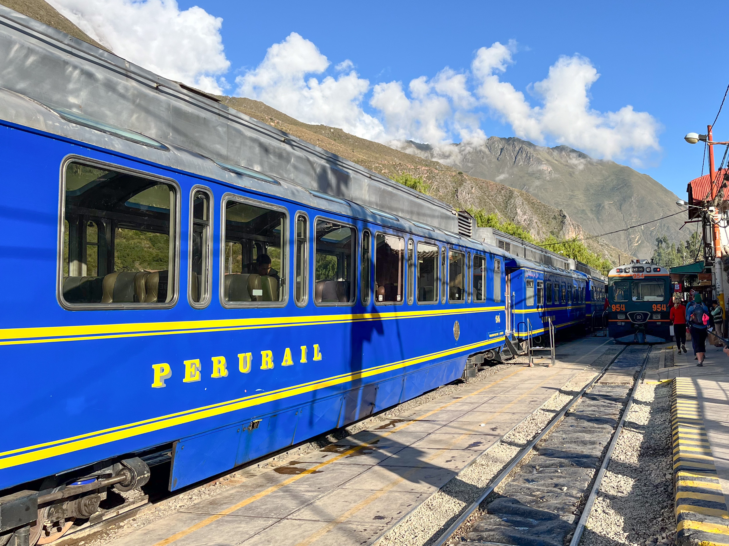 Quatre mois après la réservation de tous les différents tickets pour visiter la plus célèbre merveille du Pérou, ca y est on est enfin arrivé au jour J. Il a fallu réserver les entrées pour le site du Machu Picchu lui même, sur la plateforme officielle, en choisissant les horaires les plus intéressants. On a tout fait pour éviter le dimanche comme conseillé car il est noté qu’il y a plus de touristes locaux (même si je me demande si cette affirmation est correcte puisqu’il y a un nombre maximum d’entrée par jour), et on a essayé de trouver le meilleur horaire en pensant à plusieurs paramètres comme la foule et la lumière sur le site. On a eu du mal à se décider et comme j’étais connecté le premier jour à la première heure de l’ouverture des réservations, j’avais l’embarras du choix, j’ai donc pris un billet pour le vendredi après midi qui comprend une promenade jusqu’au pont inca puis un autre billet pour le lendemain matin avec juste le tour n°2 qui permet de faire la boucle complète dans la citadelle et comprenant les endroits les plus photogéniques du site. C’est pas simple de s’y retrouver, mais finalement le paiement sur la plateforme est très simple et je reçois les tickets immédiatement sur la boite email. La deuxième étape est de réserver le train en fonction de l’horaire d’entrée au Machu Picchu. Comme j’avais réservé un billet à 14h, je pensais devoir arriver à 13h aux portes, mais finalement je remarquerai que puisque l’on a inclus la visite jusqu’au pont inca, il faut être à 12h à la porte d’entrée,. Je me rends compte de ce point une semaine avant notre départ pour le Pérou et je contacte l’office de réservation qui me confirme que je dois être devant la porte à midi et qu’il n’y a pas de marge d’erreur, or mon billet de train me fait arriver juste un peu avant 12h à Aguas Calientes dans la vallée, c’est trop juste. Heureusement cela a été très simple de changer le billet en contactant le service après vente, j’ai payé un peu moins de vingt dollars pour prendre un train matinal et éviter le stress de rater l’heure d’entrée au Machu Picchu, ce que je voulais absolument pas vivre. Donc pour revenir à la réservation des billets de train, il y a le choix entre deux compagnies de train, Perurail et Incarail. On a choisi le premier juste pour une question d’horaire. Le train n’est pas donné, mais on choisi la version Vistadome, avec les vitres au plafond (inutile) et le dernier wagon avec un balcon très photogénique, un concert et des rafraichissements sont offerts. On se dit que l’on ne vient qu’une fois au Machu Picchu, donc on paye le prix fort. C’est sur qu’il ne faut pas comparer le prix de notre billet de train avec le prix que paye les péruviens qui prennent le train régional, le Machu Picchu est une source de revenu importante pour le pays et ils utilisent sa localisation tout au bout d’une vallée quasiment inaccessible autrement pour gagner plus d’argent, on peut le comprendre, surtout que l’effort fait sur le service du train est finalement agréable. On part d’Ollantaytambo de bonne heure, il y a de la musique et des artistes masqués, les trains sont très mignons, et ça nous met déjà dans l’ambiance de la journée extraordinaire que l’on va vivre. On attend notre train sur le quai tout excités !
