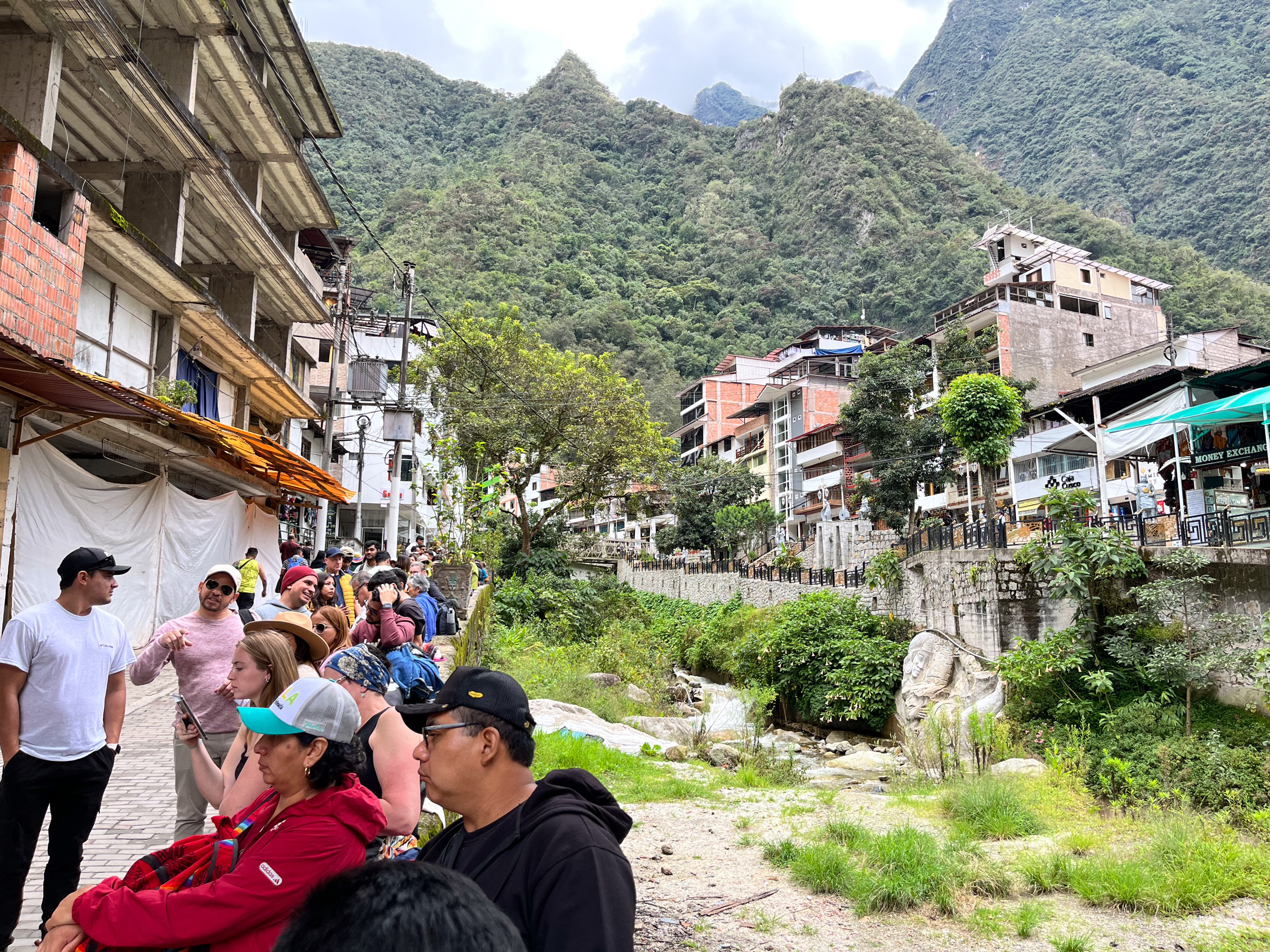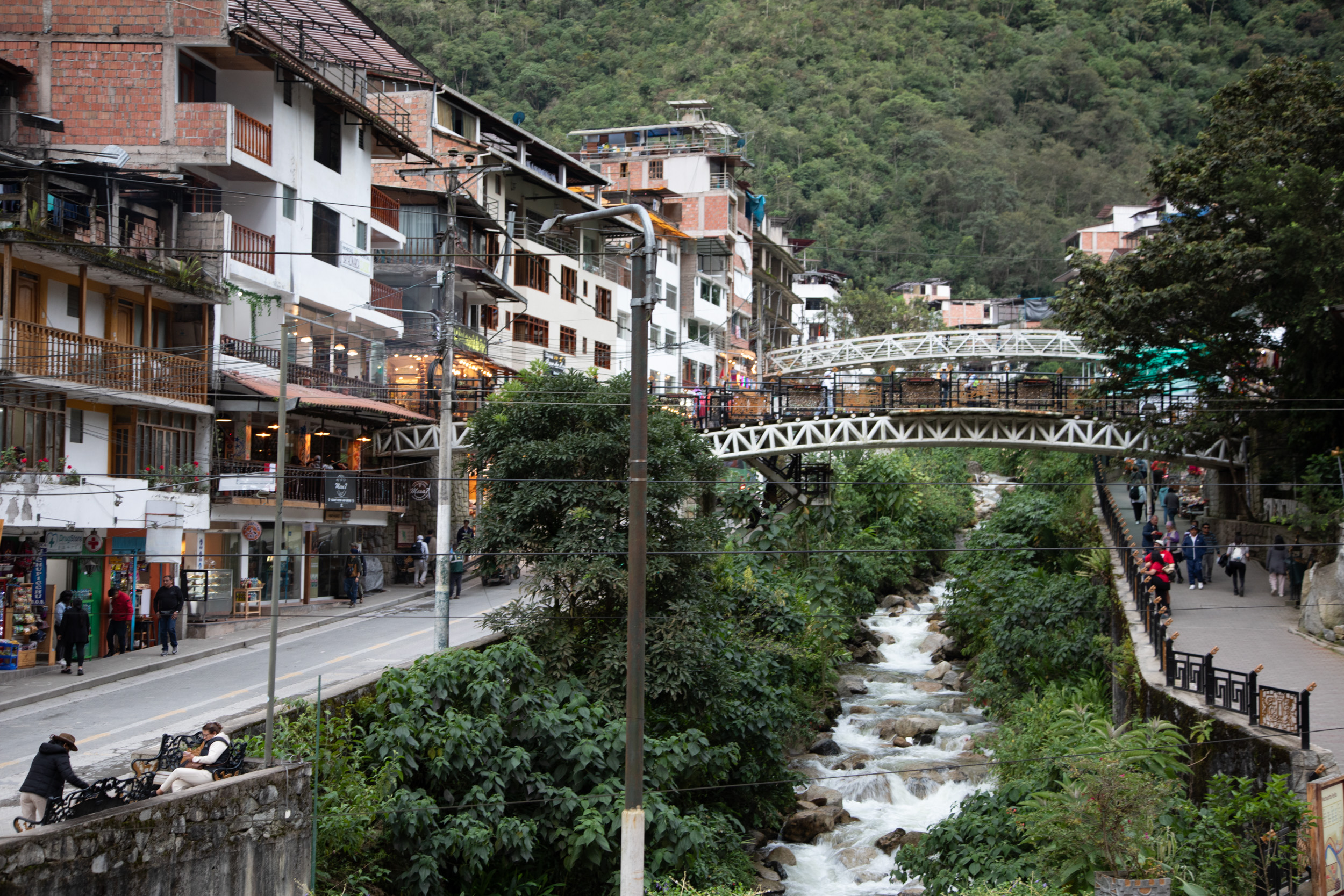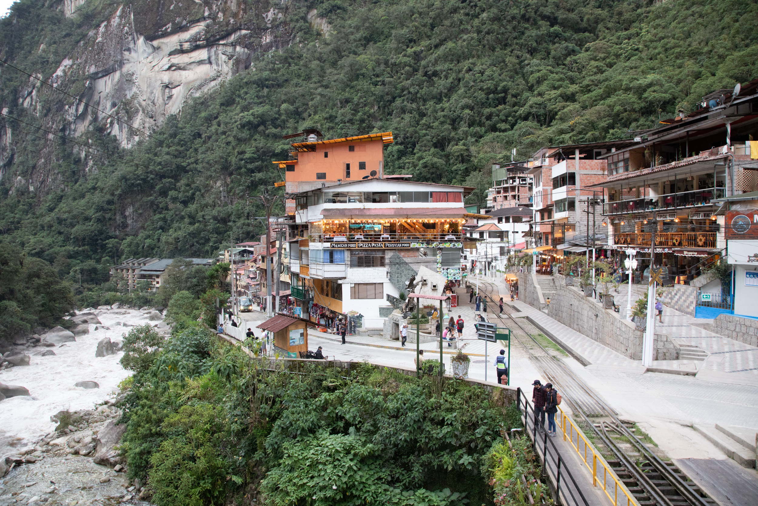 On arrive finalement en gare de Aguas Calientes, aussi nommé Machu Picchu Pueblo. La ville est bordée par le fleuve Urubamba et est encaissée au coeur de montagnes très hautes, on imagine que tout en haut d’une de ces montagnes, se trouve le monument historique.