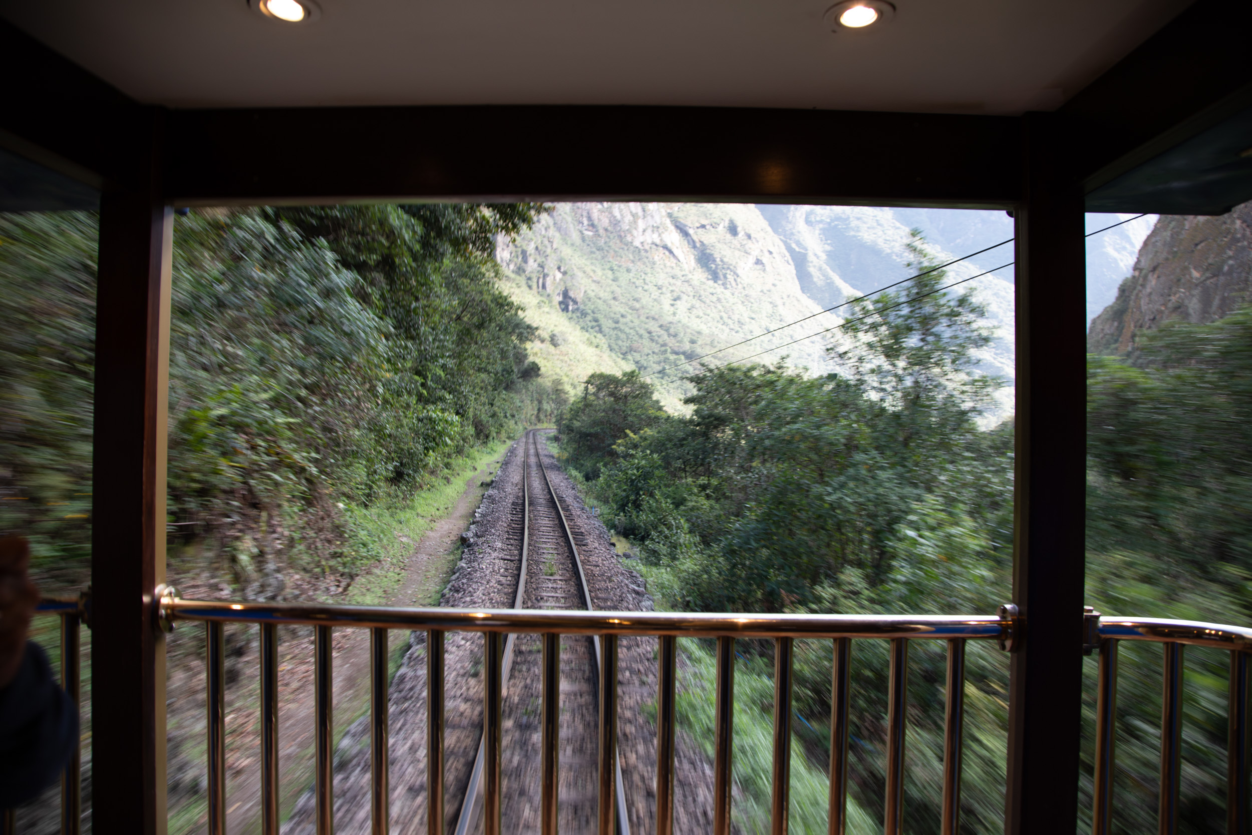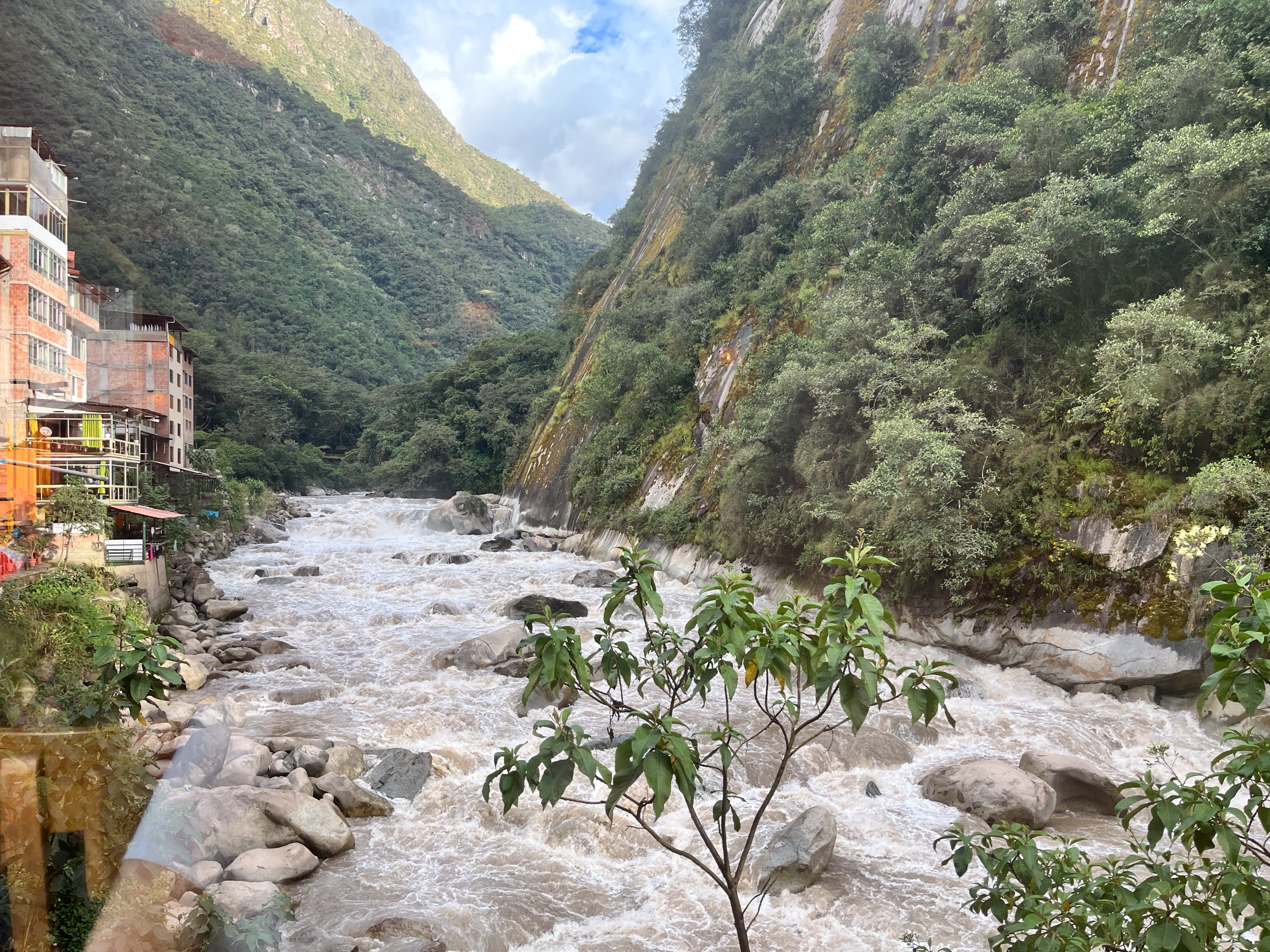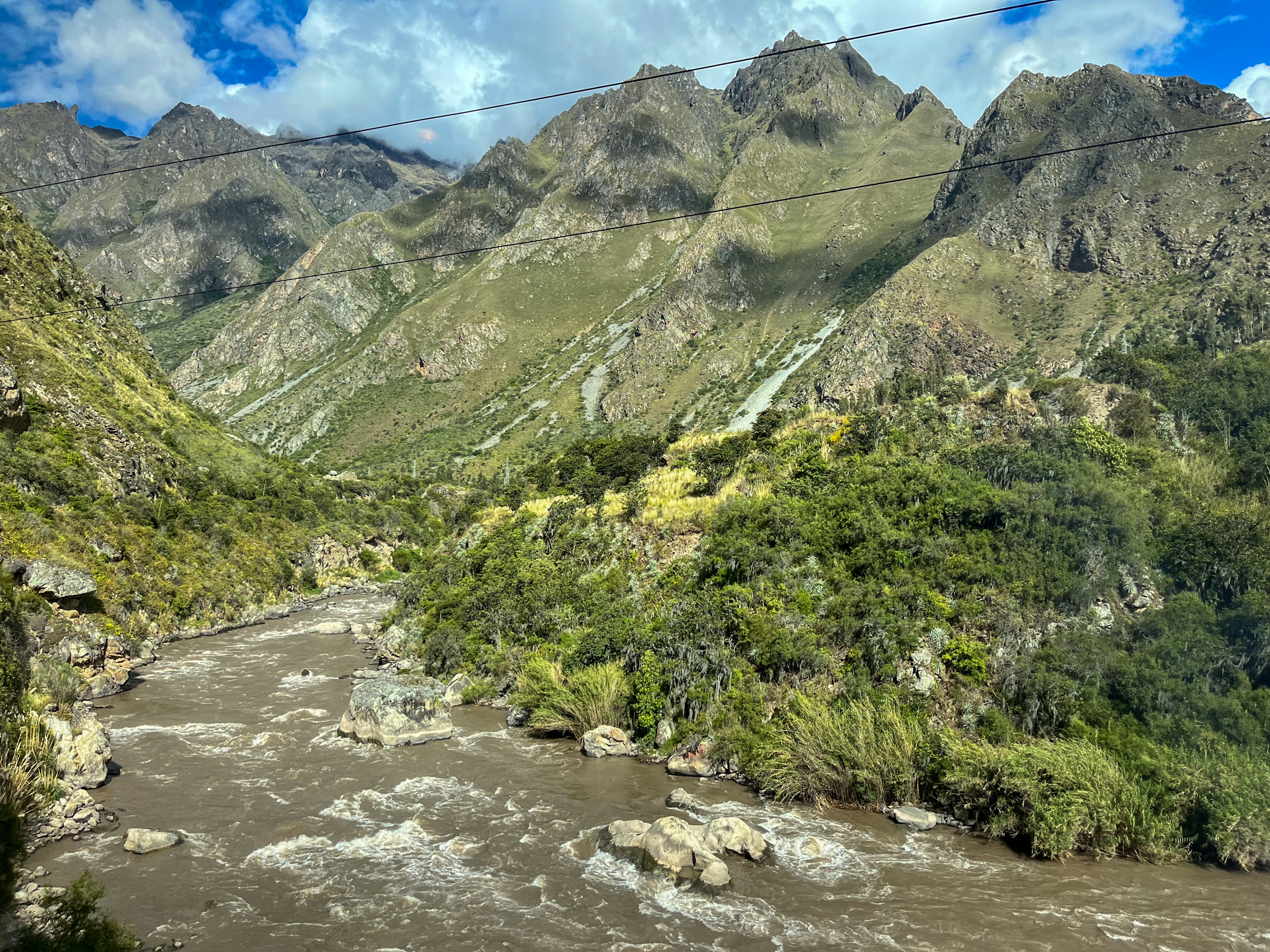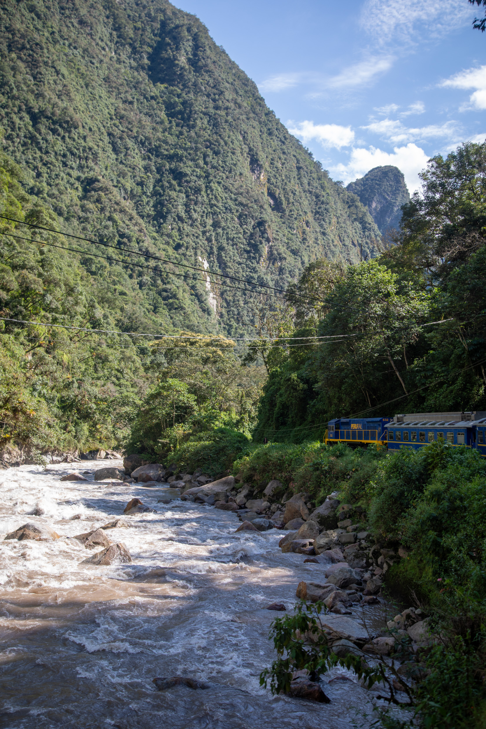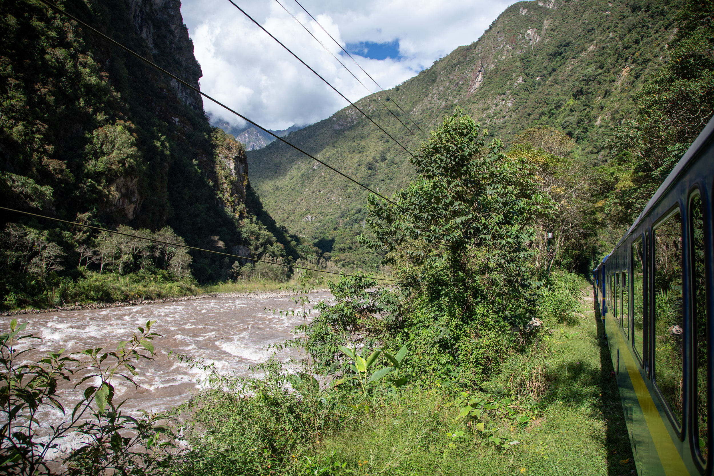 Le train traverse des paysages extraordinaires, on longe la rivière Urubamba qui se fraye un chemin au milieu des montagnes. Il n’y a pas de route sur une partie du trajet, seul le train relie Aguas Calientes depuis Ollantaytambo. La végétation change au fur et à mesure que l’on roule sur ce tronçon de 44km et un dénivelé de 800 mètres. On quitte la flore typique des hauts plateaux et on se retrouve étonnamment au milieu d’une végétation tropicale à Aguas Calientes, beaucoup plus humide mais quand même plus respirable que Puerto Maldonado.