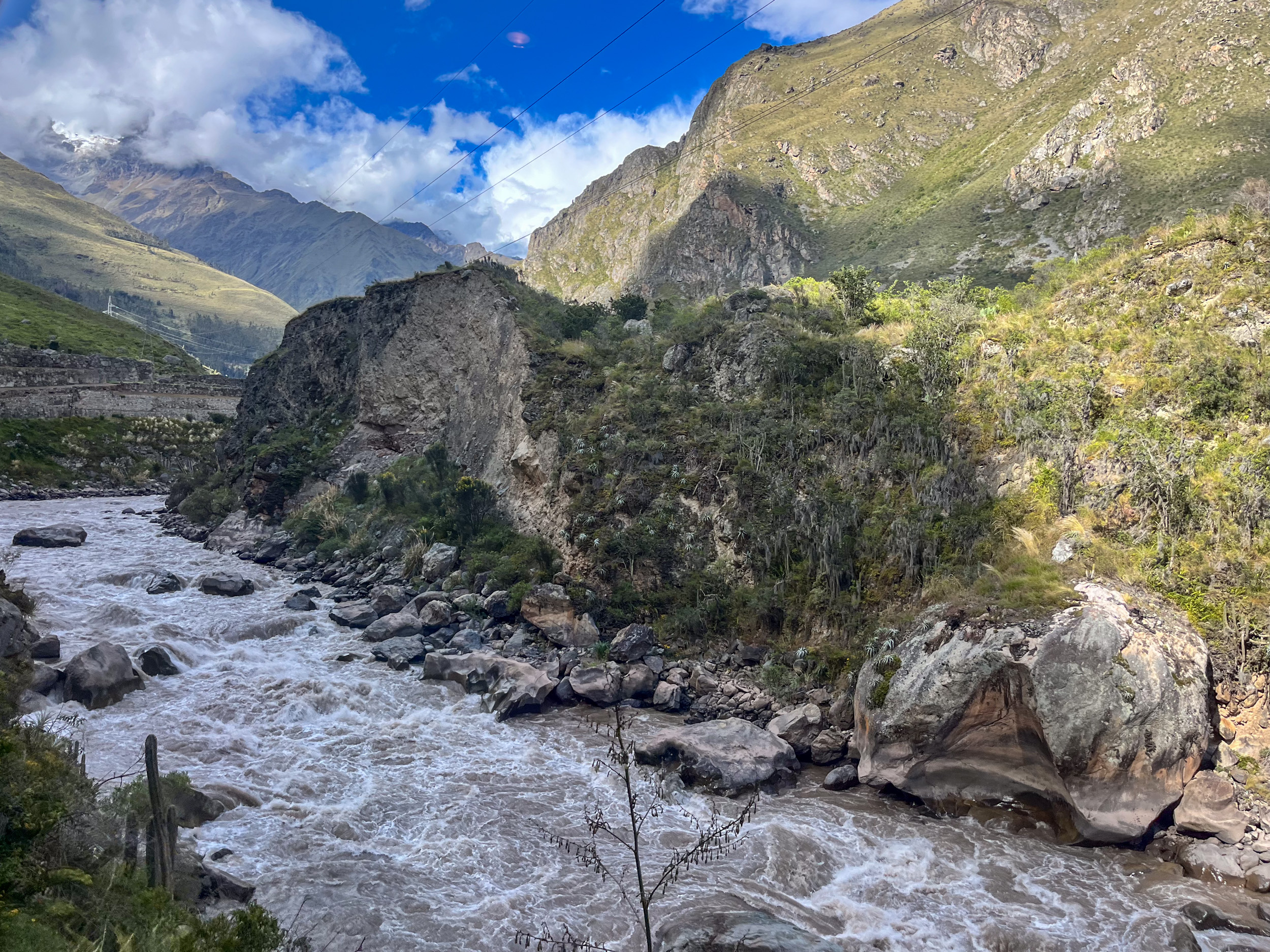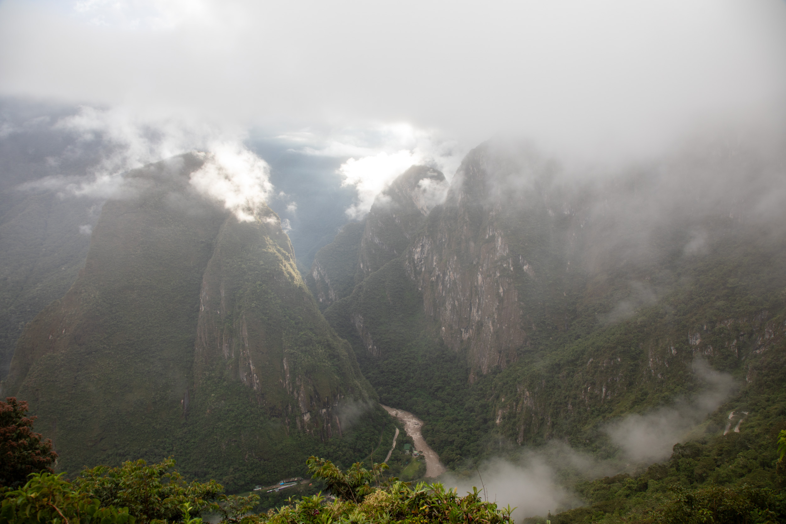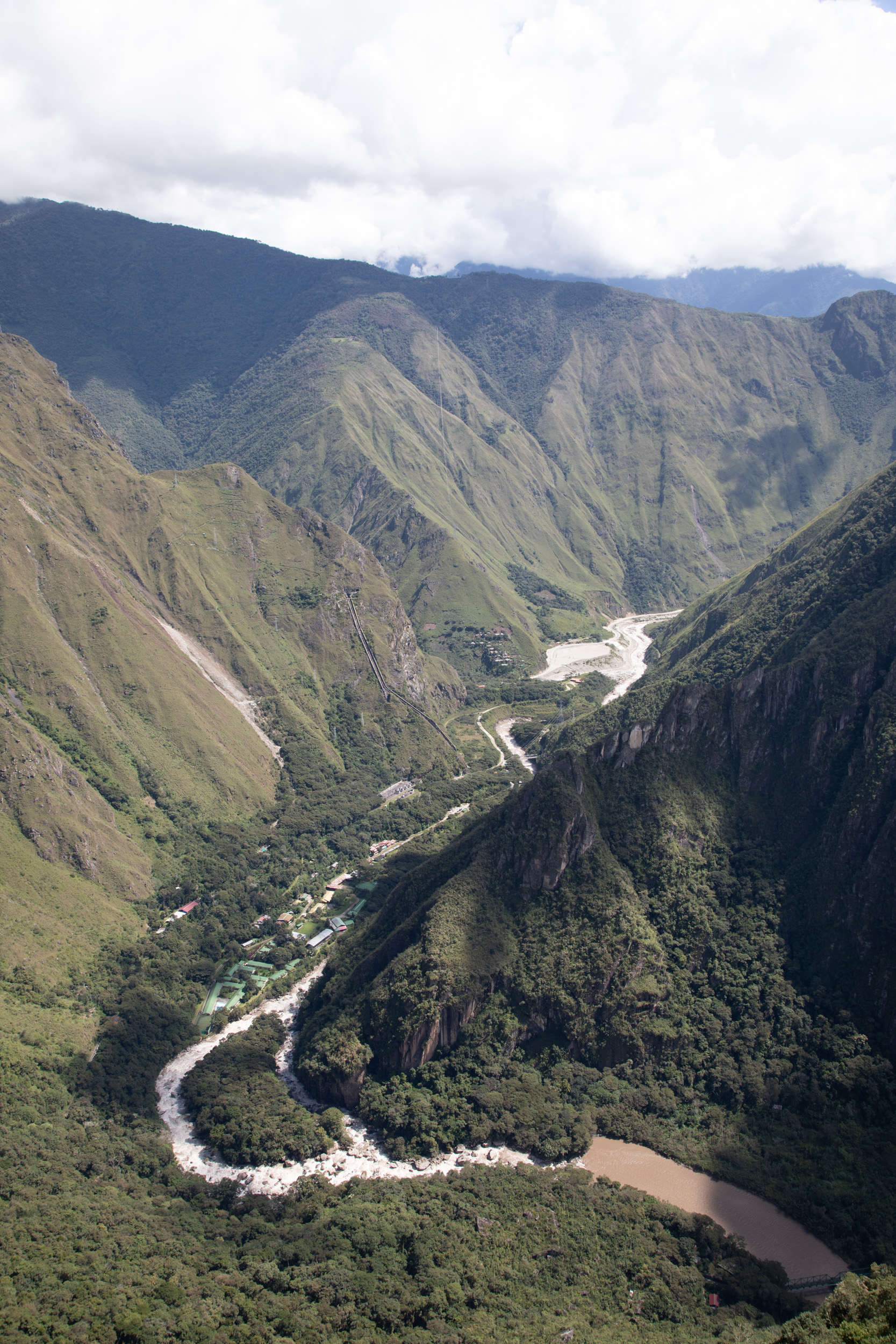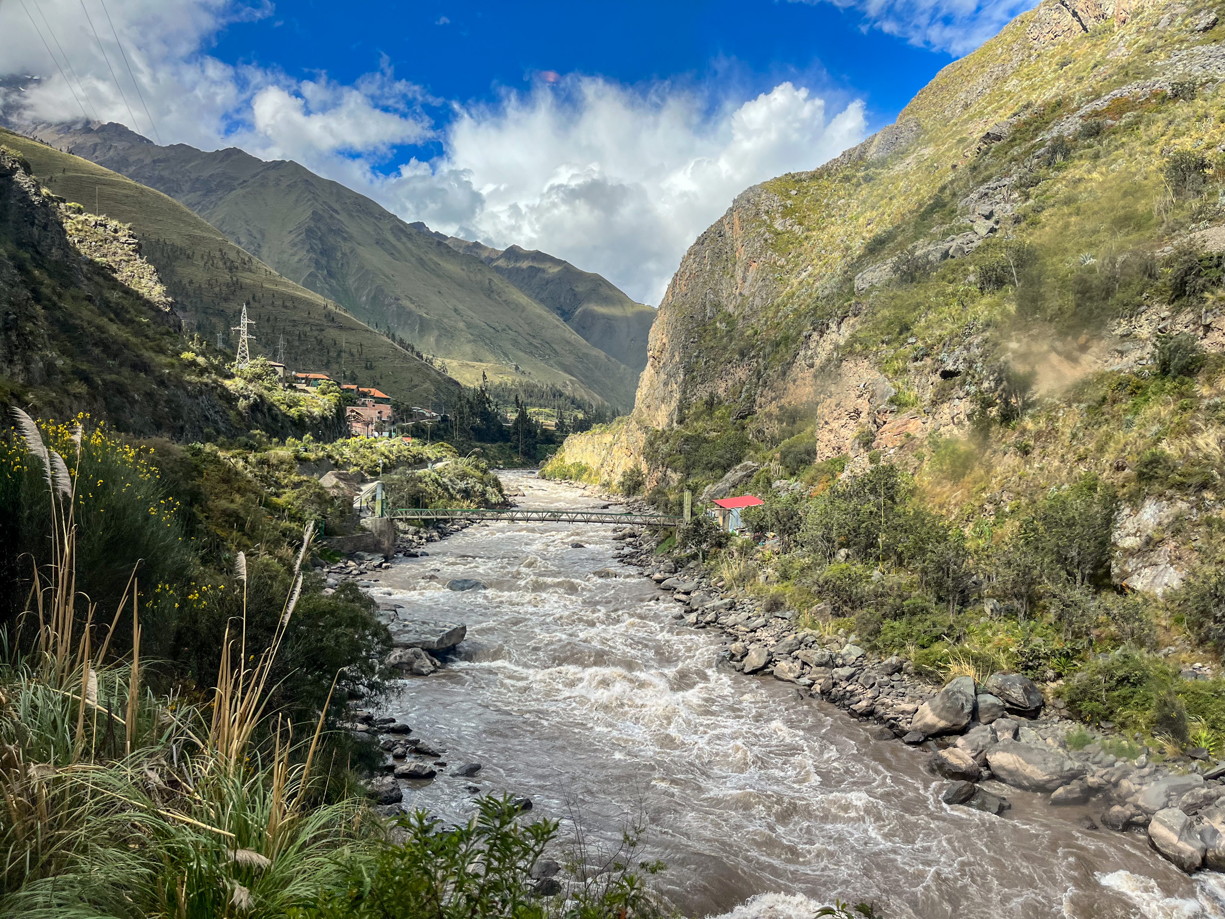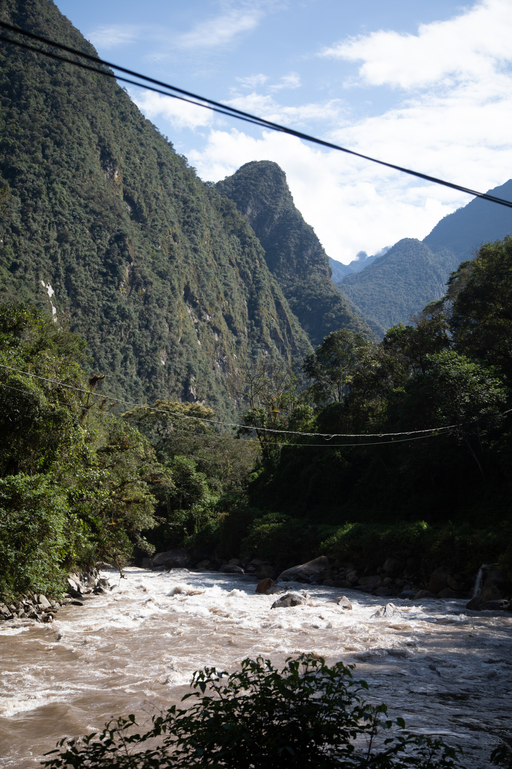 Le train traverse des paysages extraordinaires, on longe la rivière Urubamba qui se fraye un chemin au milieu des montagnes. Il n’y a pas de route sur une partie du trajet, seul le train relie Aguas Calientes depuis Ollantaytambo. La végétation change au fur et à mesure que l’on roule sur ce tronçon de 44km et un dénivelé de 800 mètres. On quitte la flore typique des hauts plateaux et on se retrouve étonnamment au milieu d’une végétation tropicale à Aguas Calientes, beaucoup plus humide mais quand même plus respirable que Puerto Maldonado.