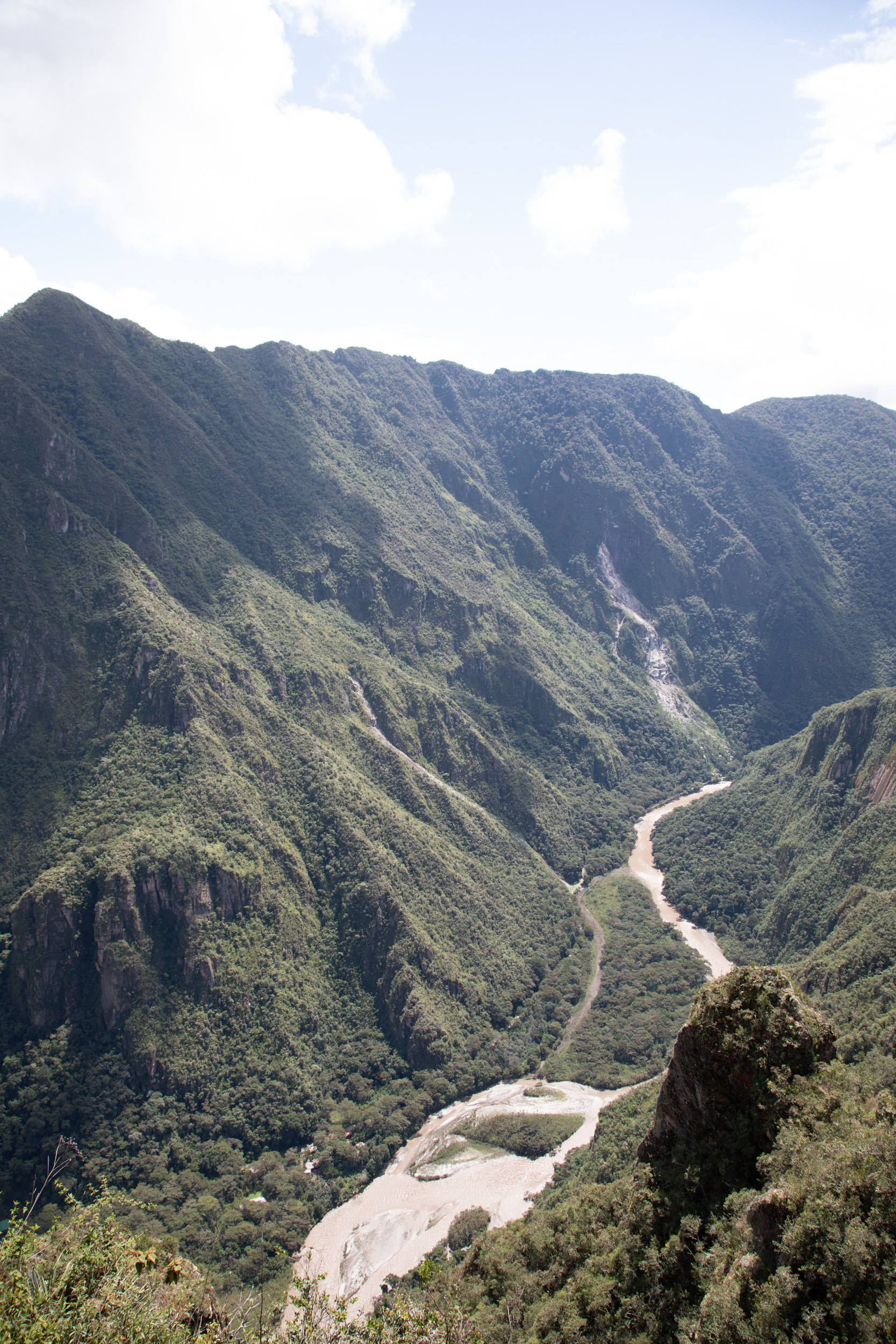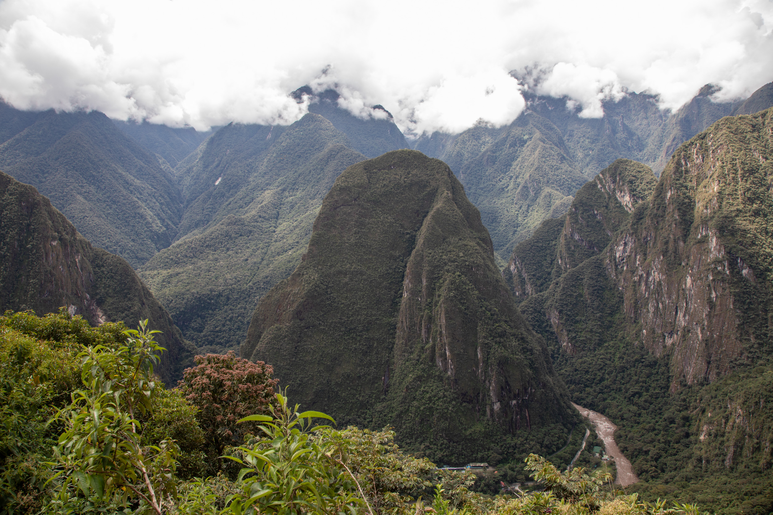 Depuis le chemin, on peut voir le paysage de montagne autour du Machu Picchu, ces montagnes sont vraiment impressionnantes, verticales, avec le fleuve qui coule au fond de la vallée où se trouve le village d’Aguas Calientes.