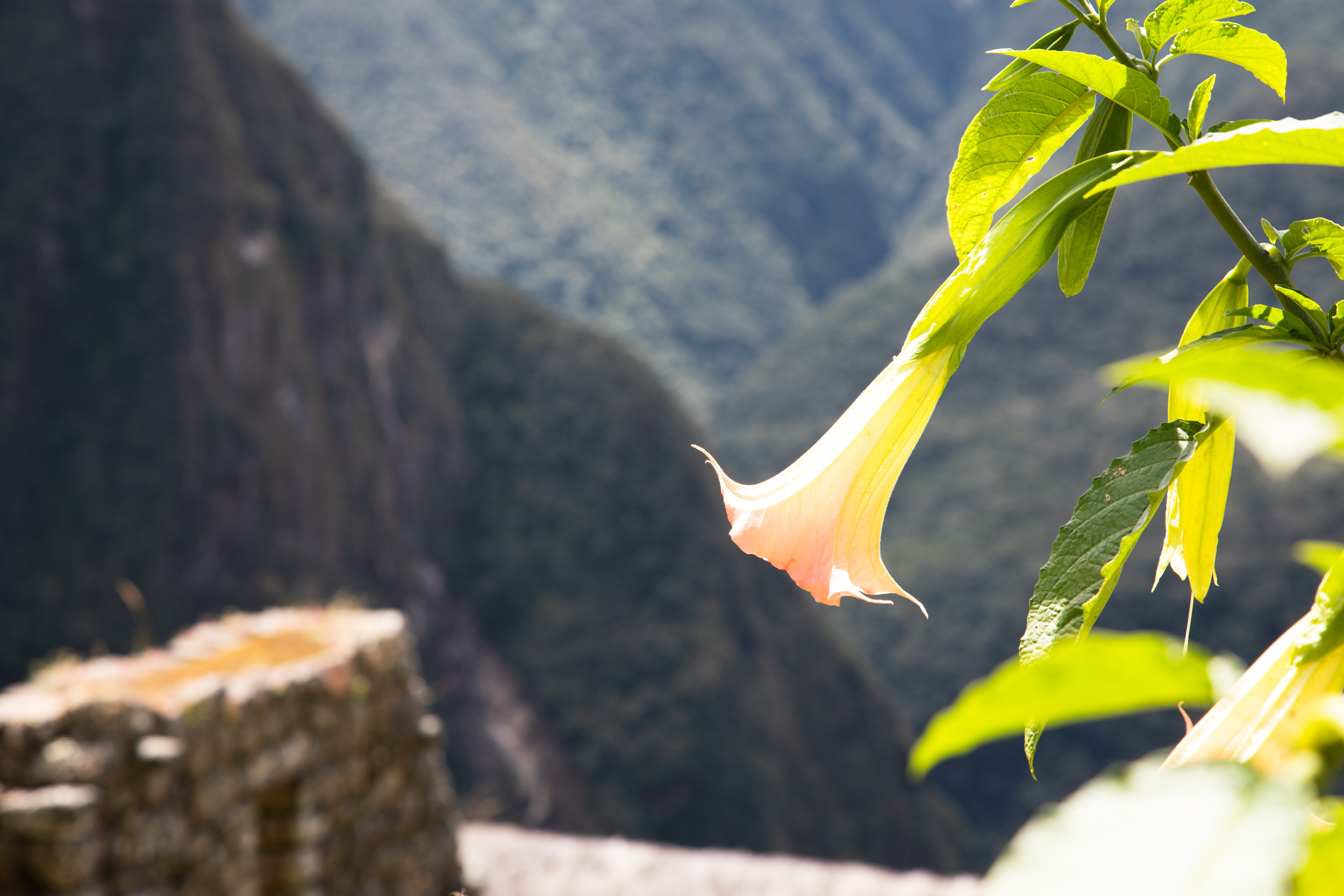 Des guides proposent leurs services aux touristes qui font la queue. On prend donc un des guides avec nous afin d’avoir des explications lors de notre visite. Bon notre guide ne sera pas le plus performant de tous, avec un anglais faible et notre niveau d’espagnol est plutôt moyen ce qui fait que l’on aura une explication assez simpliste, mais on aura quand même le minimum, par contre difficile de poser des questions et d’avoir des réponses. Une dizaine de bus va tous nous monter les uns derrière les autres et on arrive tous en haut, à refaire la queue jusqu’à l’heure inscrite sur le ticket, pour nous midi en l’occurence. On est vraiment excité ! On est enfin arrivé au bout du périple jusqu’à la porte d’entrée du Machu Picchu, un des moments les plus attendus pour tout voyageur. Il y a beaucoup de fleurs au bord des chemins qui mènent à la citadelle, étonnamment cela n’a rien à voir avec la végétation de la vallée sacrée.