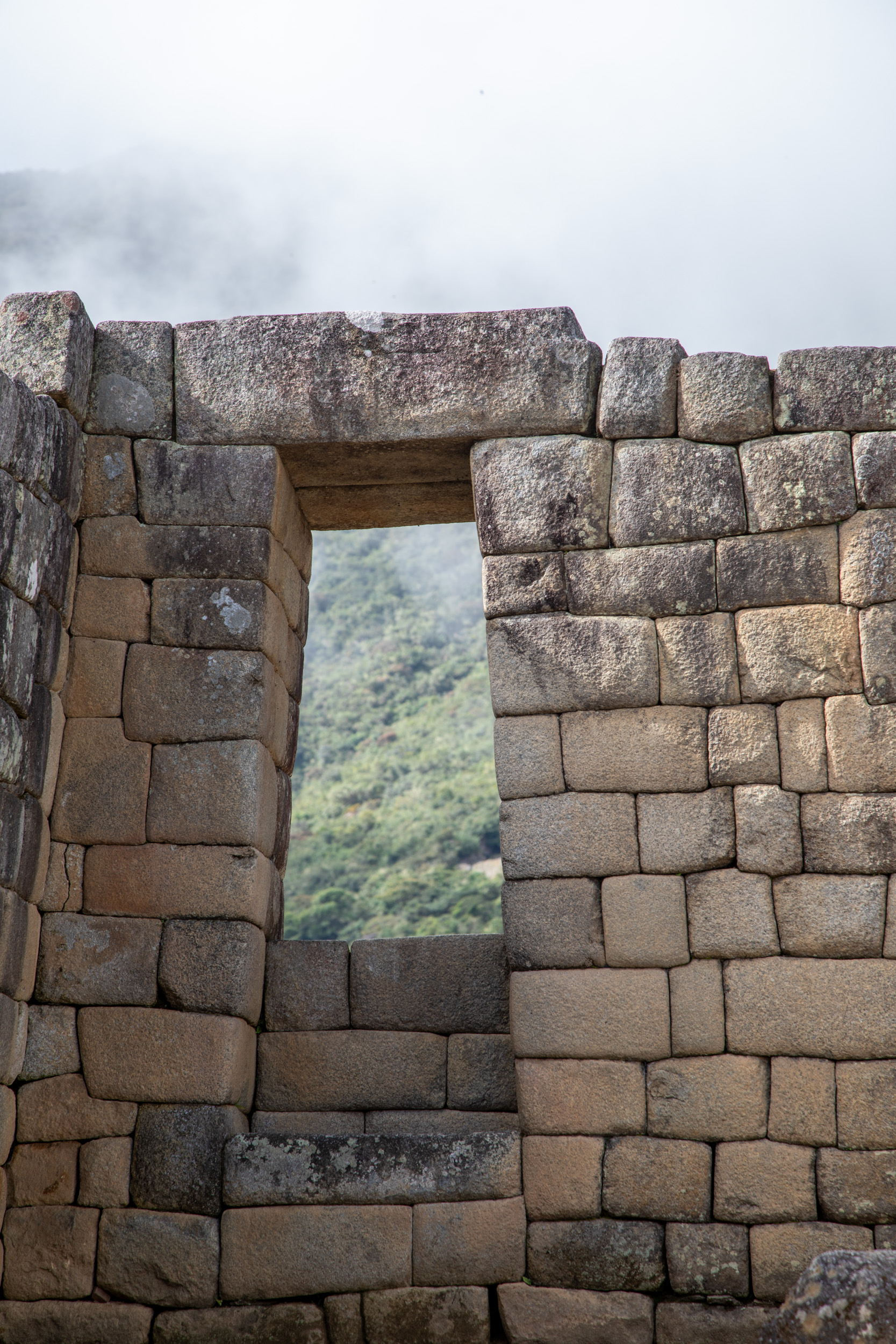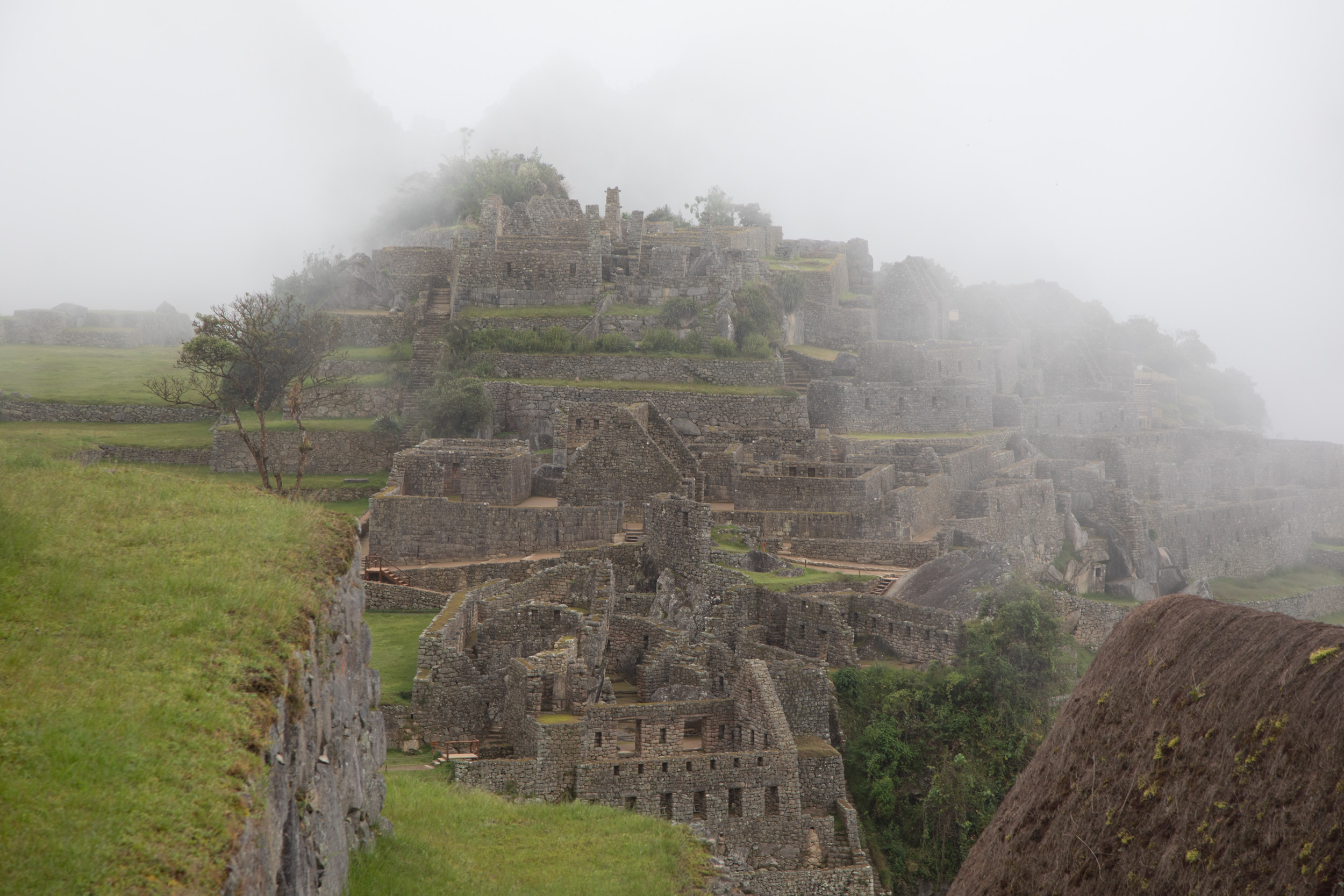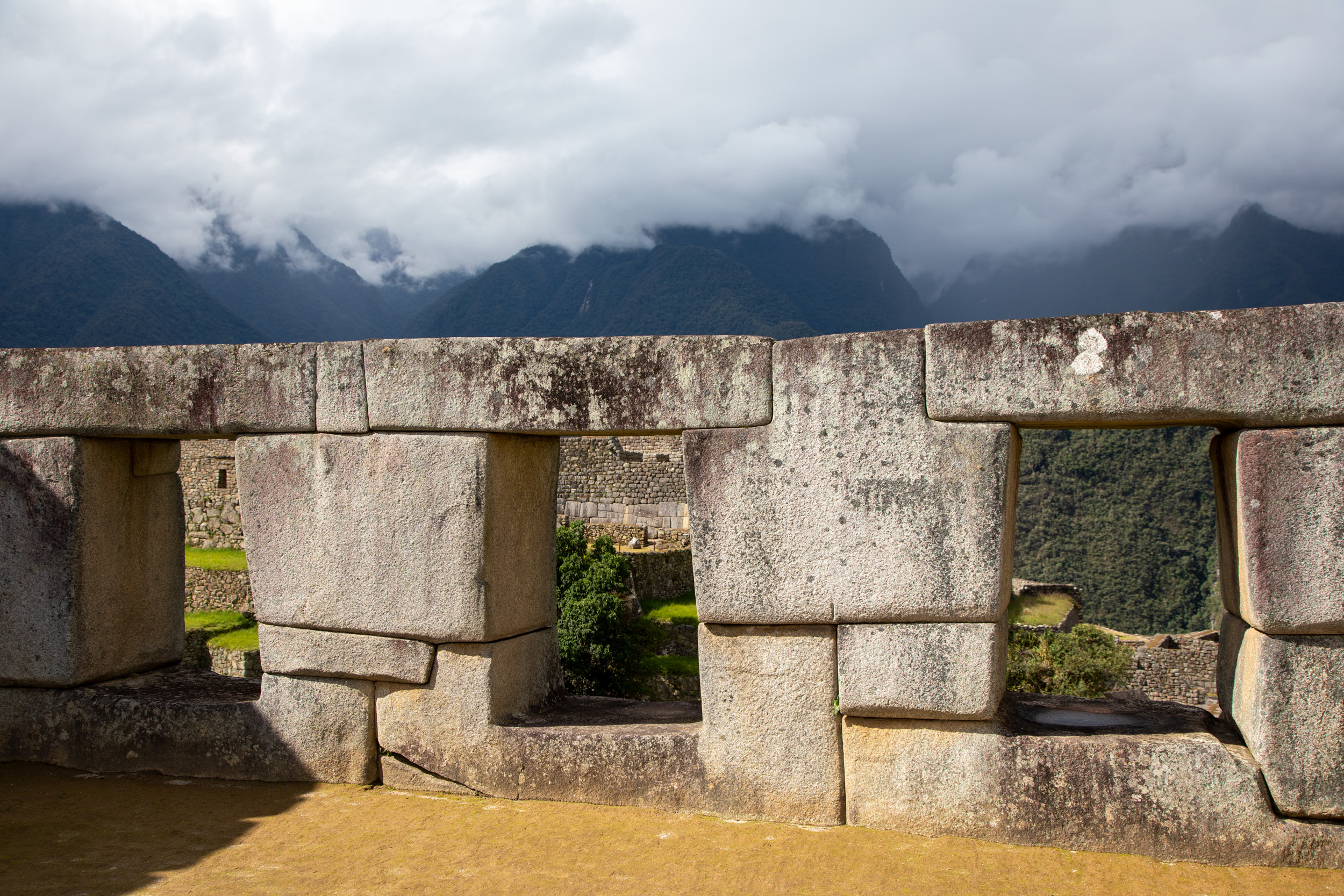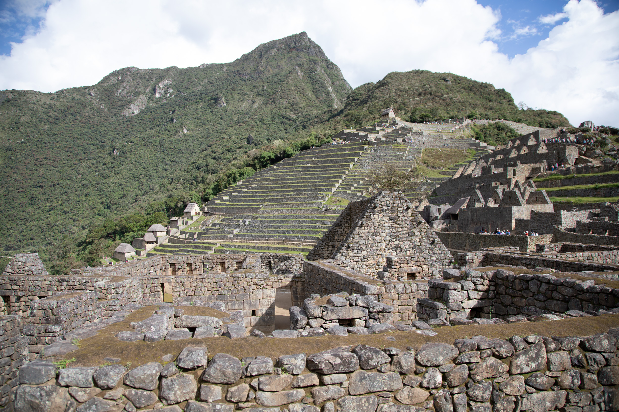 Un énorme effort de restauration a été entamé après la redécouverte de la cité perdue par l’américain Hiram Bingham en 1911, il y a donc un peu plus de cent ans seulement. Il a fallu déterrer les vestiges, enlever les arbres, restaurer les pierres. C’est aussi un travail quotidien des ouvriers du parc, que l’on voit ici et là avec des échelles pour enlever la mousse qui vient tous les jours recouvrir les pierres de la citadelle. On entre maintenant dans la cité inca par une porte en pierre. Il faut imaginer que la construction du Machu Picchu s’est fait sans utiliser d’outils en métal, de mortier ou de roue, c’est une prouesse d’ingénierie qui a en plus été réalisée à une telle altitude, sur un terrain aussi difficile.