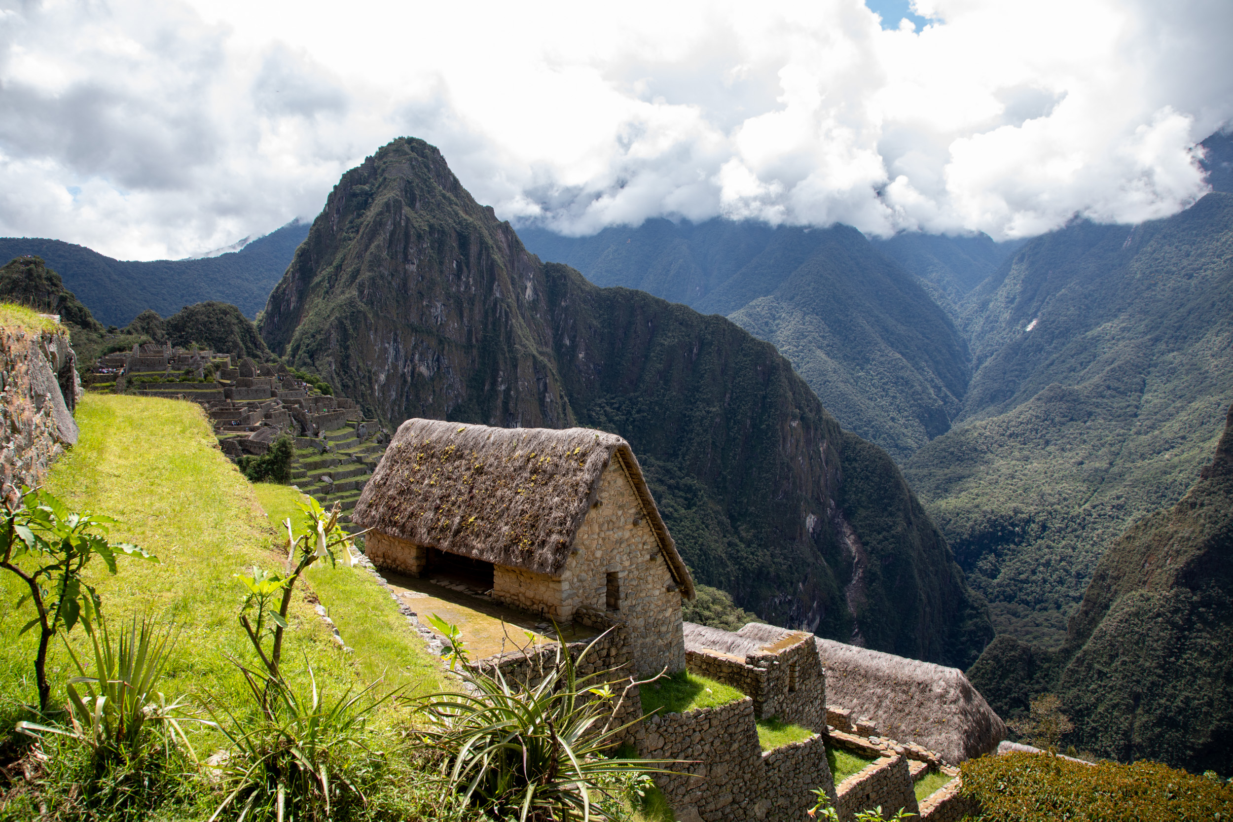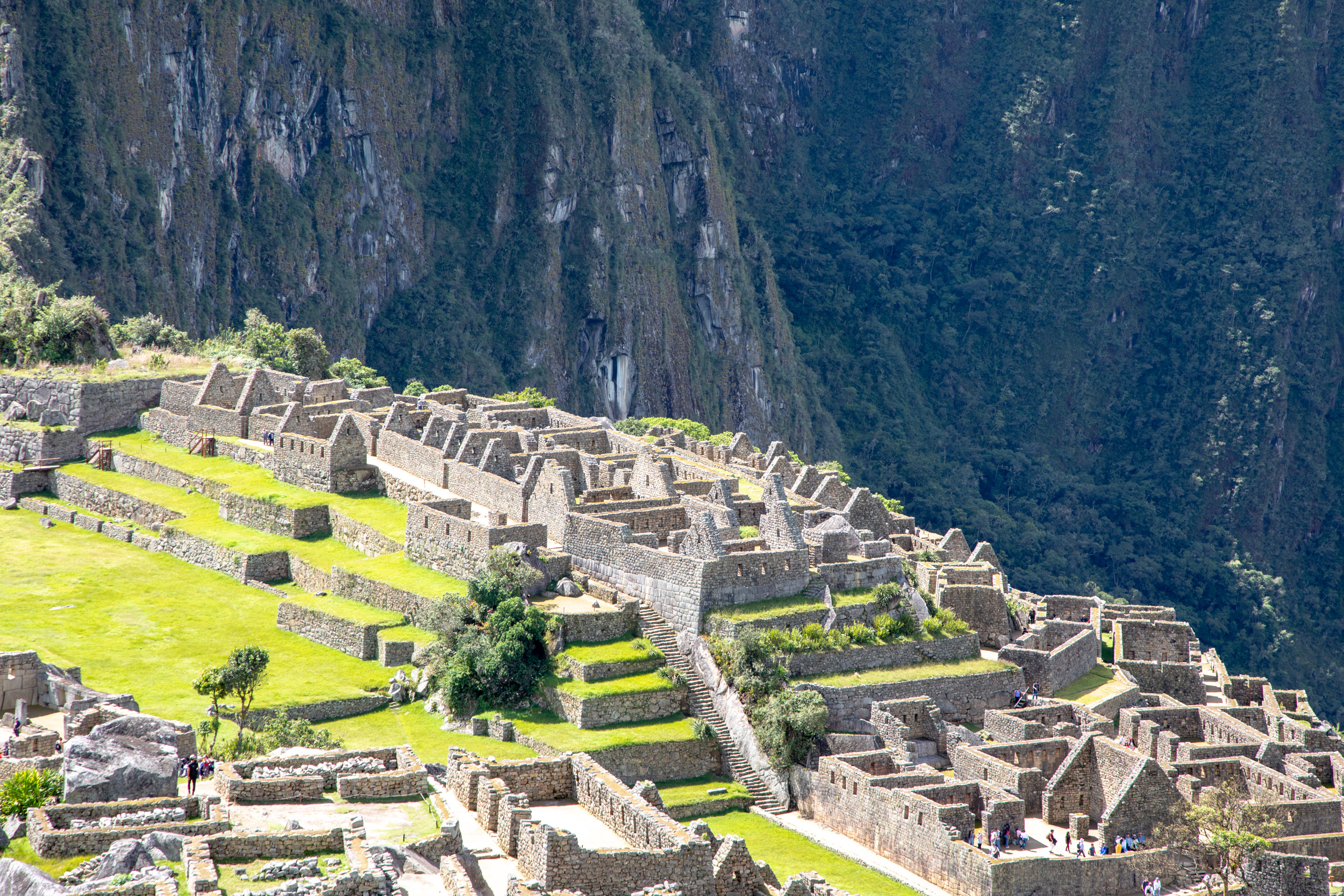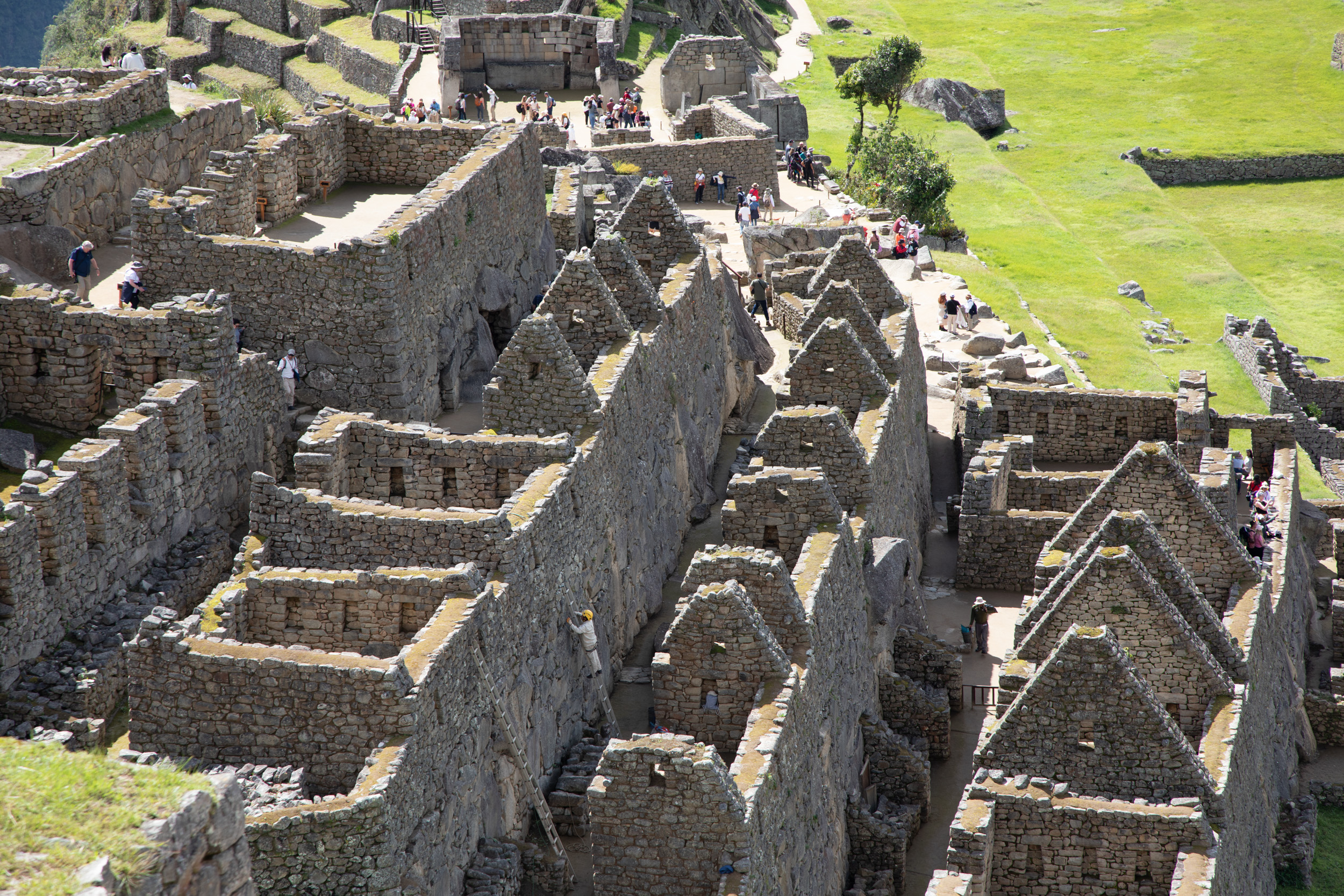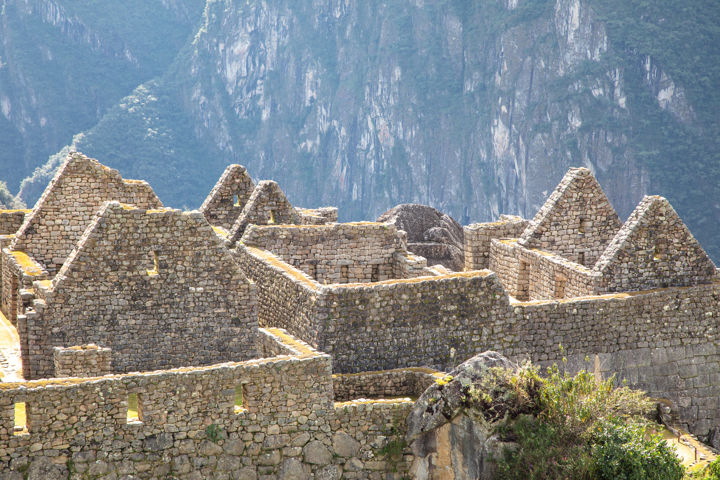 Un énorme effort de restauration a été entamé après la redécouverte de la cité perdue par l’américain Hiram Bingham en 1911, il y a donc un peu plus de cent ans seulement. Il a fallu déterrer les vestiges, enlever les arbres, restaurer les pierres. C’est aussi un travail quotidien des ouvriers du parc, que l’on voit ici et là avec des échelles pour enlever la mousse qui vient tous les jours recouvrir les pierres de la citadelle. On entre maintenant dans la cité inca par une porte en pierre. Il faut imaginer que la construction du Machu Picchu s’est fait sans utiliser d’outils en métal, de mortier ou de roue, c’est une prouesse d’ingénierie qui a en plus été réalisée à une telle altitude, sur un terrain aussi difficile.