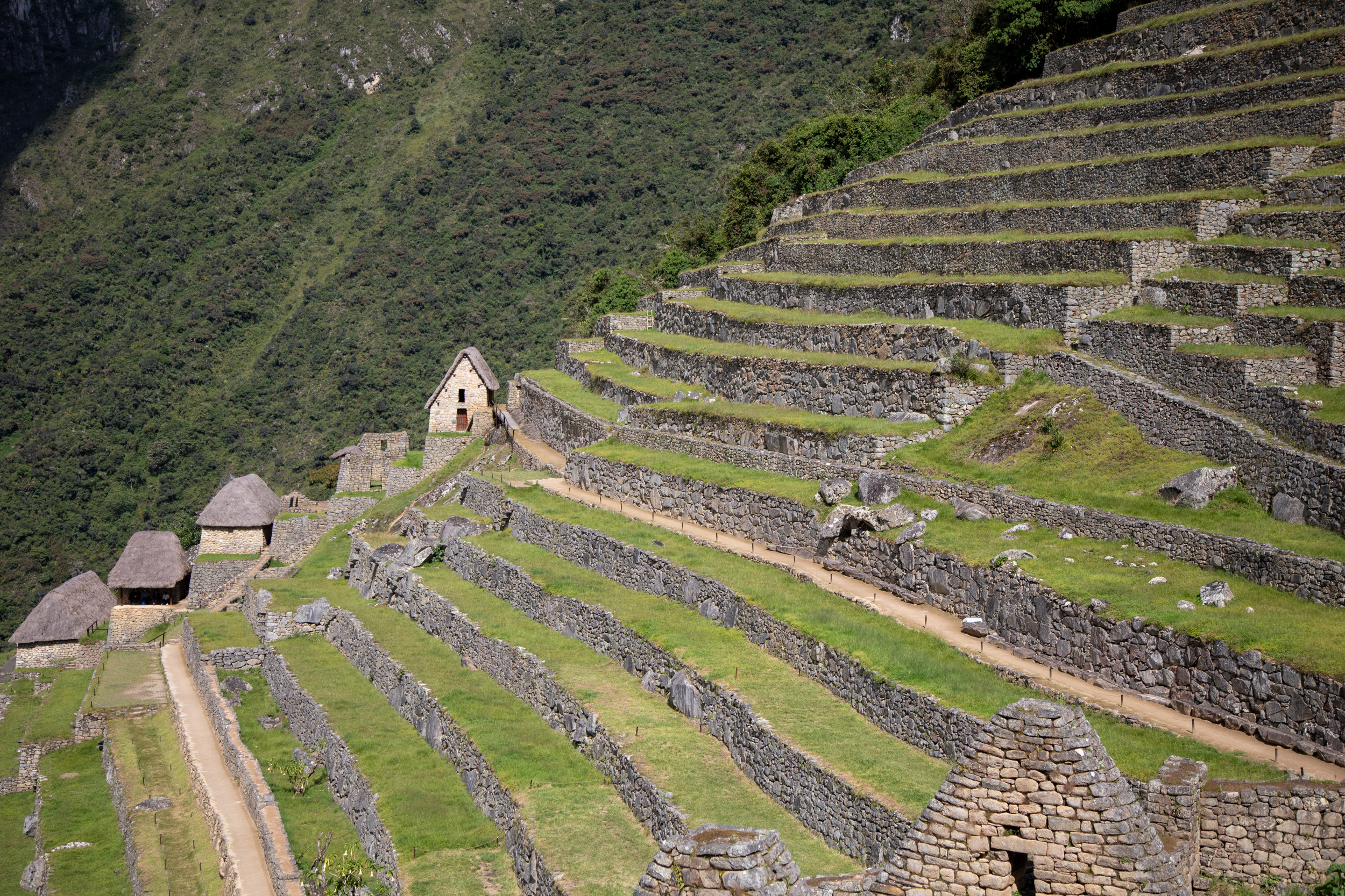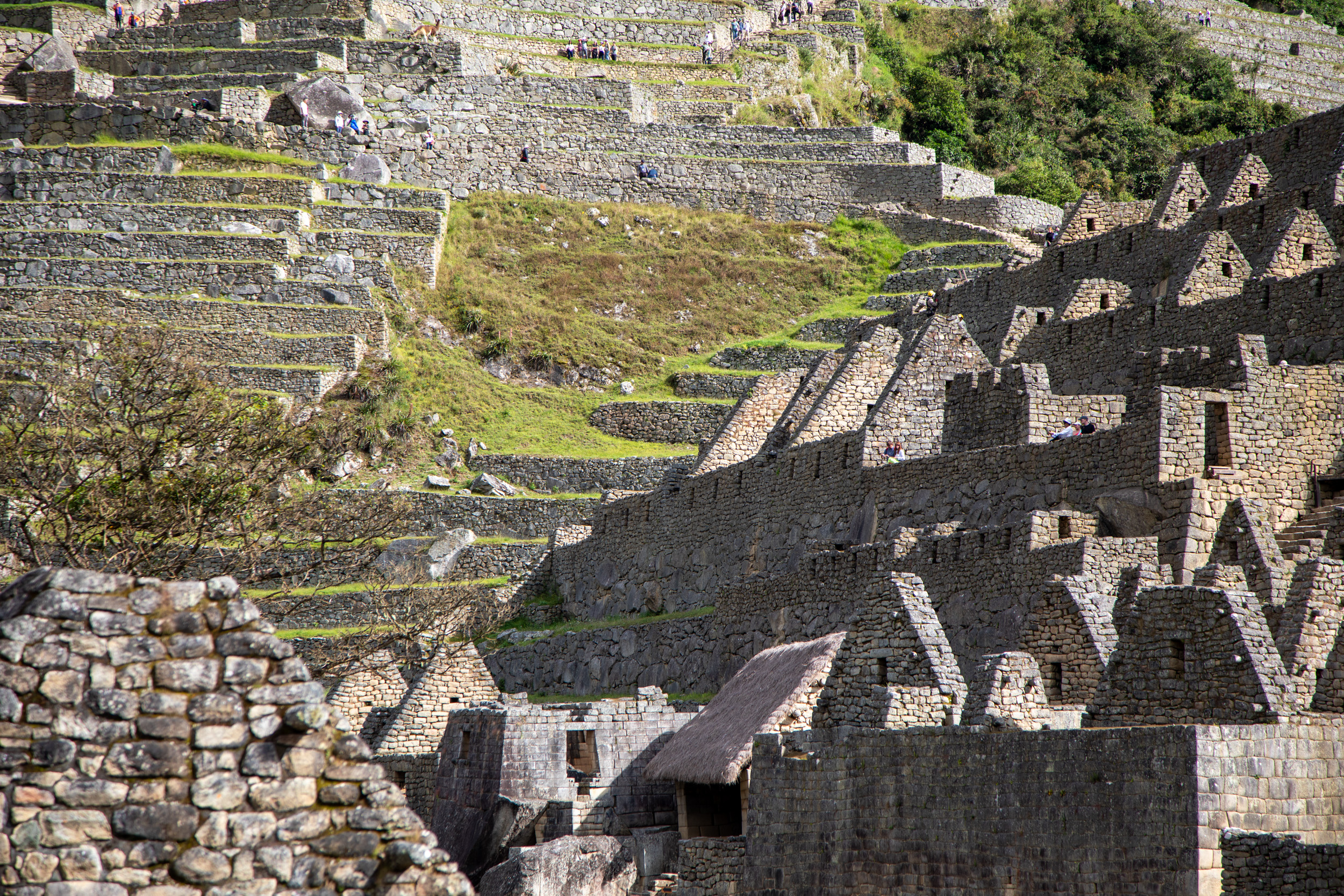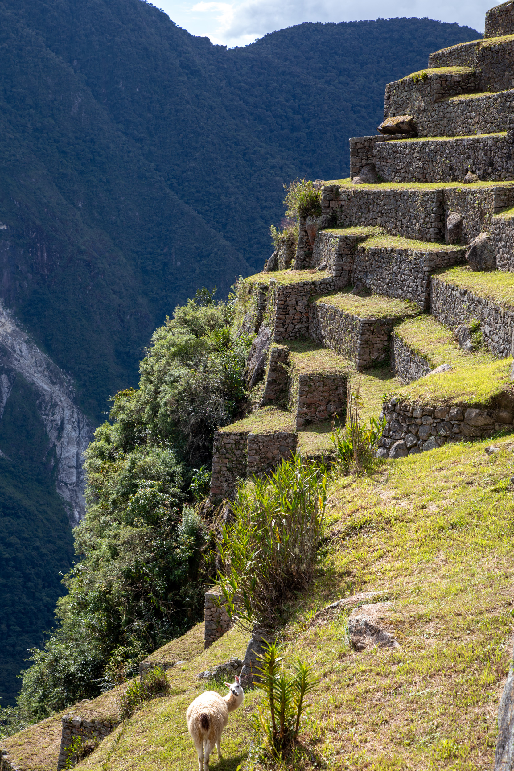 On trouve encore des lamas qui broutent l’herbe des terrasses agricoles. Ces lamas sont retournés à la vie sauvage après avoir été amenés sur le site il y a une cinquantaine d’années. Maintenant ils font leur vie tranquillement et sont une attraction du Machu Picchu. On retrouve à l’arrière du site une zone de recherche agronome, comme à Moray dans la vallée sacrée, avec des terrasses qui permettent de tester la meilleure façon de faire pousser chaque type de plantes.