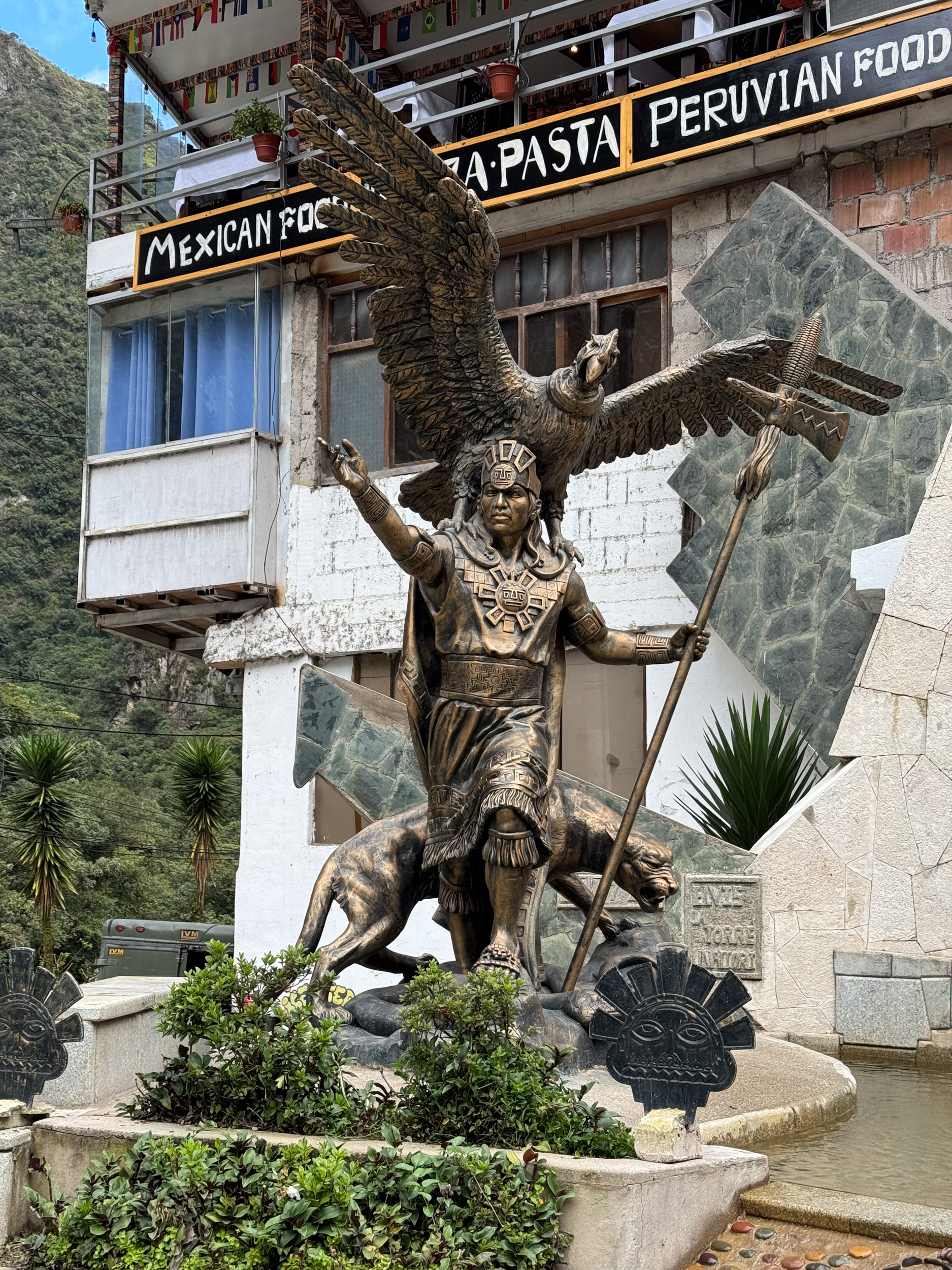 Arrivé à Aguas Calientes après un peu plus d’une demi heure de route, on est déposé devant la statue du souverain inca avec un condor et un puma.