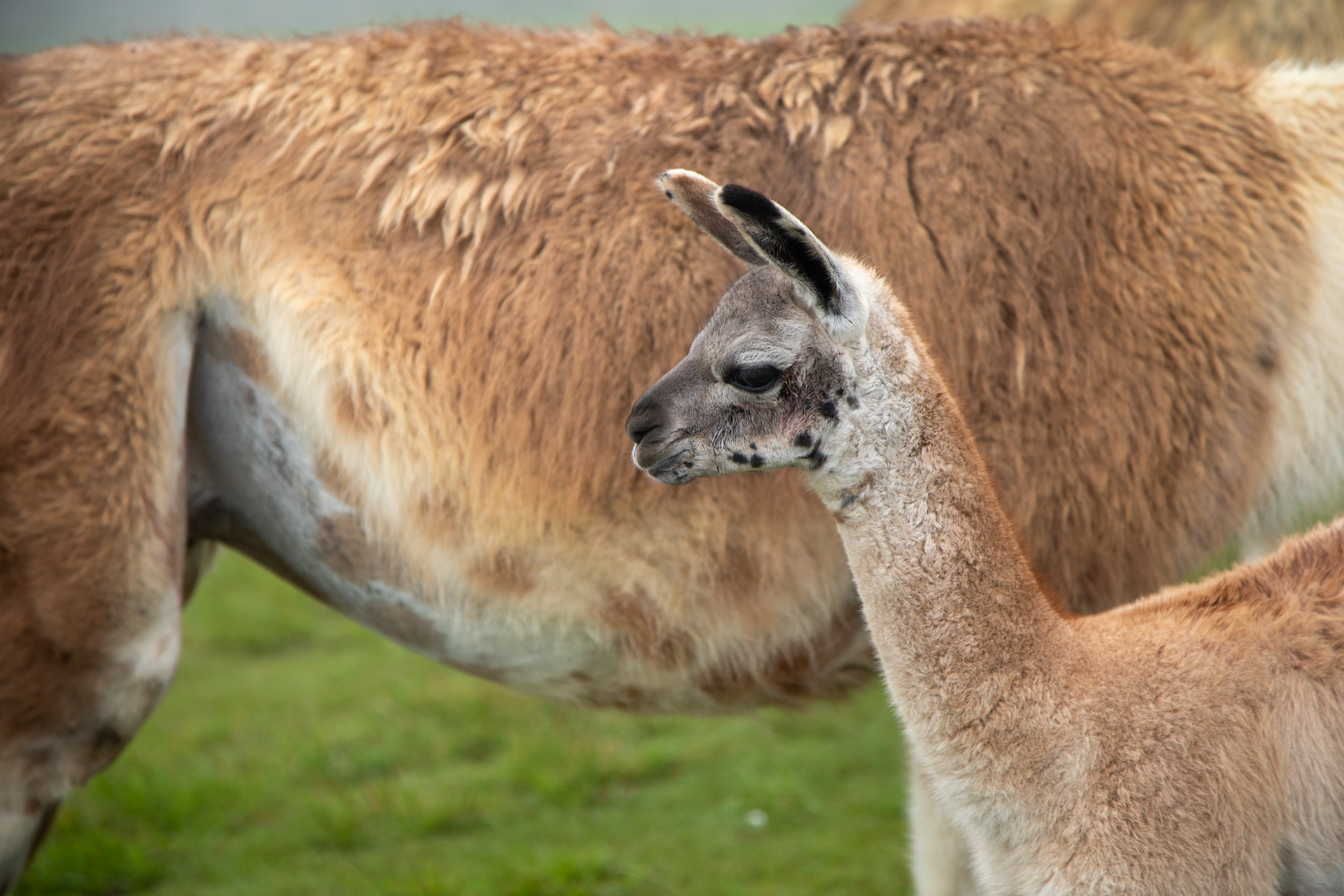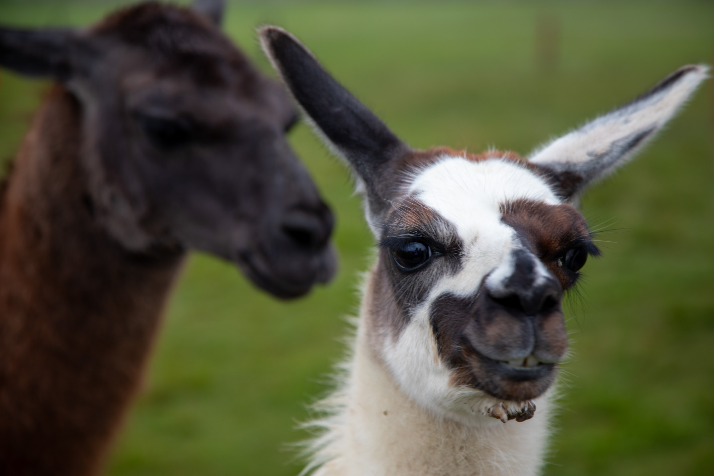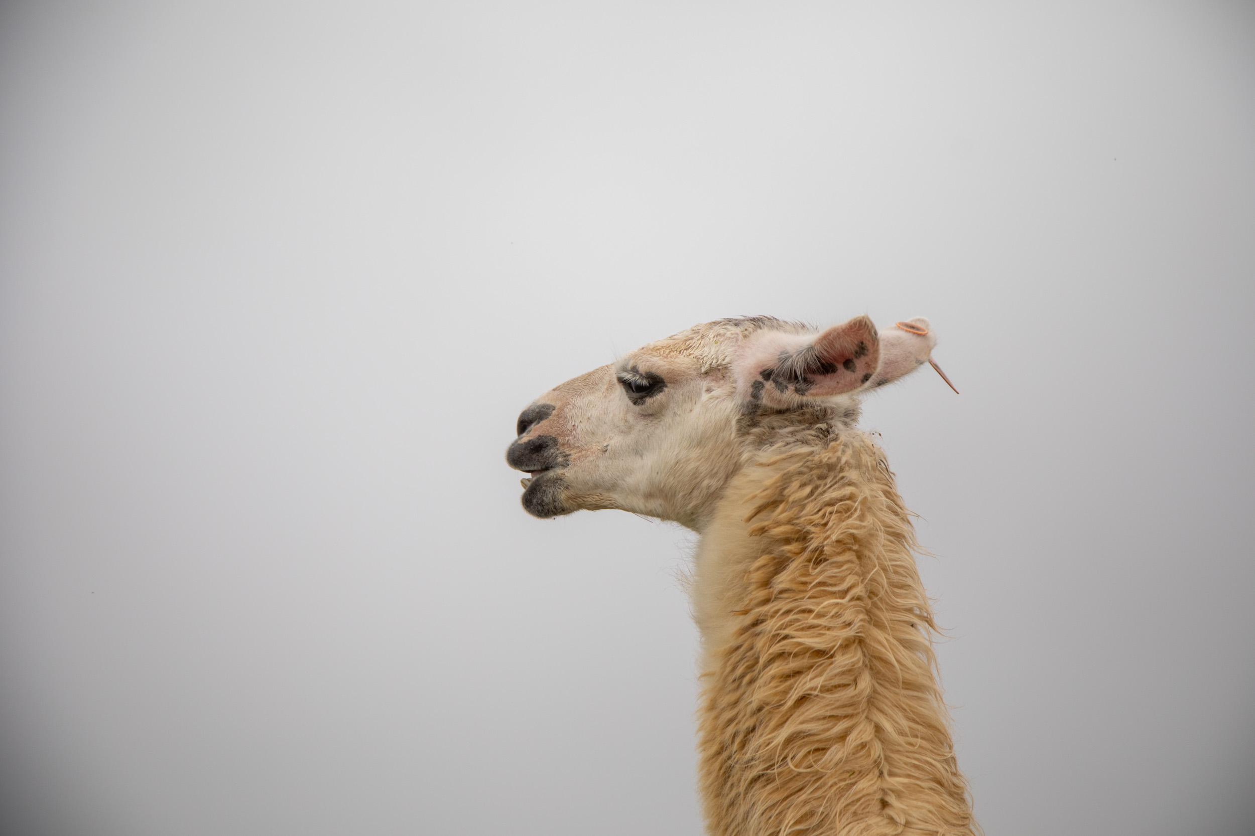 On décide de rester sur l’esplanade en attendant que la brume s’en aille. Un des lamas est installé en face de la vue et captive notre attention. Il rumine l’herbe qu’il a mangé et ne semble pas du tout incommodé par notre présence, bien au contraire, il reste tranquille à mastiquer tout en se laissant caresser, bichonner.