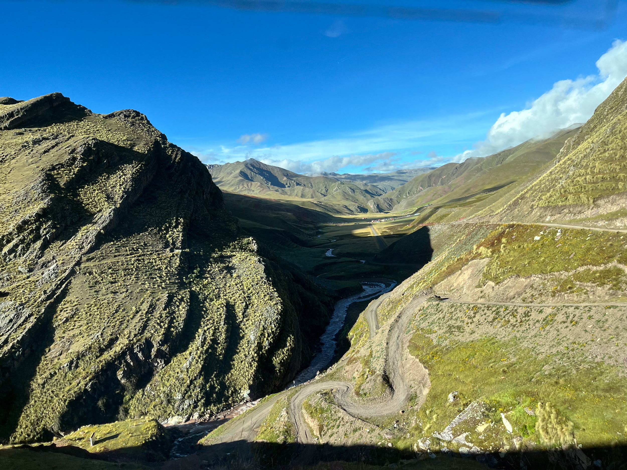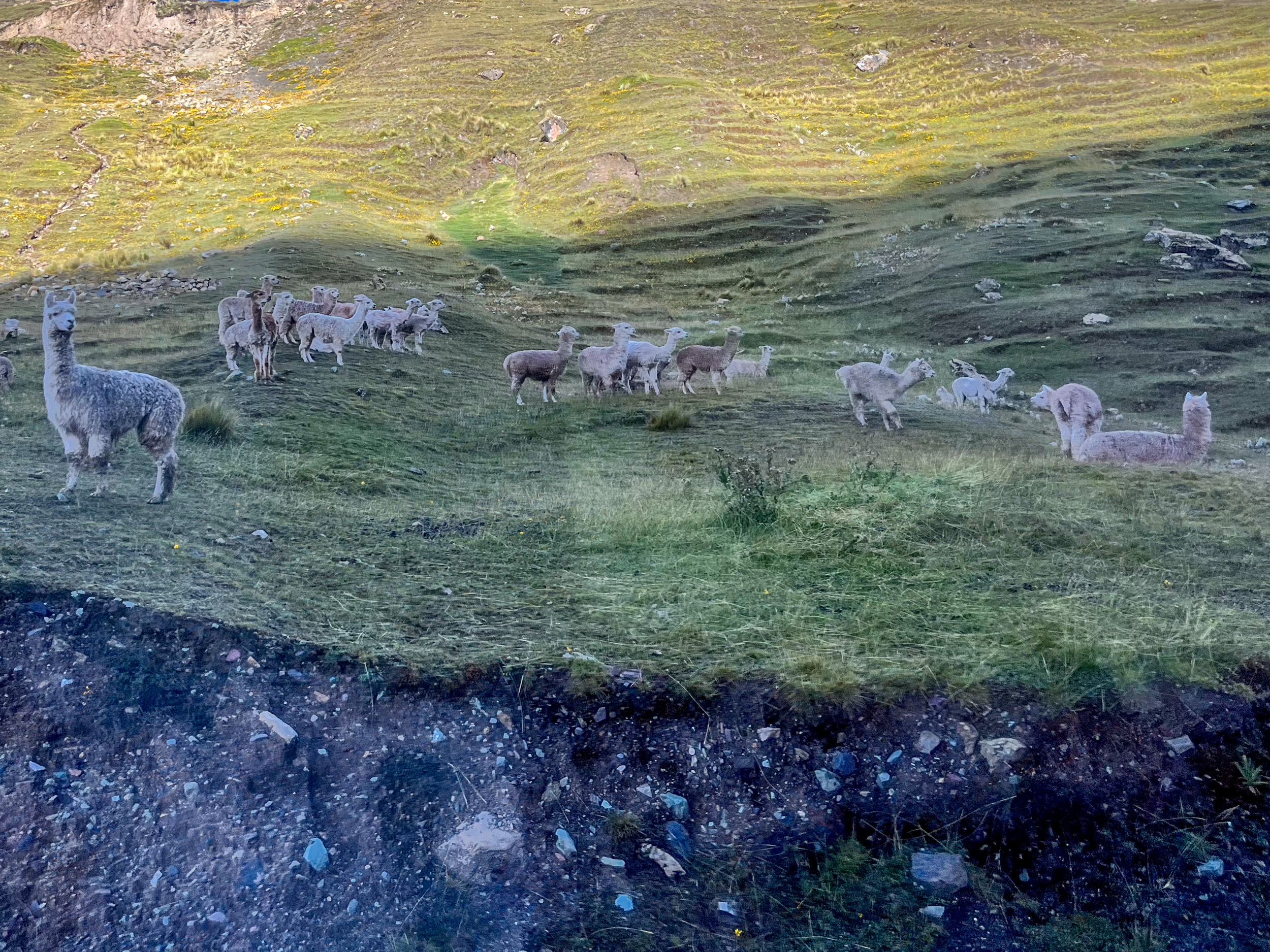 On fait une pause avant de faire les dernières minutes de route, on est à plus de 4500m d’altitude, l’air se fait rare, il faut bouger lentement pour ne pas perdre son souffle. Un paysan fait paitre ses lamas sur la pente herbeuse de la montagne