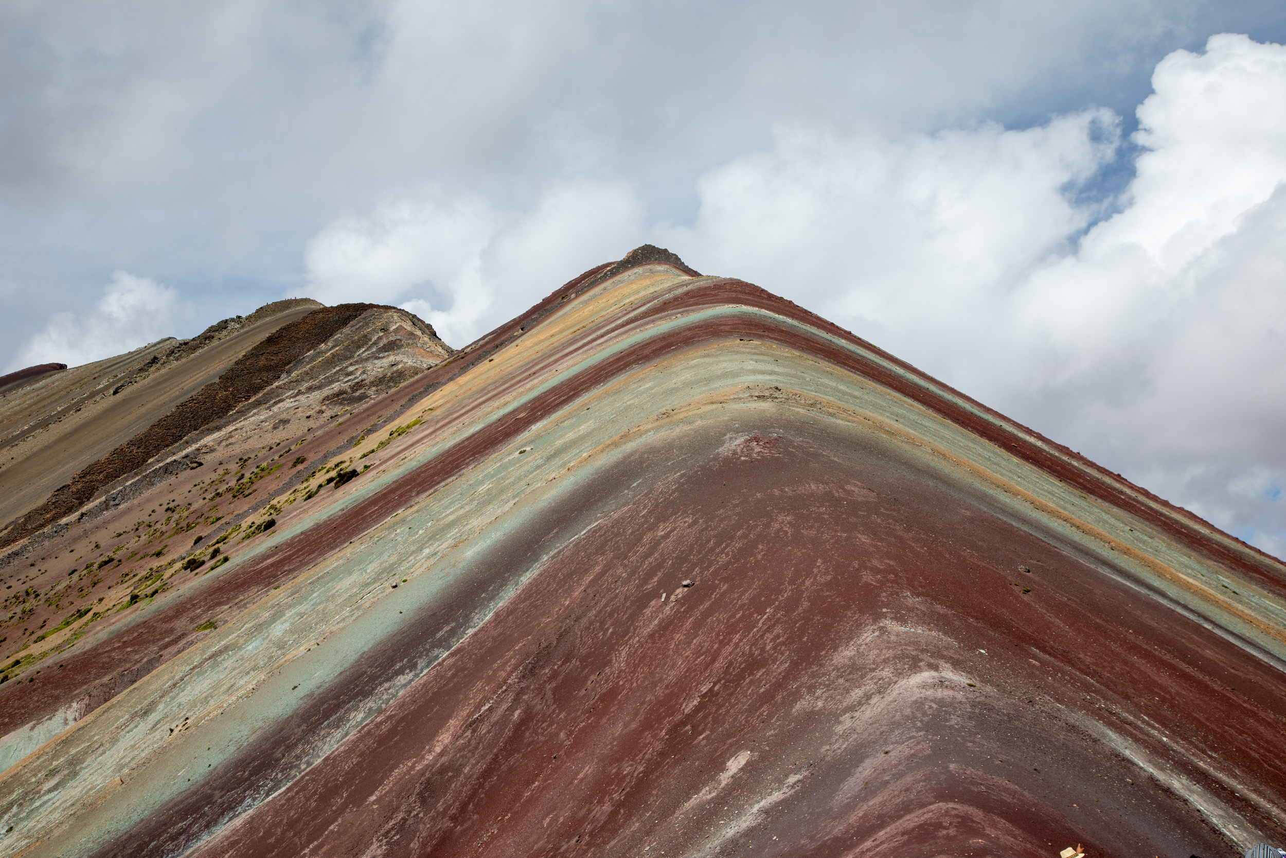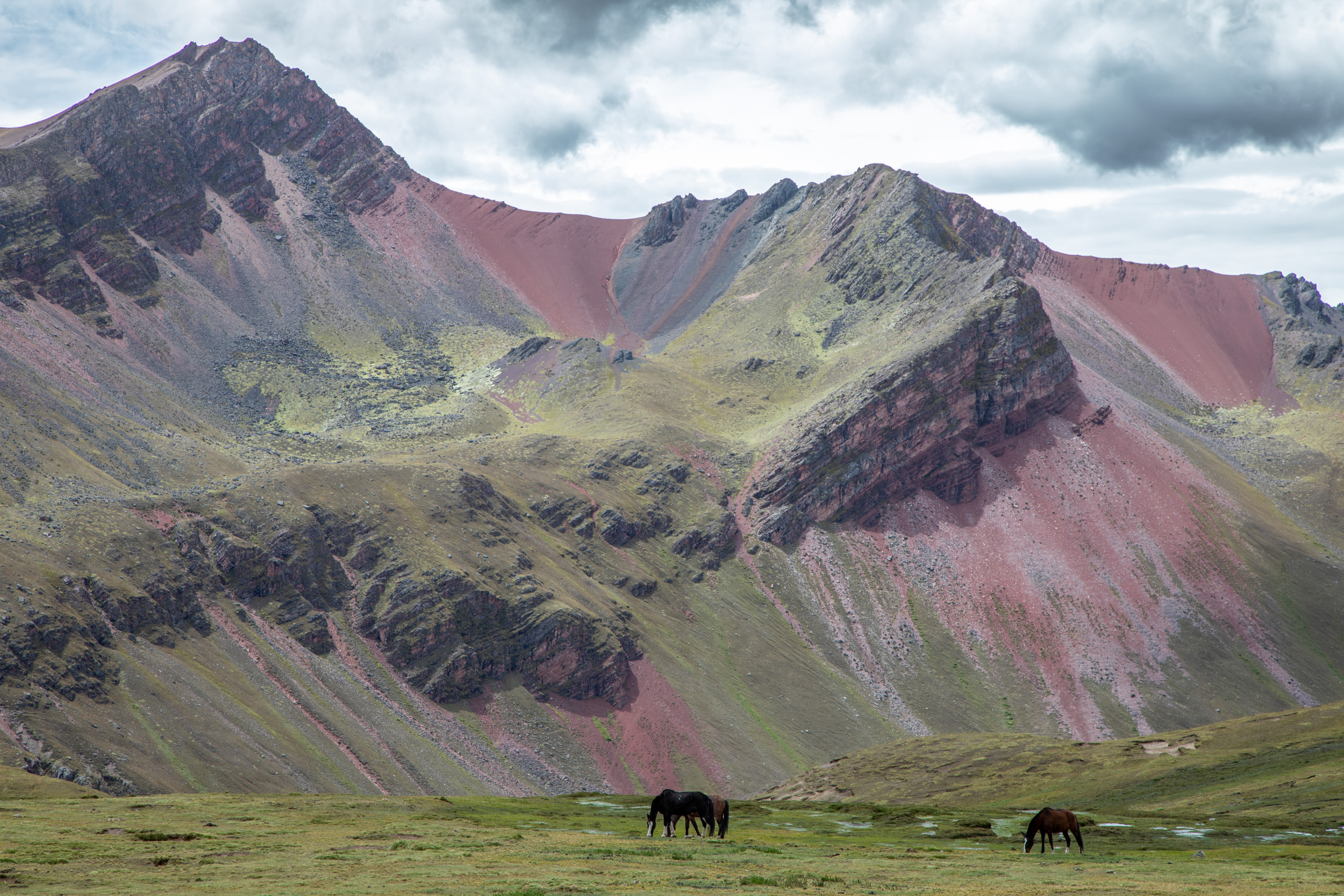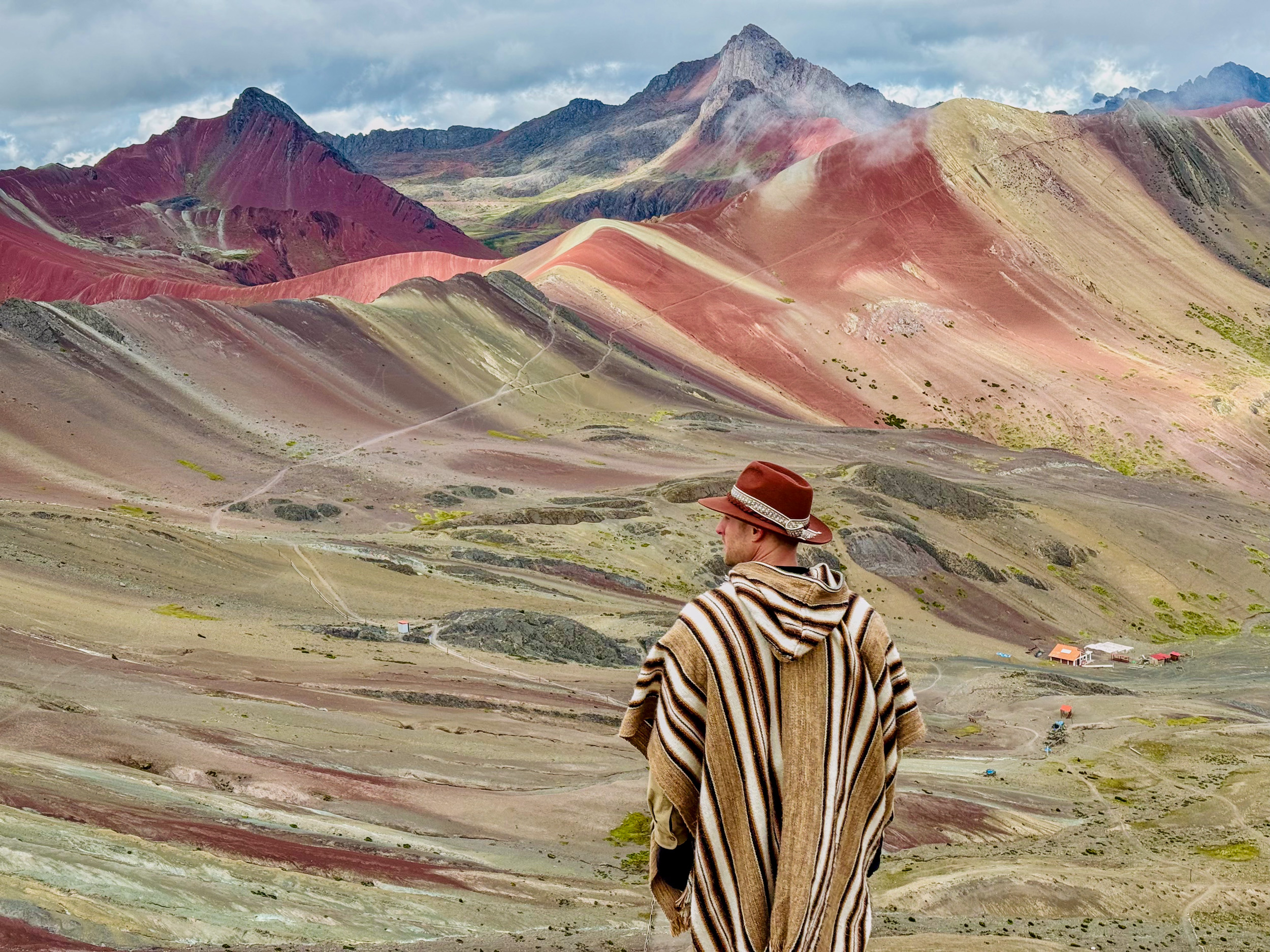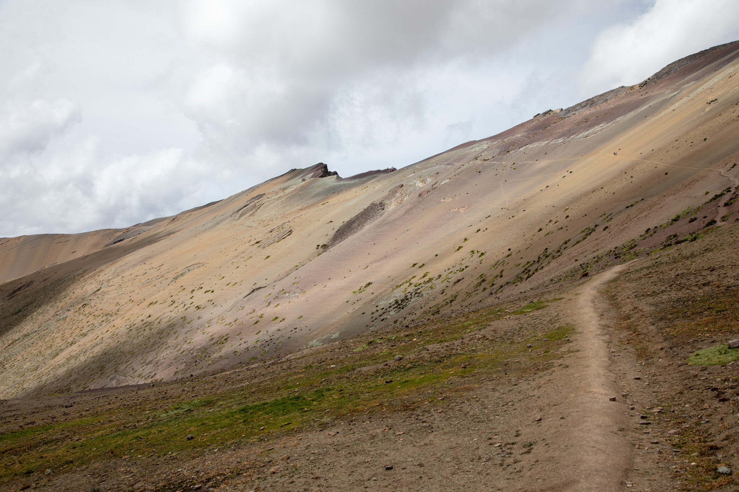 Avant de venir à Vinicunca, on se demandait si la montagne avait vraiment cette couleur arc en ciel ou c'était plutôt le résultat des filtres sur le téléphone. Alors en fait, il faut savoir que la couleur est vraiment intense, bien sur moins intense que sur les photos sur saturées, mais c'est quand même très coloré. L'élément le plus important néanmoins pour avoir une image très colorée est d'avoir un bon rayon de soleil, sinon effectivement c'est plutôt terne. Voici deux fois la même image, une sans filtre et une avec le filtre pour faire ressortir les lumières.