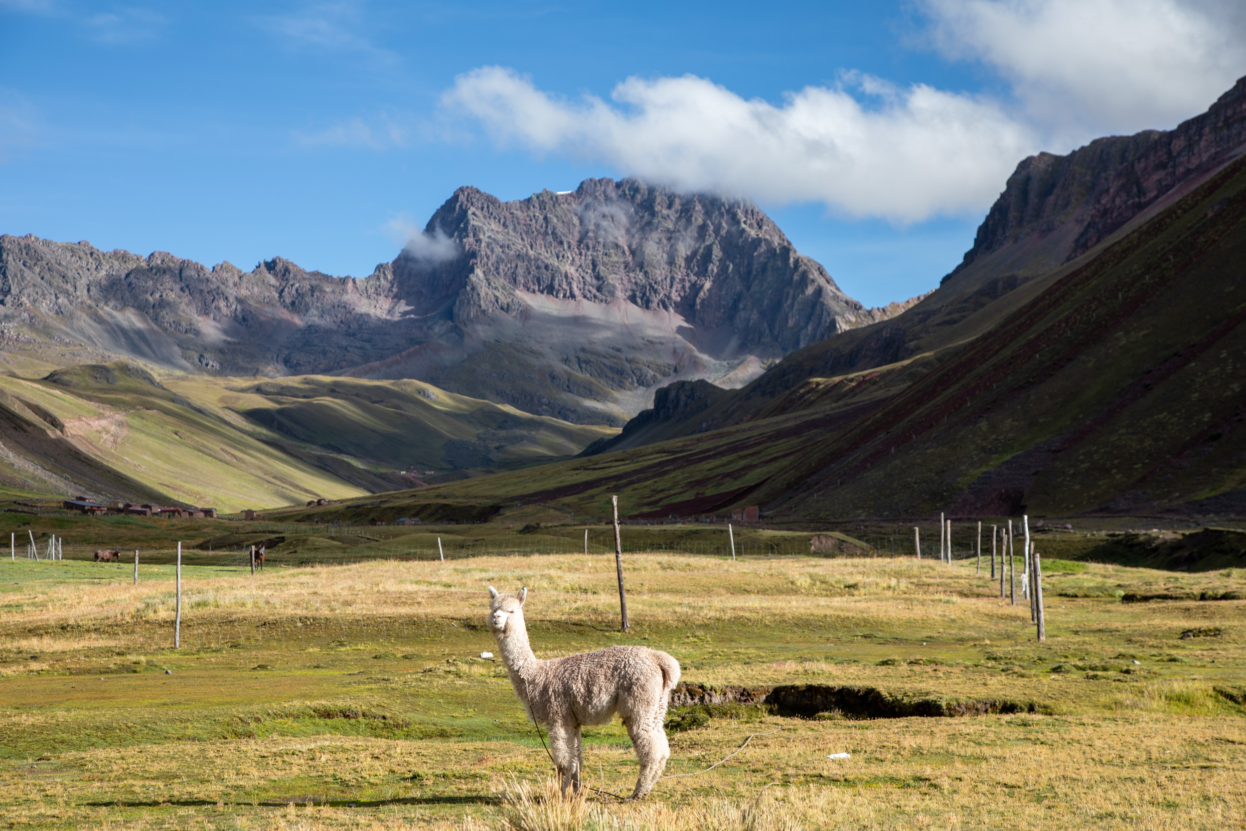 Un lama pose face à ce décor grandiose, une vallée entourée de pics rocheux impressionnants. Les gros nuages créent de gros pavés d'ombres sombre sur l'herbe.