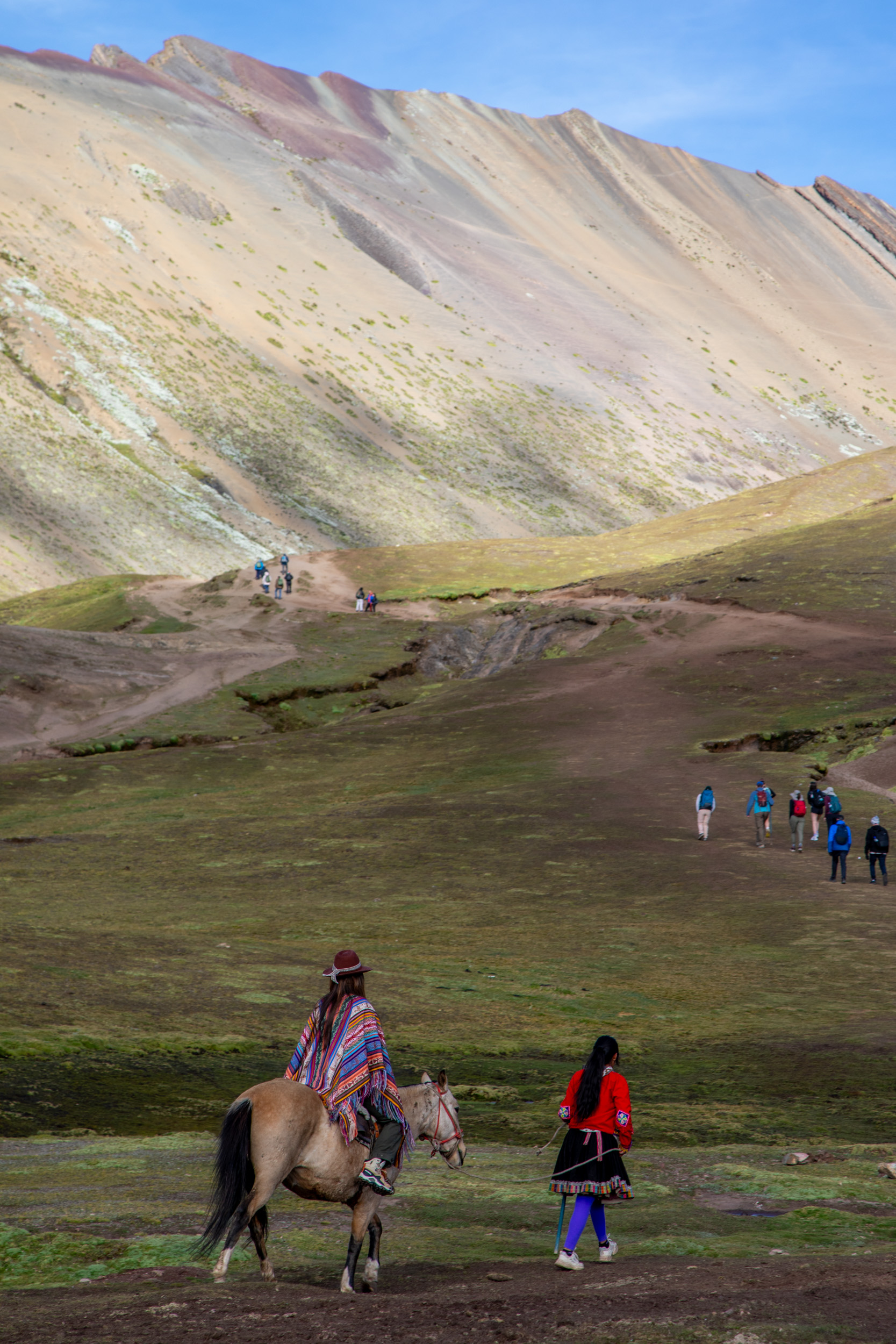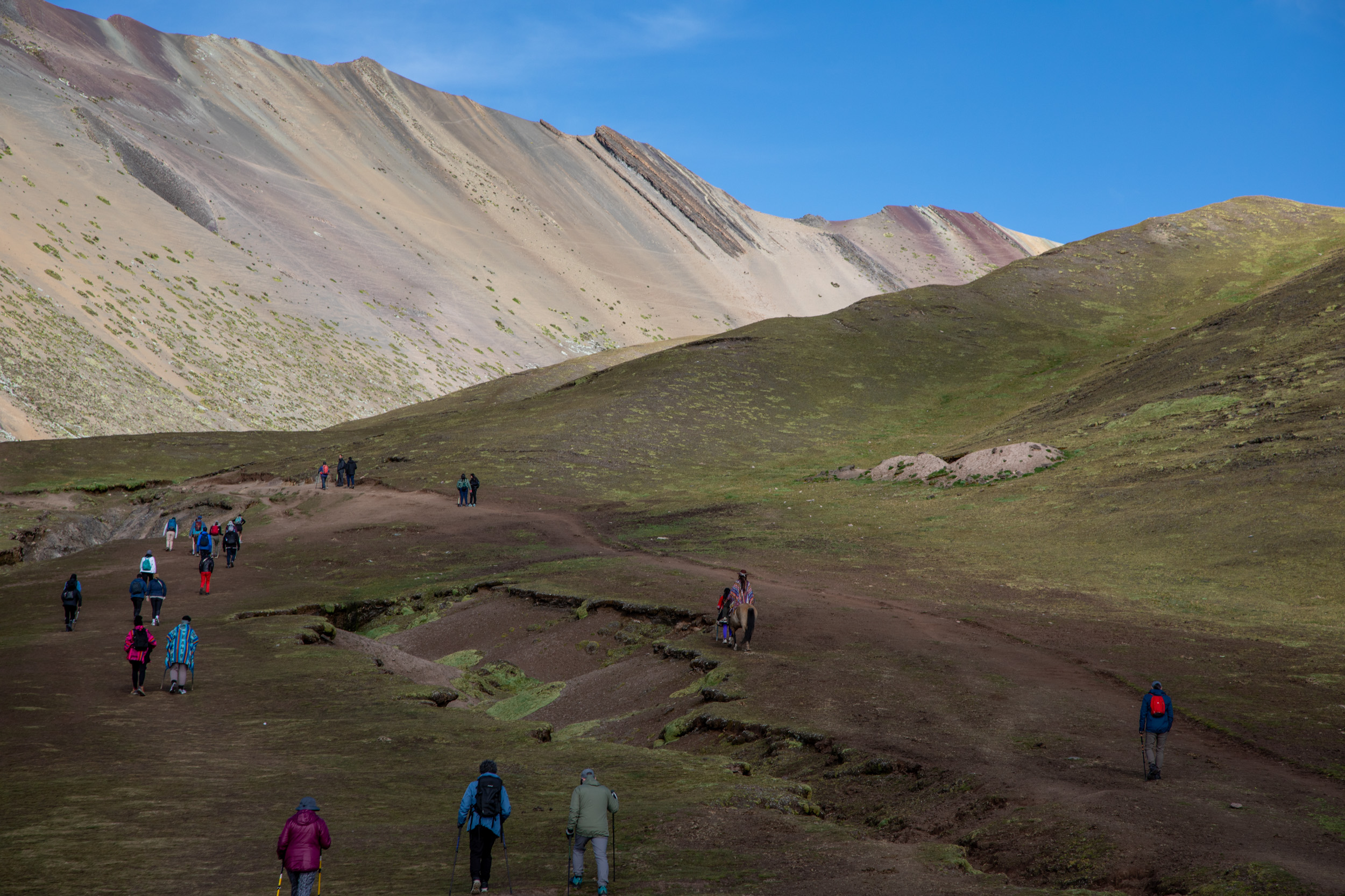 Allez, on remonte pour les derniers kilomètres! On arrive sur un grand parking qui accueille les bus de tourisme. Vinicunca est devenue une des attractions touristiques les plus courues du Pérou, et il faut de la place pour accueillir tout le monde, chaque jour. Ma copine ne se sent pas de faire les 40 minutes de marche jusqu’au sommet à 5000m d’altitude. Elle préfère monter à cheval et conserver son énergie pour les derniers mètres bien plus raides.