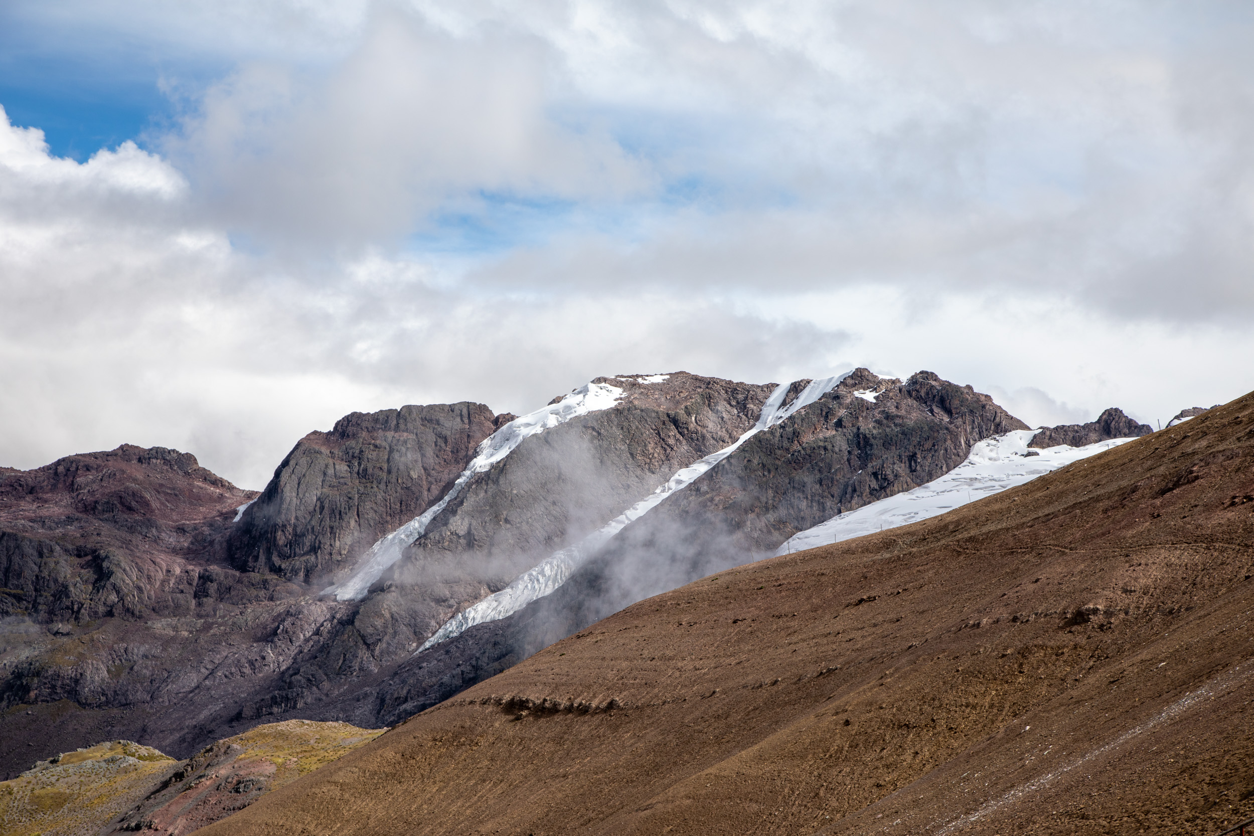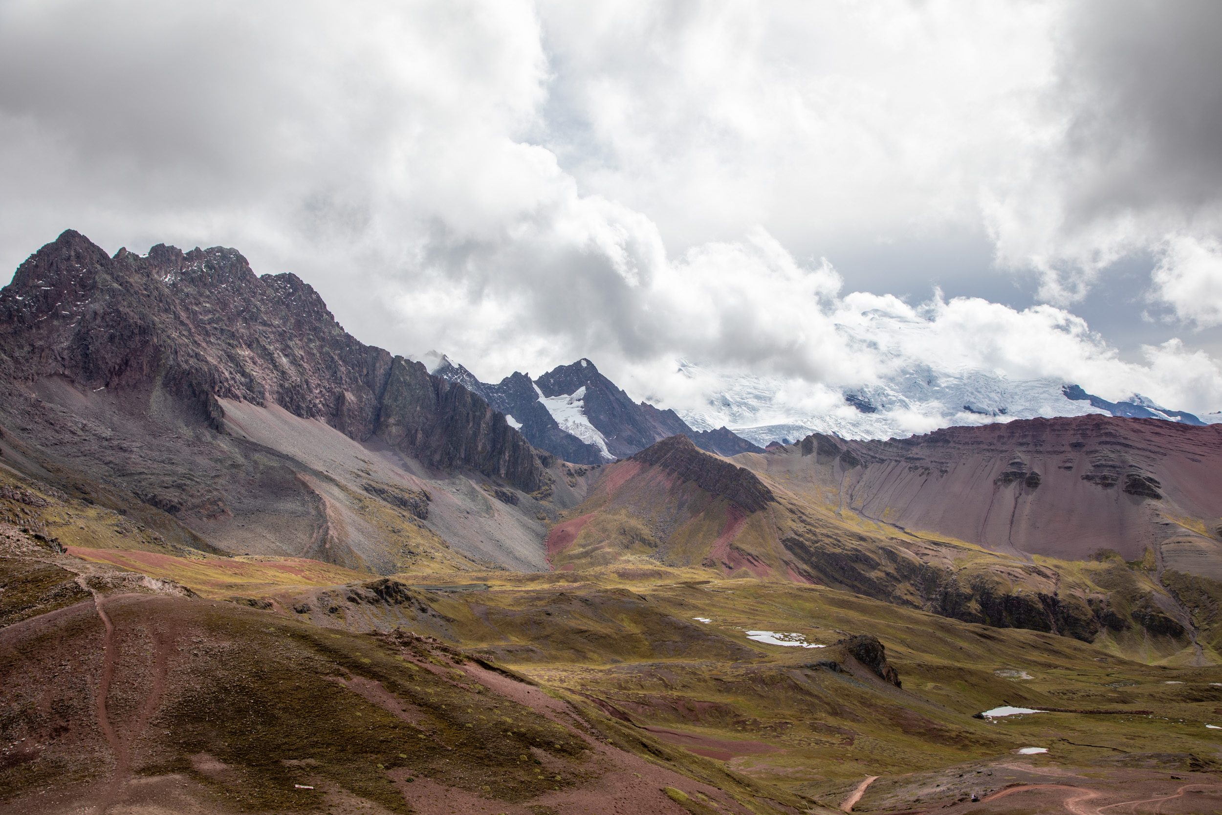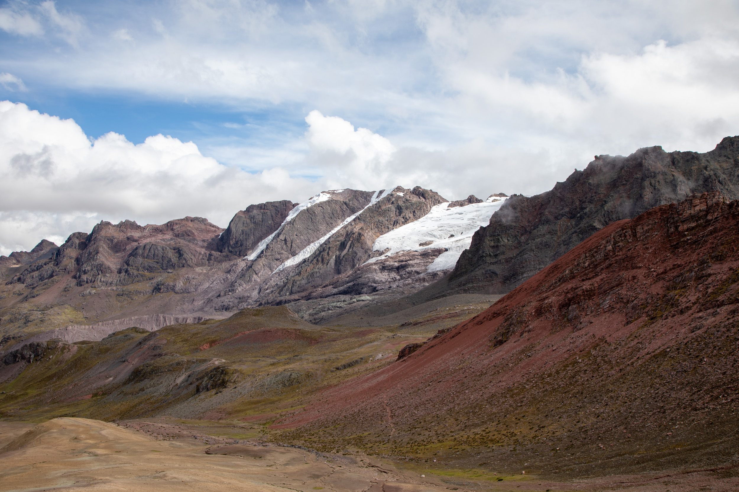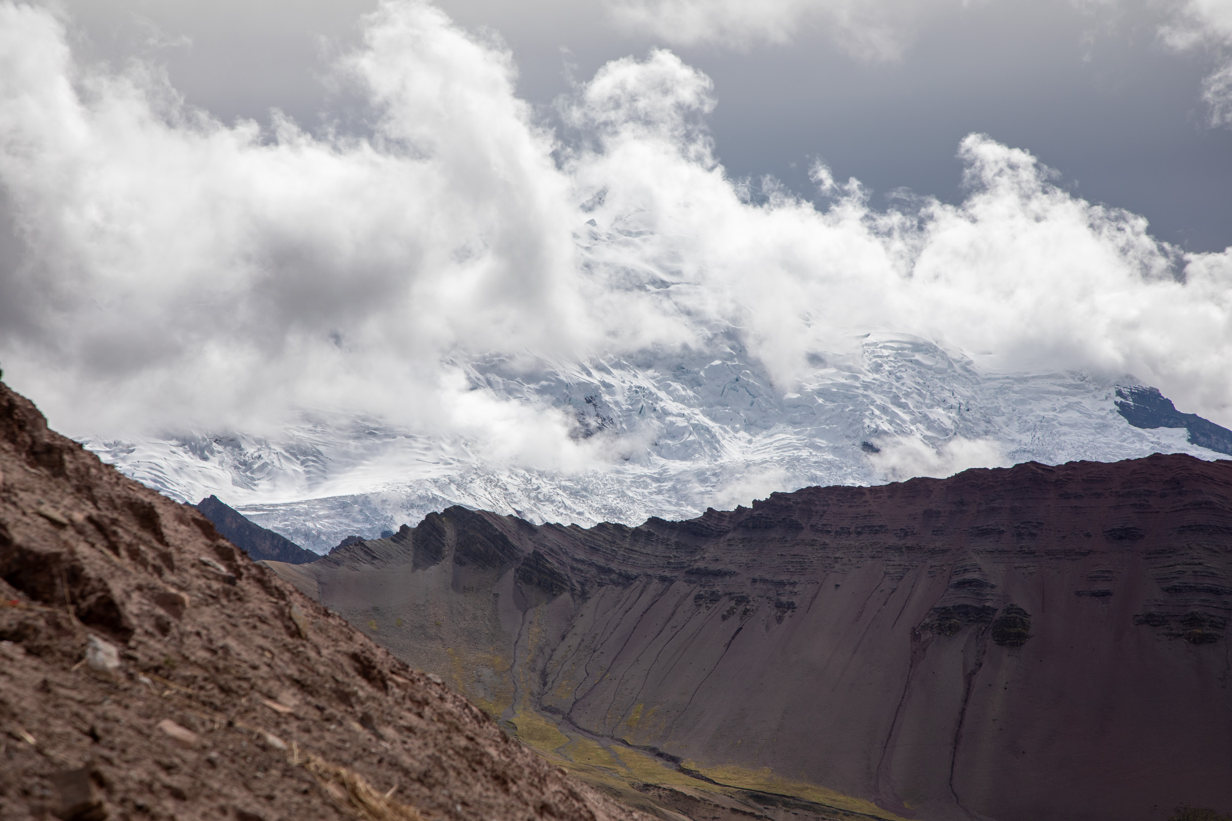 Le glacier est masqué par la couche de nuage qui s'accumule, quel paysage incroyable. On pensait que Vinicunca était surtout réputé pour sa montagne arc en ciel mais c'est en fait toute la zone qui est spectaculaire avec un paysage de haute montagne accessible plutôt facilement depuis Cusco.
