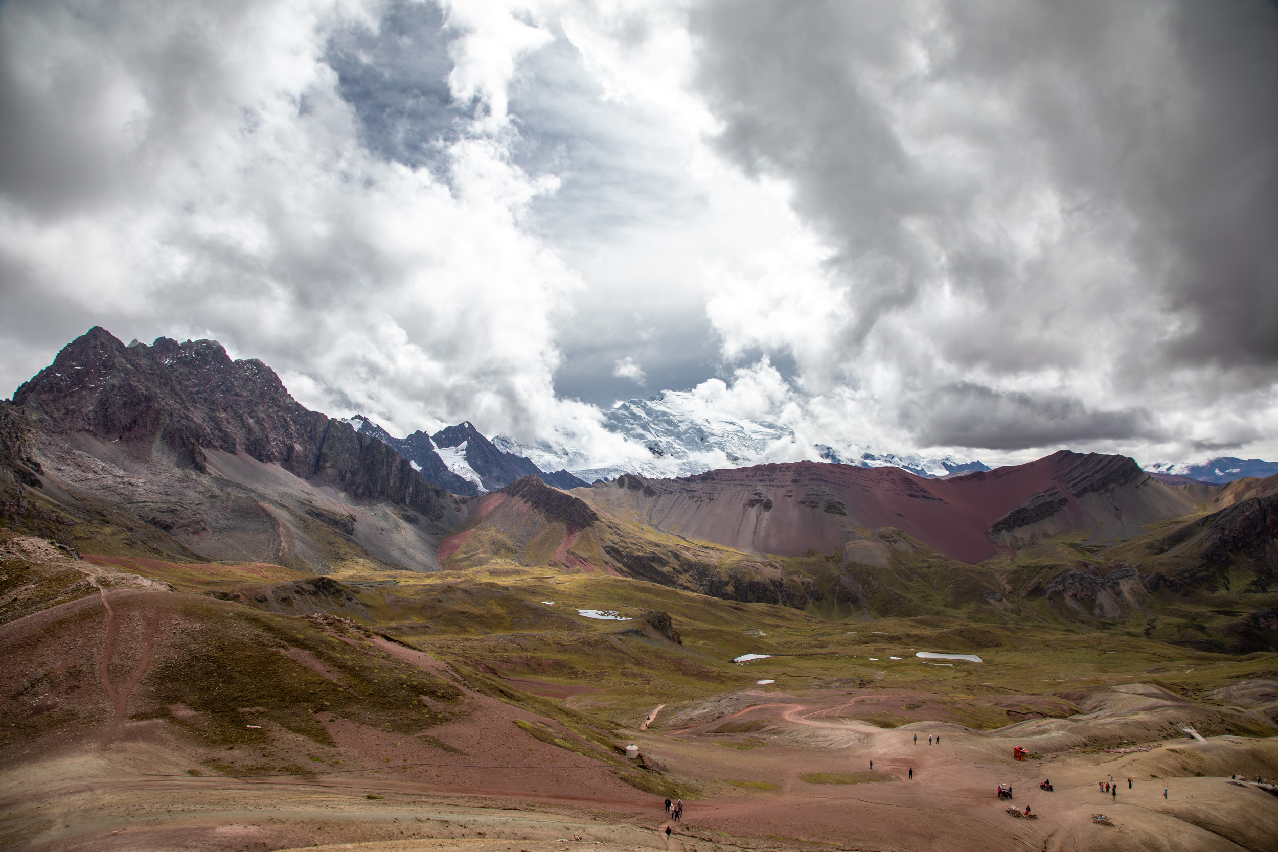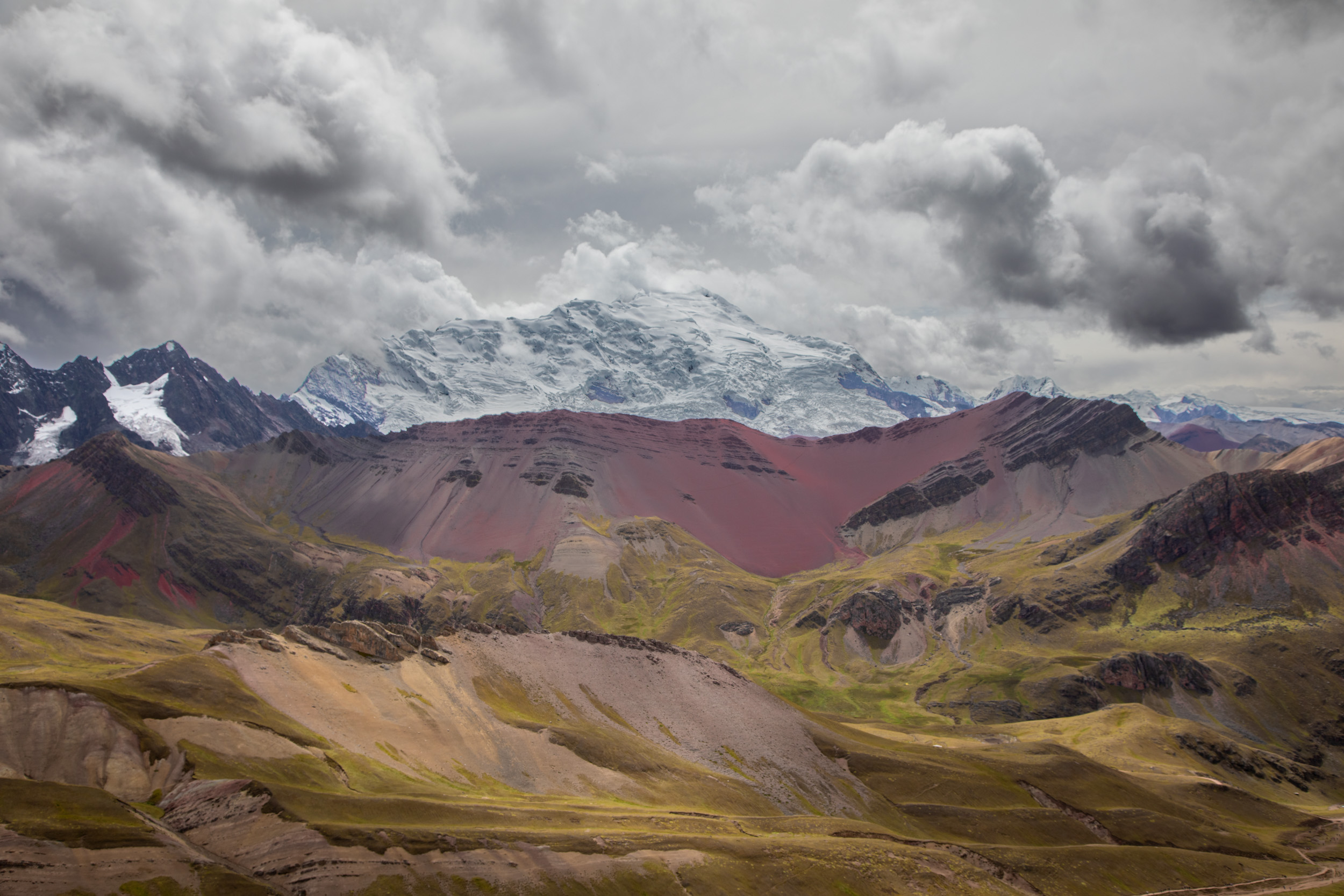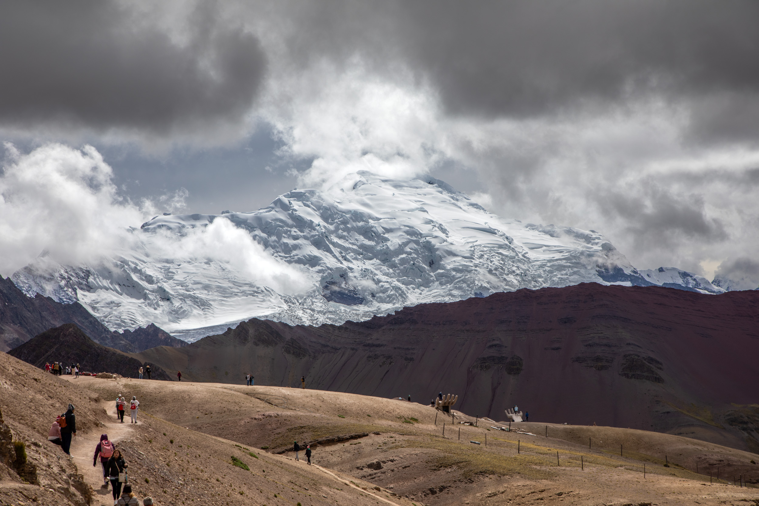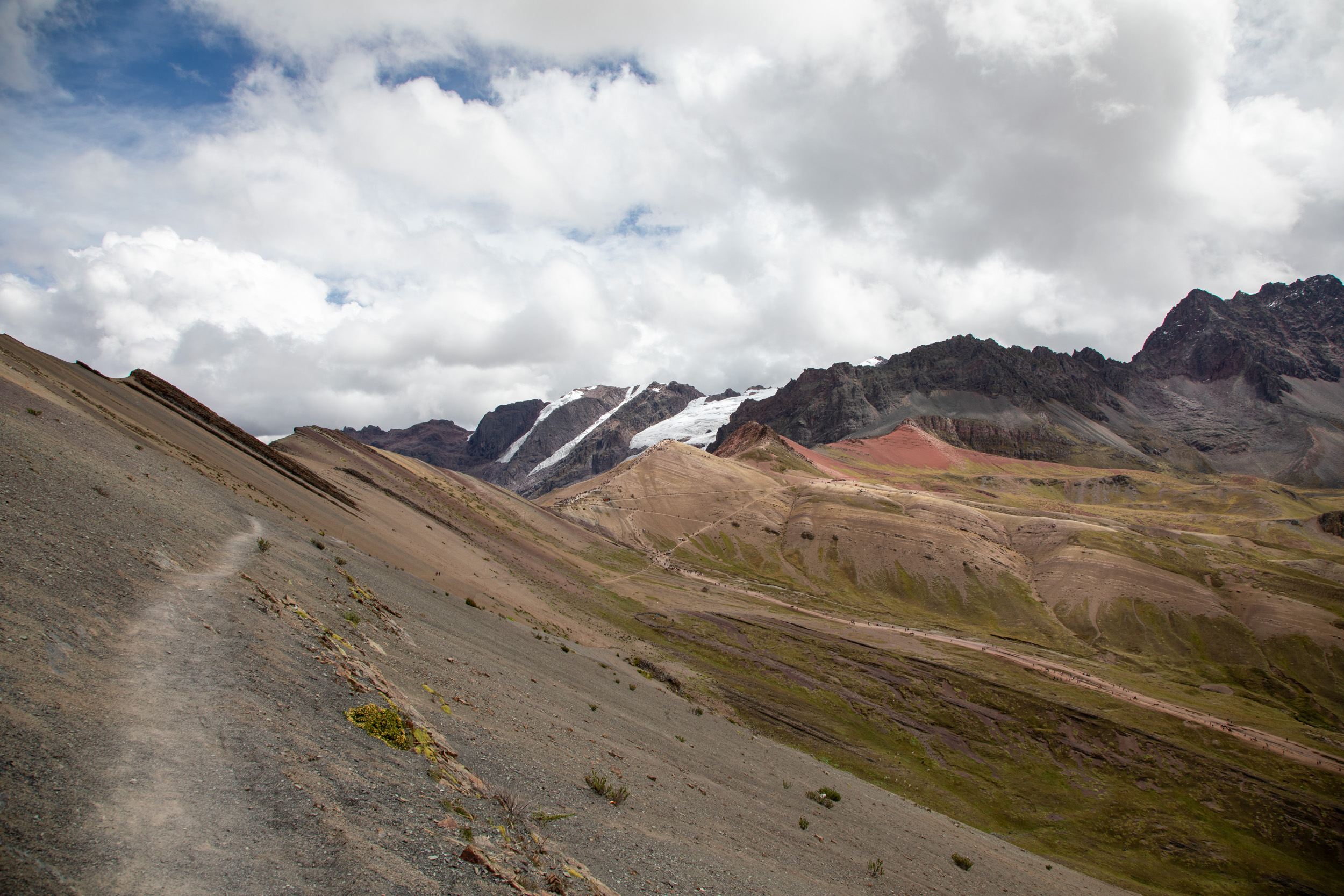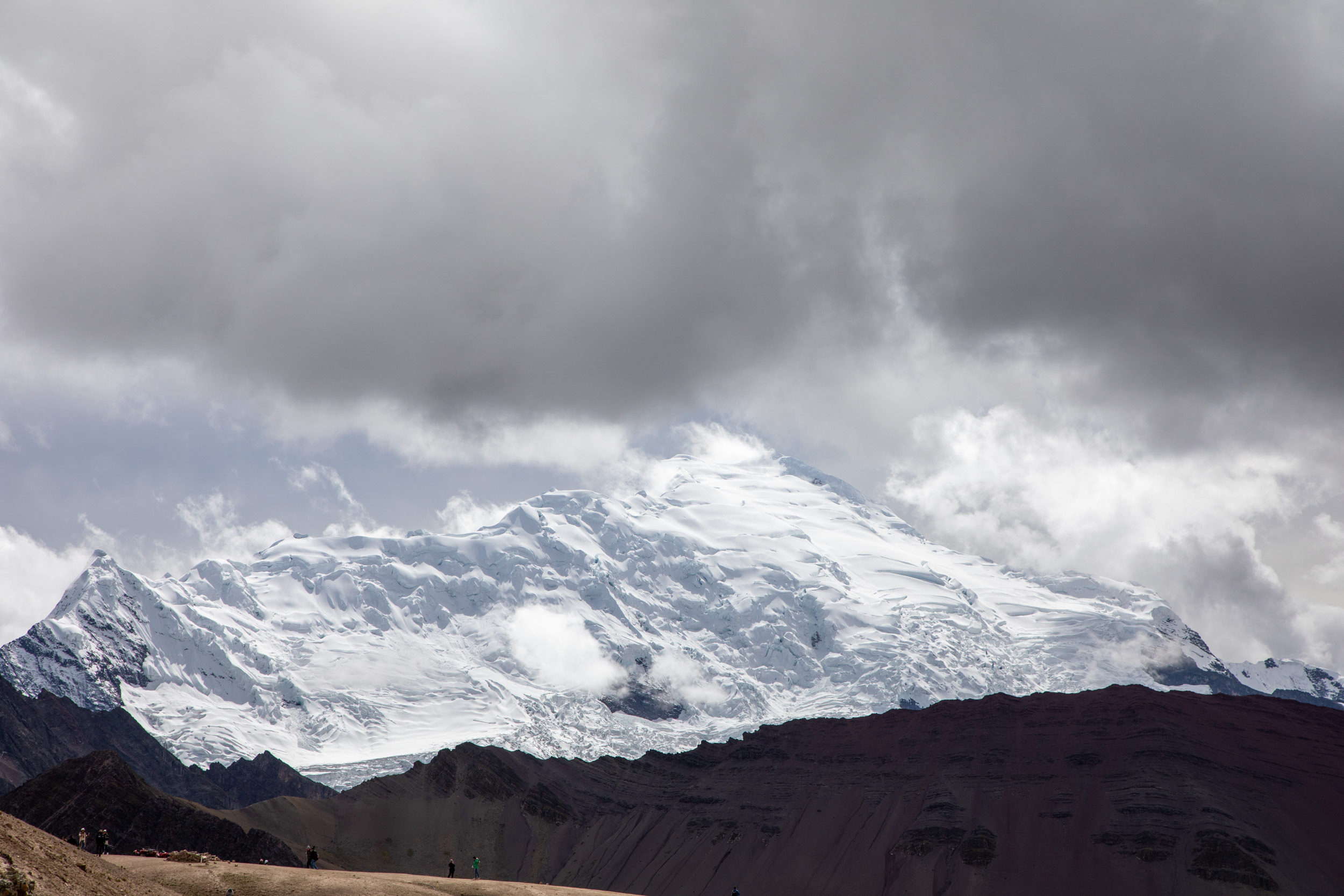 Le glacier est masqué par la couche de nuage qui s'accumule, quel paysage incroyable. On pensait que Vinicunca était surtout réputé pour sa montagne arc en ciel mais c'est en fait toute la zone qui est spectaculaire avec un paysage de haute montagne accessible plutôt facilement depuis Cusco.