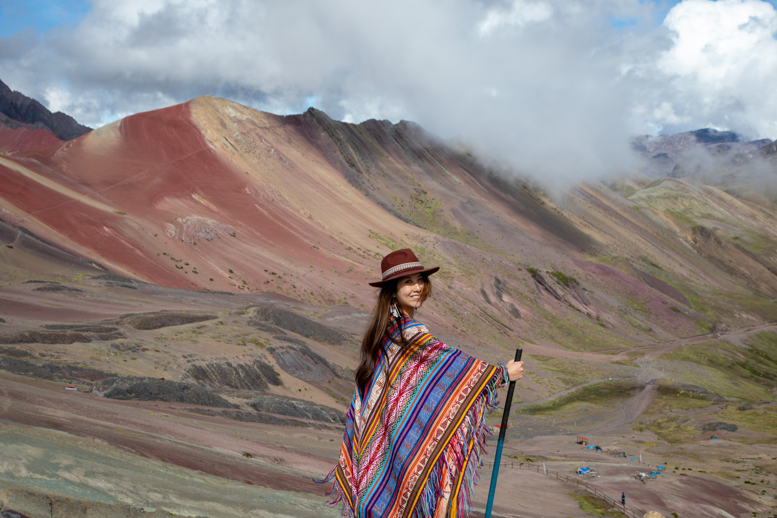 Le paysage autour de la montagne arc en ciel est vraiment magnifique, avec des vallées rougeâtres, des cimes enneigées et glaciers.