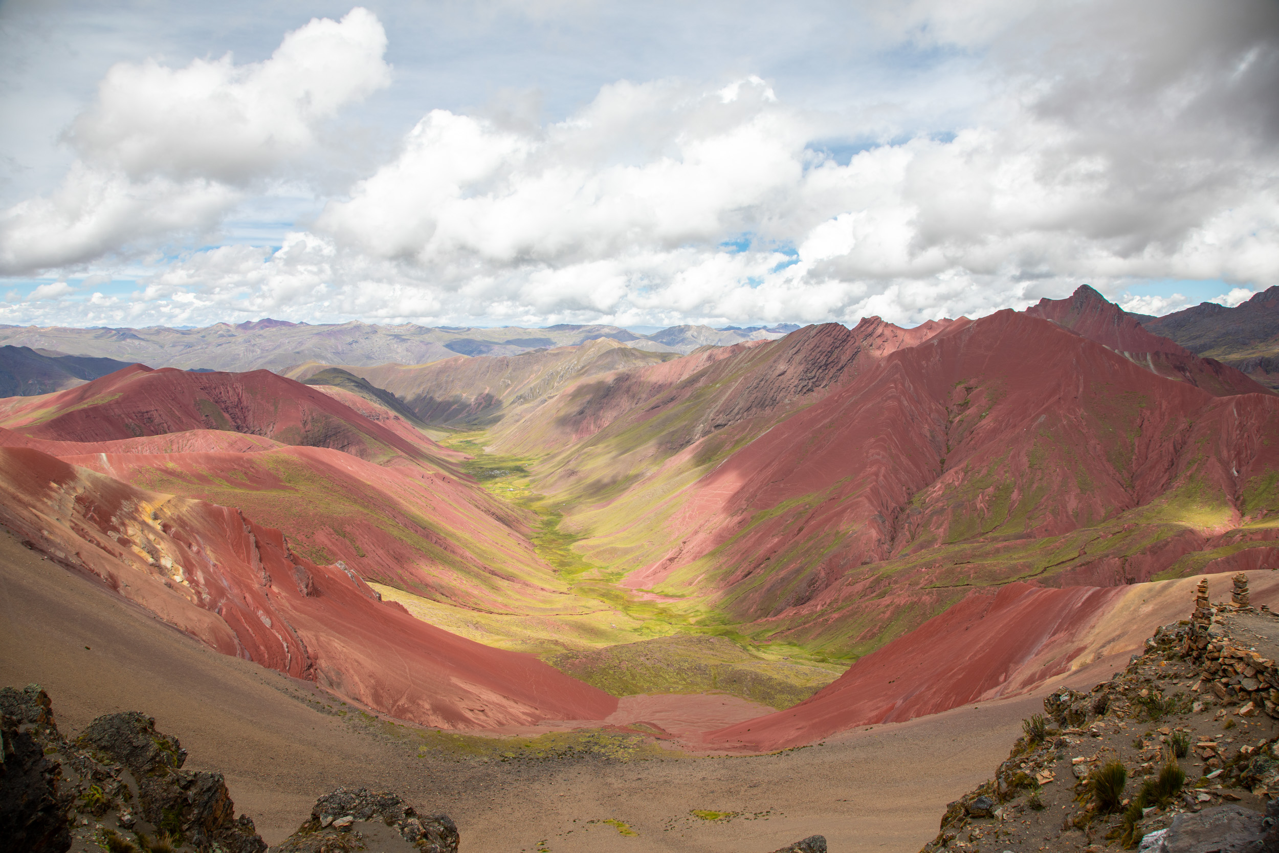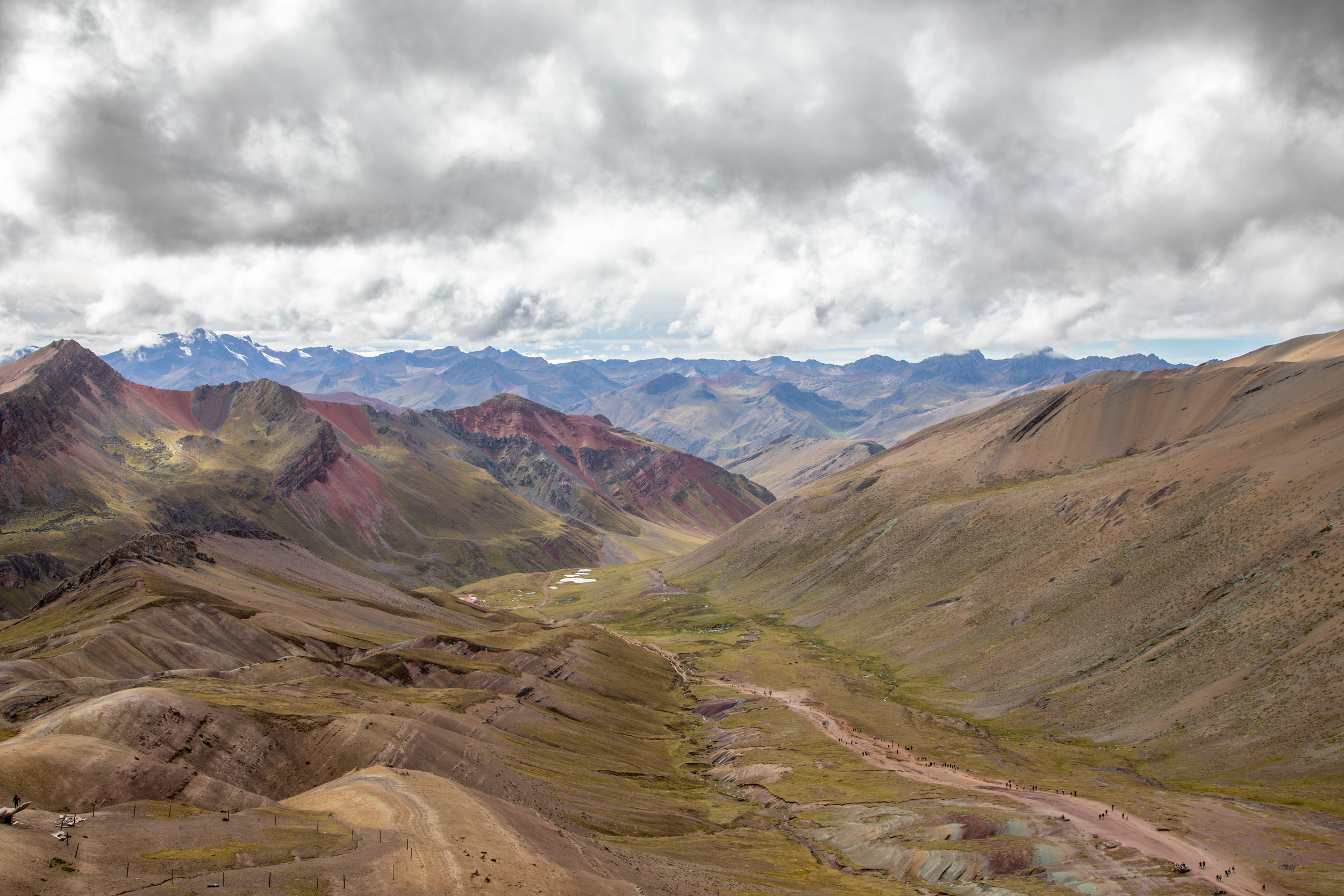 On reste en tout cas stupéfait par la beauté du paysage de Vinicunca. Malgré les avertissements que cet endroit est devenu très touristique, cela reste tout à fait acceptable. Surtout en venant le matin. En plus le matin tôt on a eu une meilleure météo, les nuages s’accumulent au fur et à mesure de la matinée et finalement il se met à pleuvoir en début d’après midi. On comprend pourquoi les bus partent à 4h de Cusco pour avoir le meilleur temps. La visite de Vinicunca a été un moment fort de notre voyage au Pérou, les paysages nous ont vraiment impressionné, on comprend vraiment pourquoi c’est devenu un incontournable. Au delà de la montagne arc en ciel, toute la zone est superbe et marcher à cette altitude est une belle épreuve.