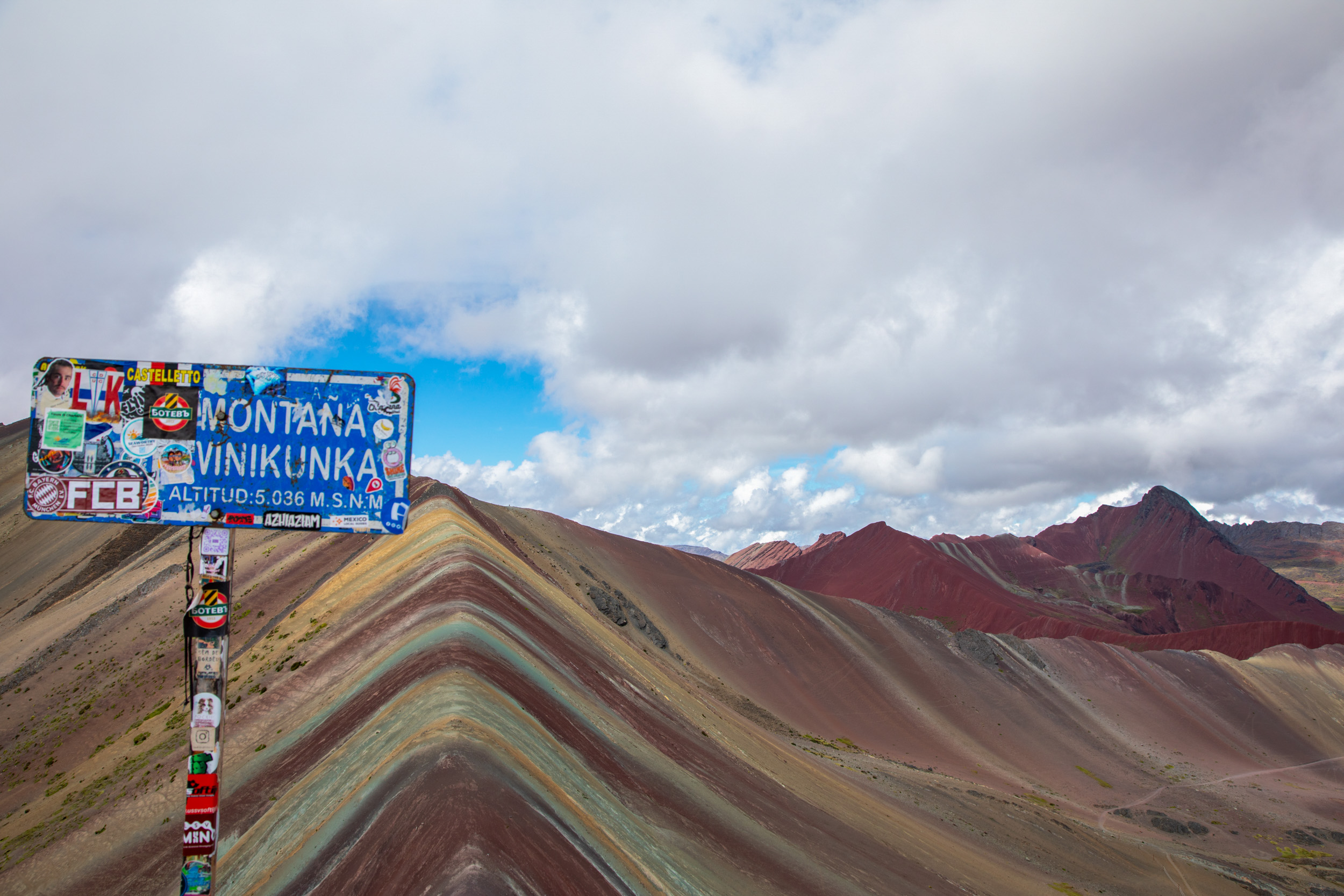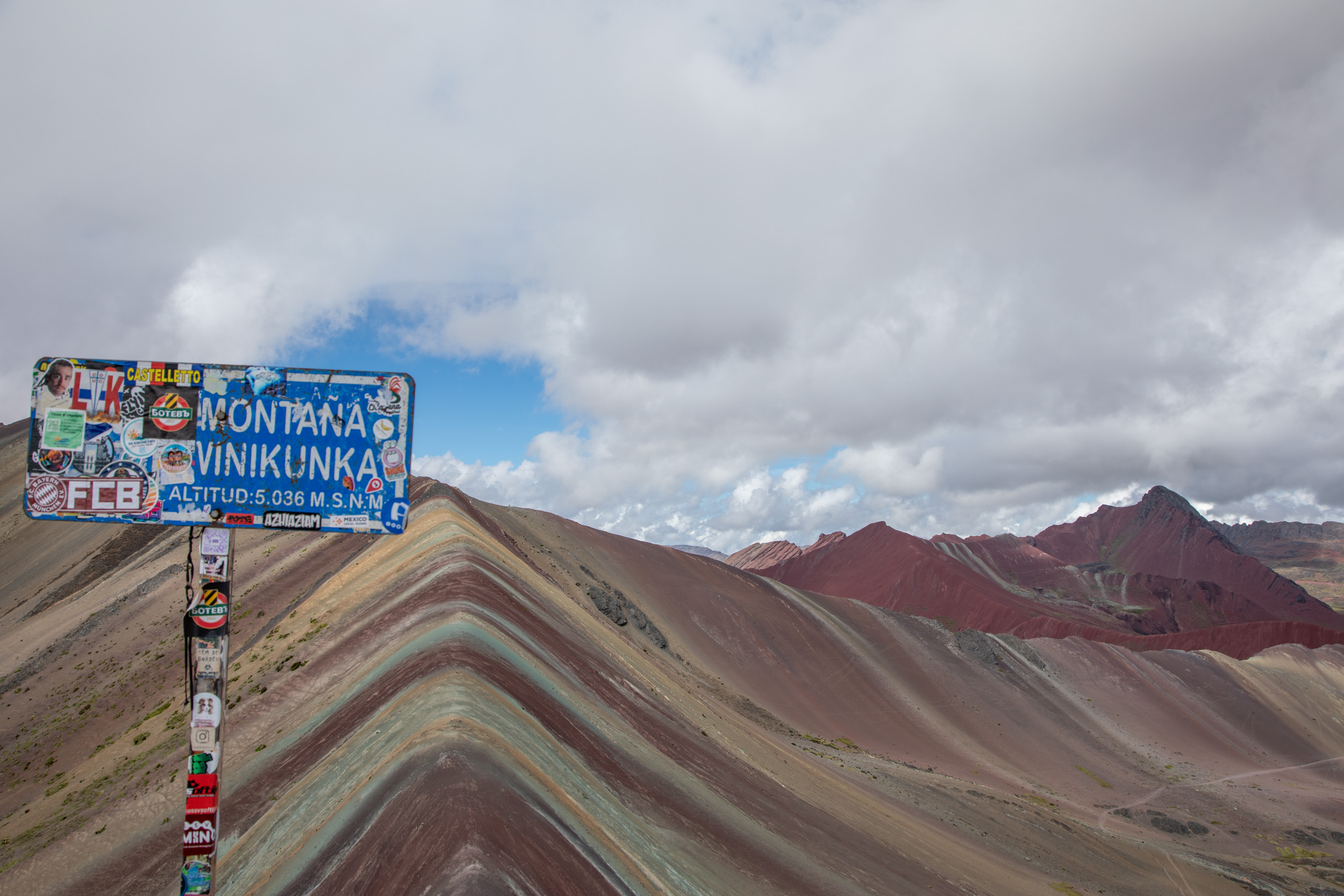 On peut monter jusqu’à la plateforme la plus haute, avec le panneau qui indique l’altitude : 5030m. On le ressent clairement mais une vue plus plongeante sur la montagne et ses couleurs.