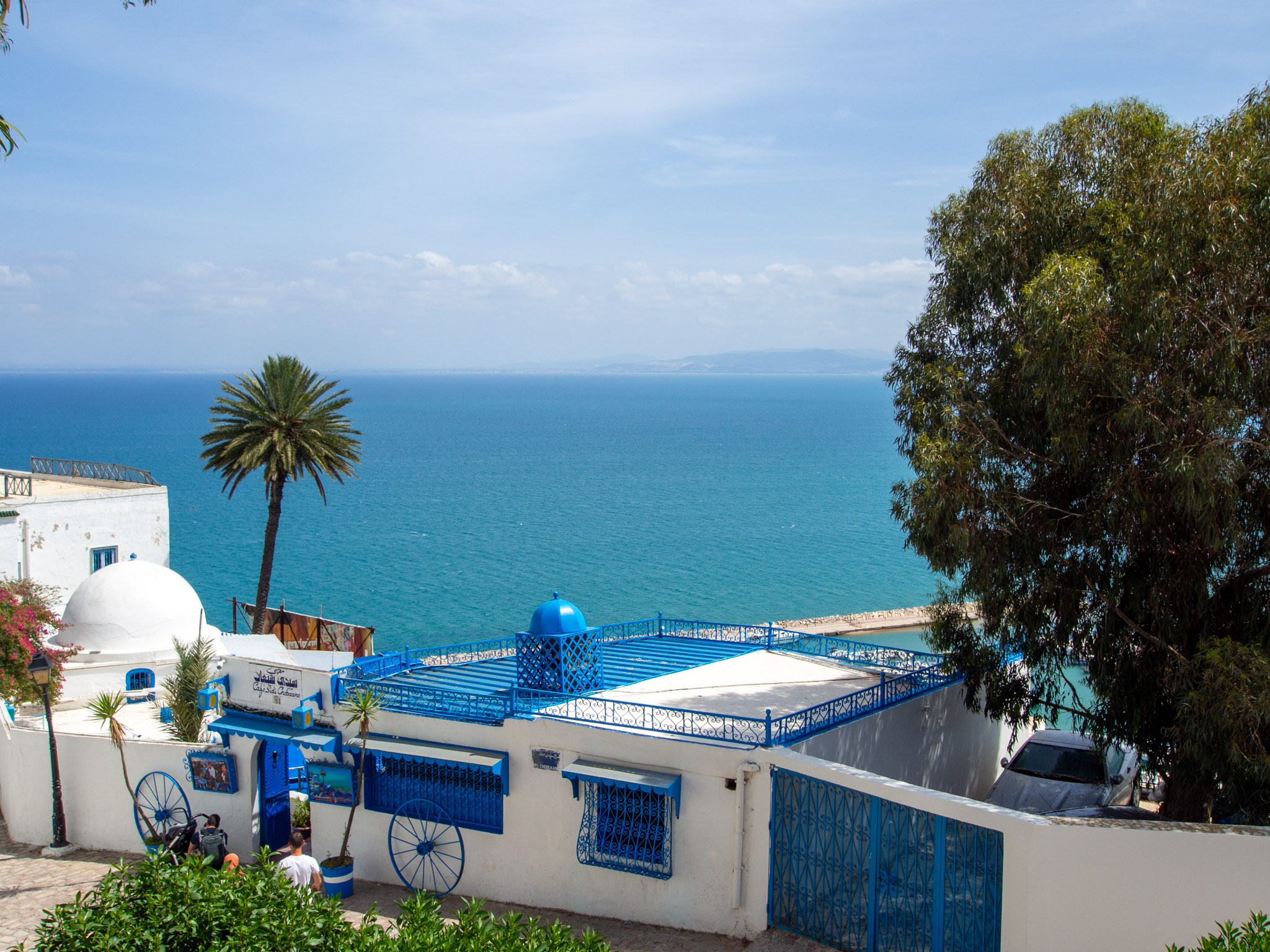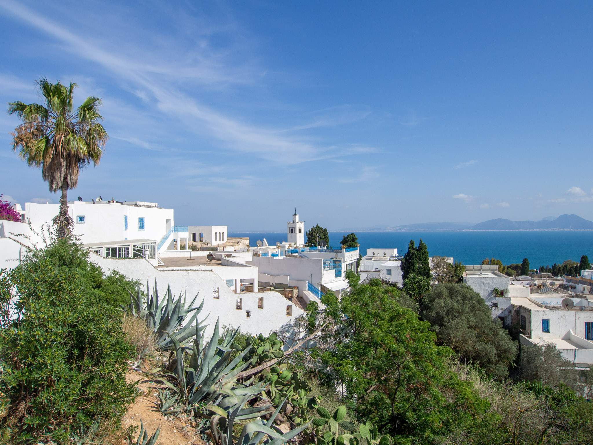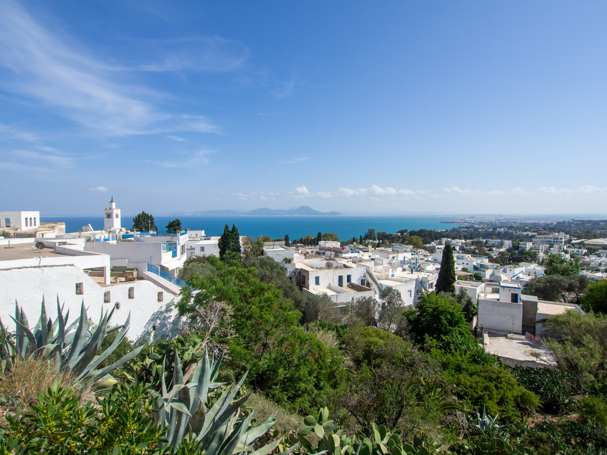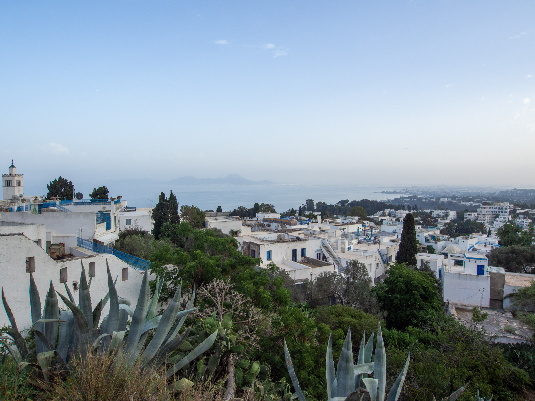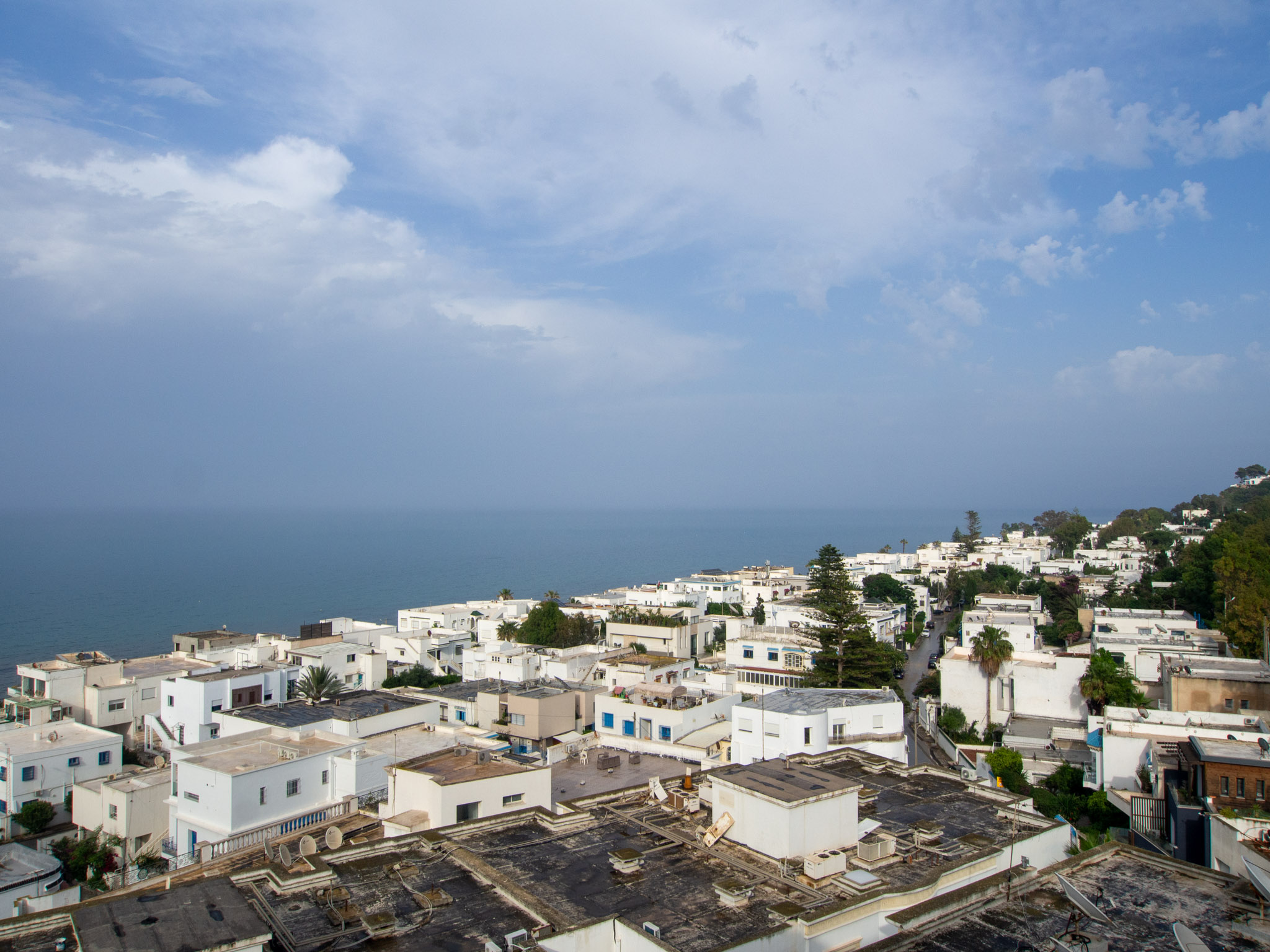 Depuis le haut du village, on domine les toits blancs et la mer, on peut même apercevoir les immeubles de Tunis au loin.